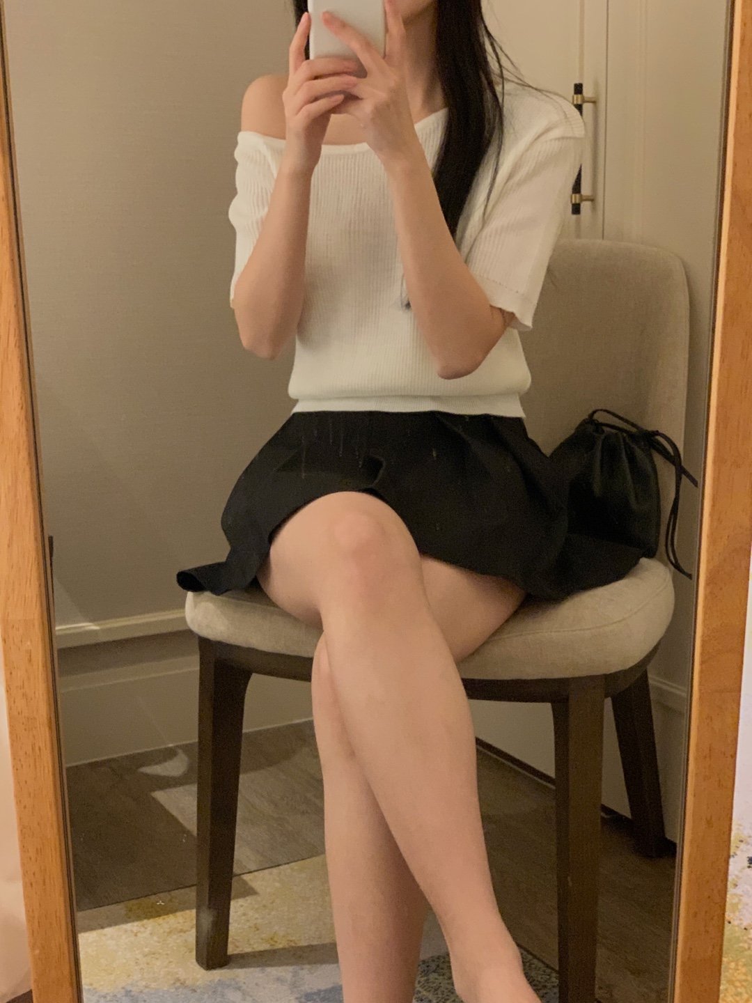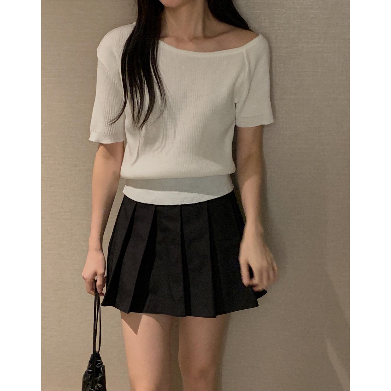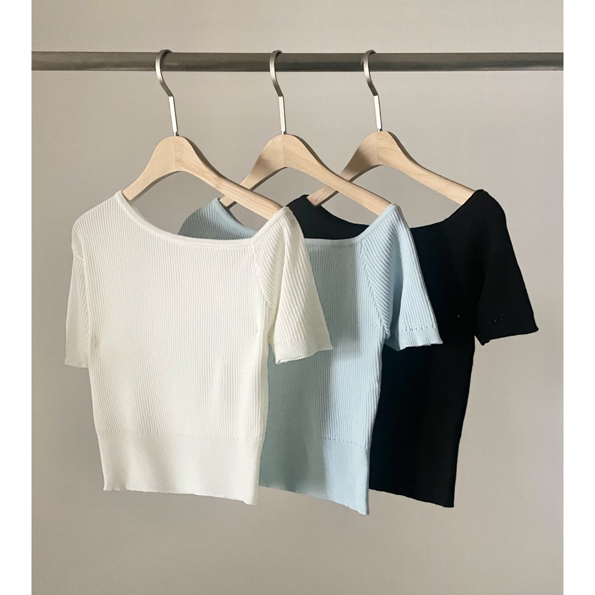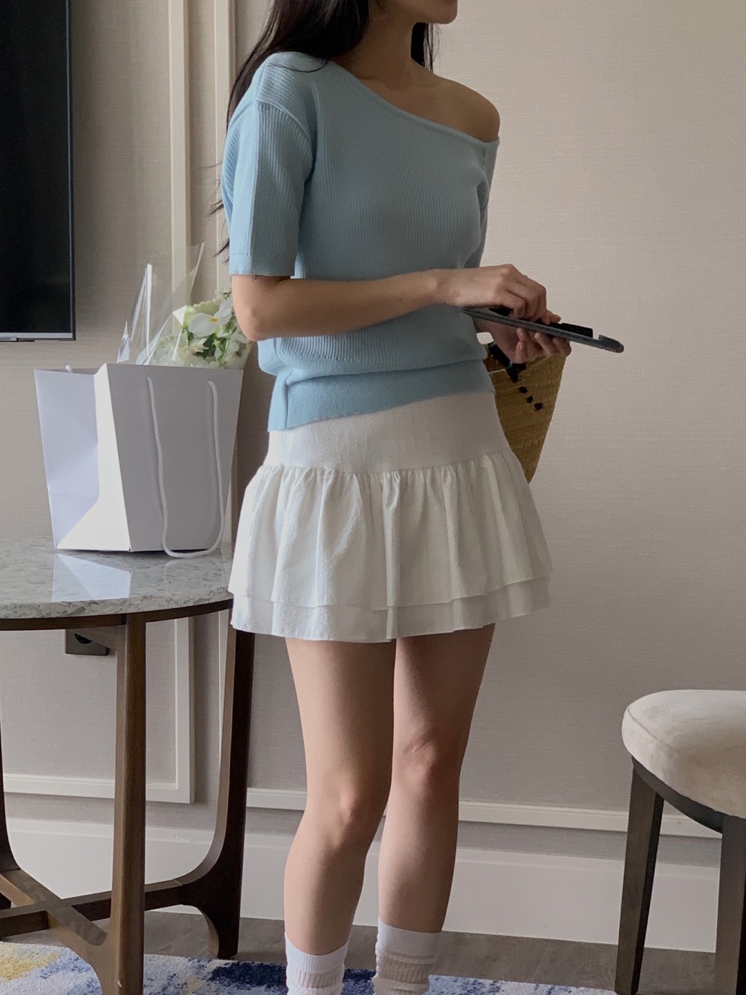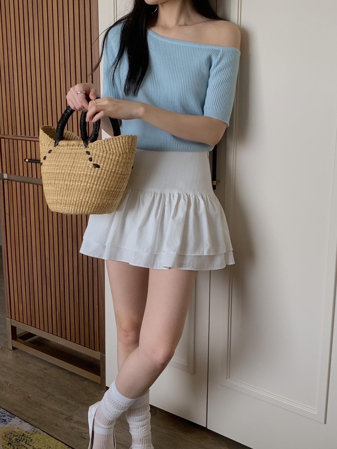 피움 오프 숄더 언발 넥 반팔 골지 니트