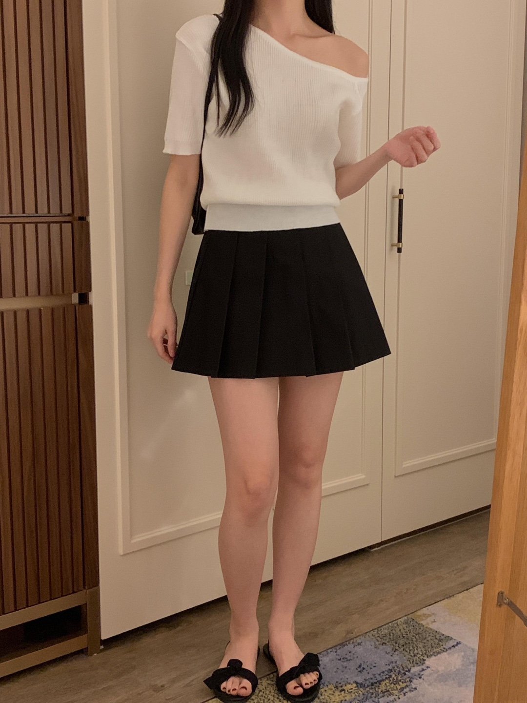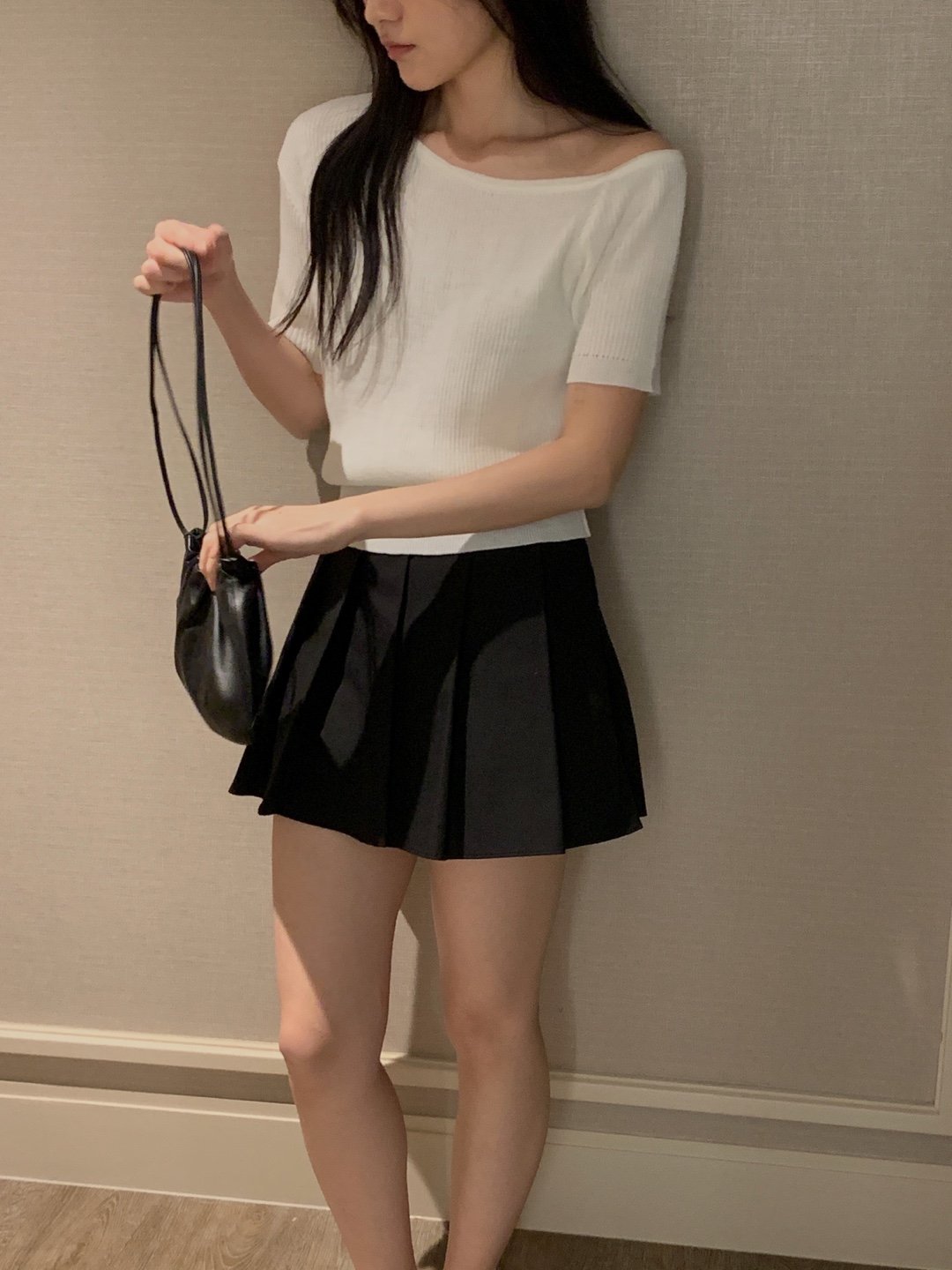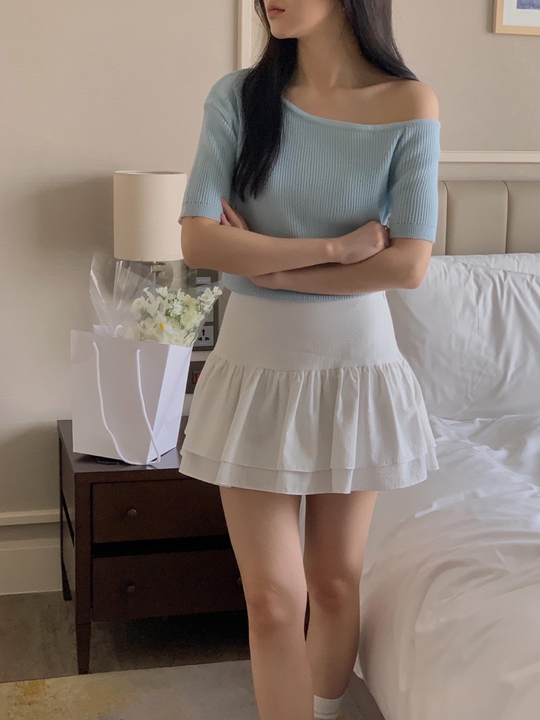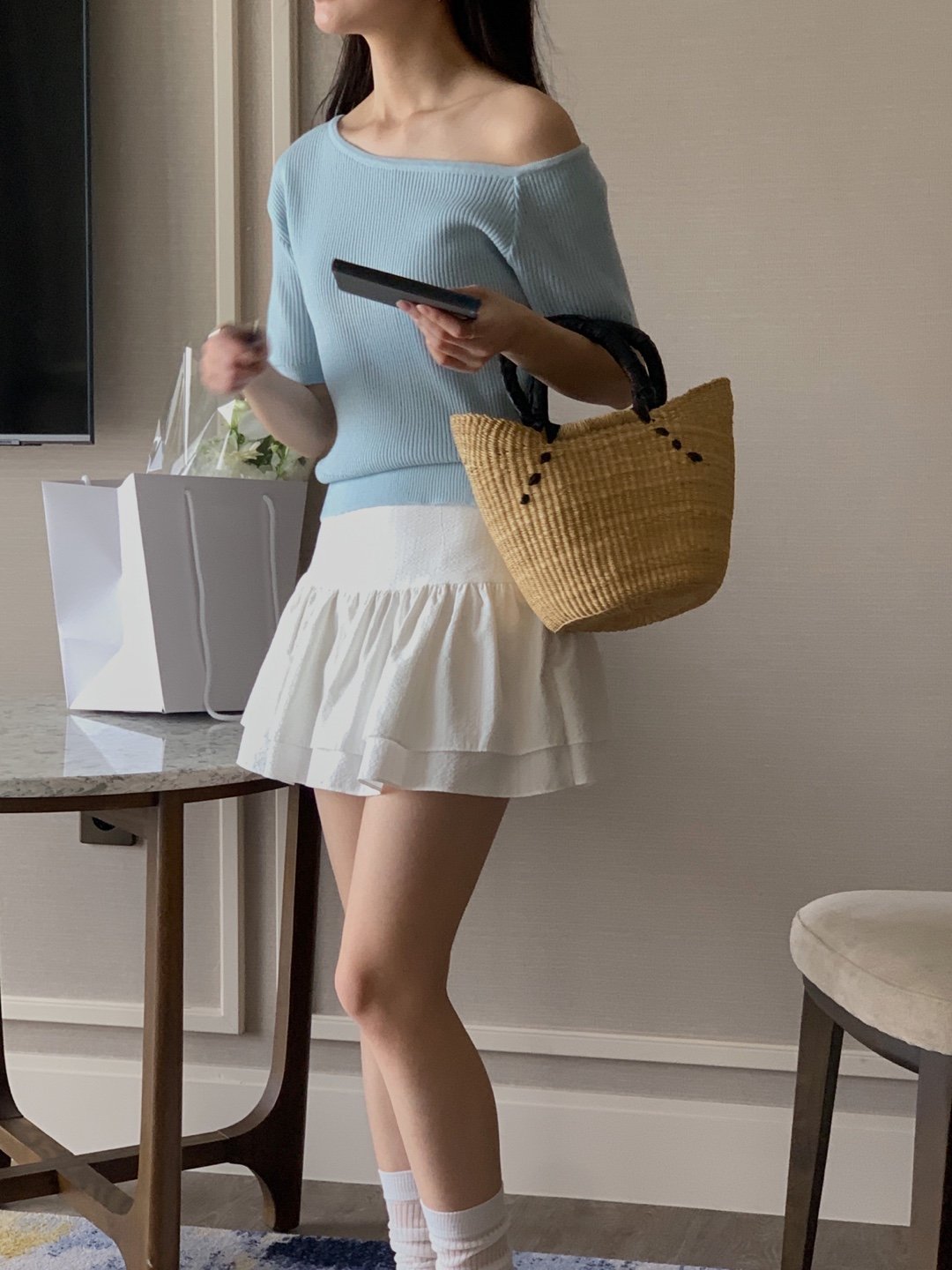 피움 오프 숄더 언발 넥 반팔 골지 니트