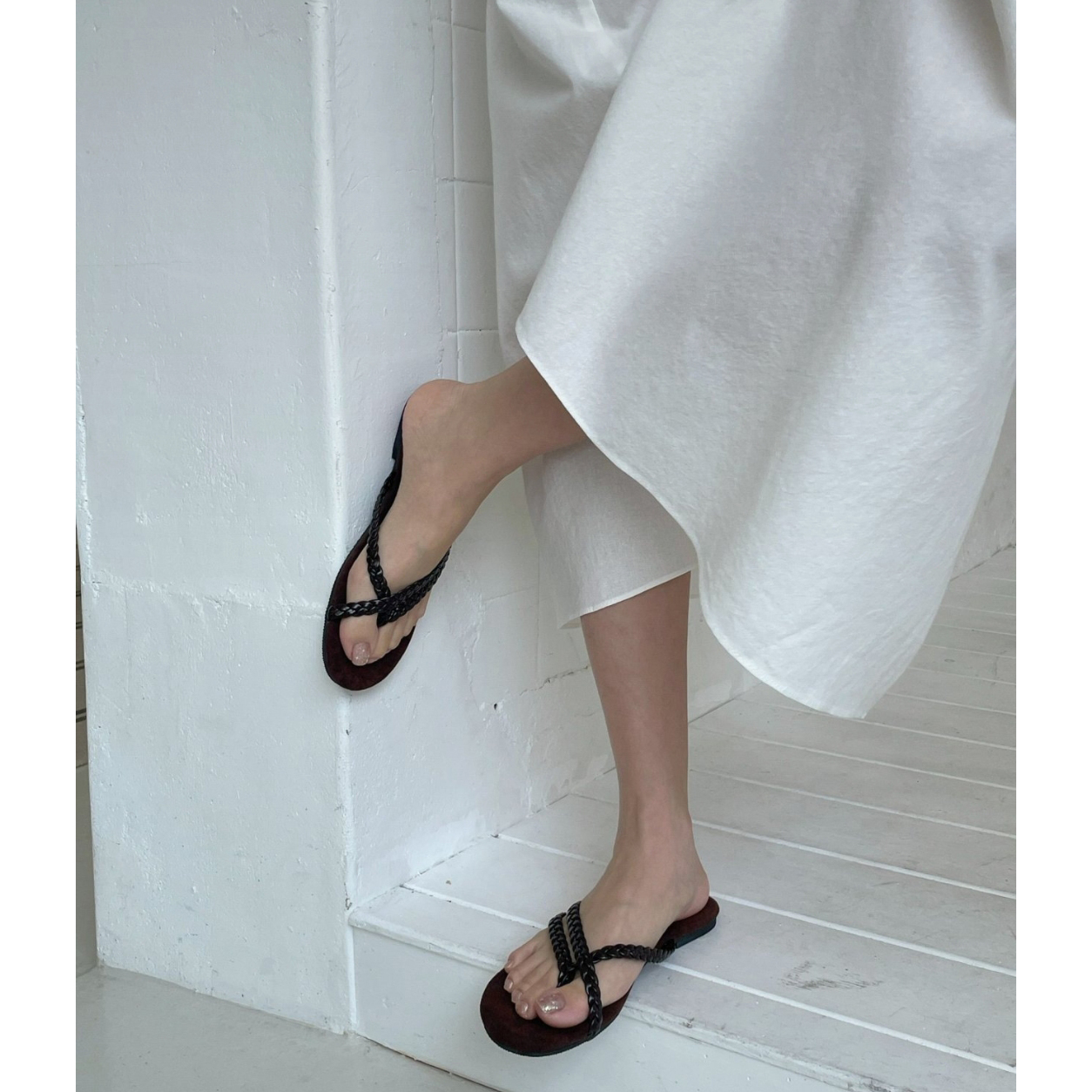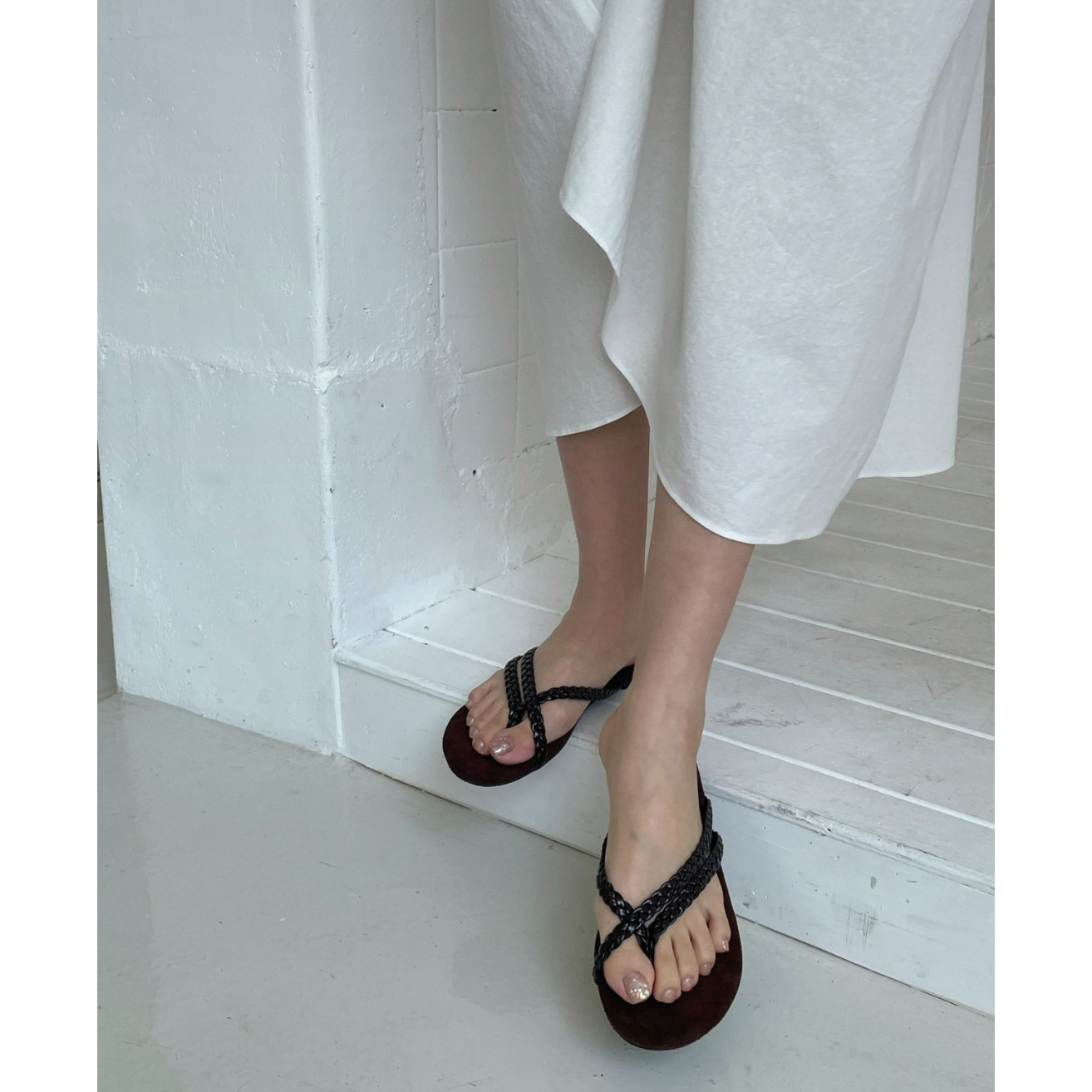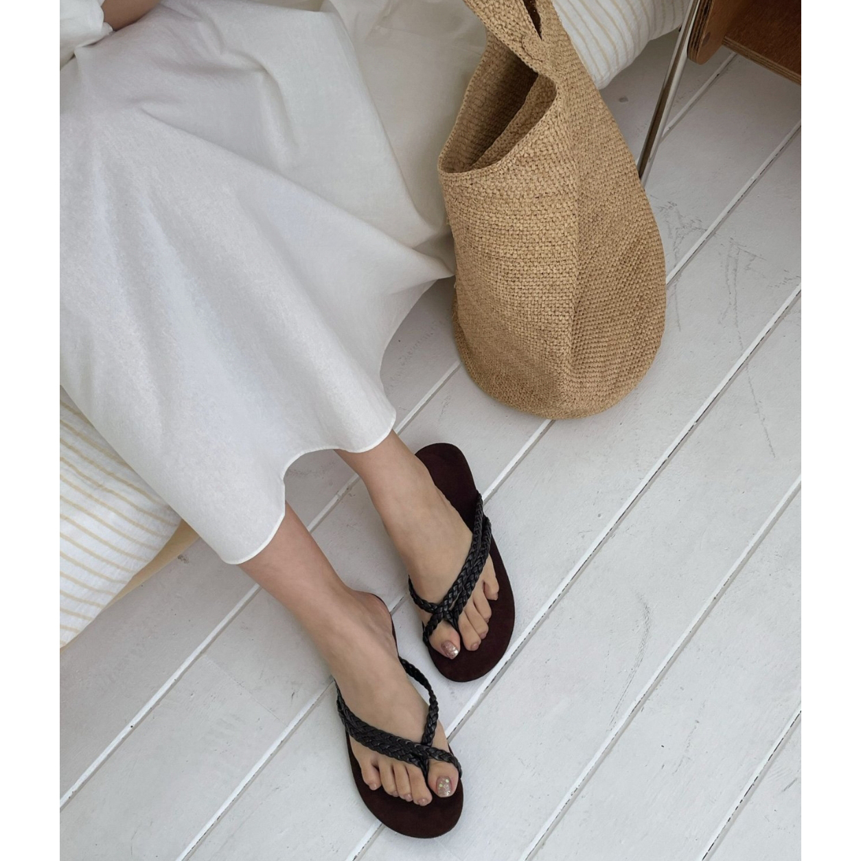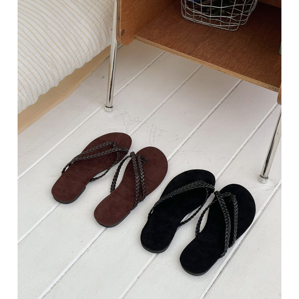 위빙 꼬임 매듭 사선 두줄 스트랩 쪼리 스웨이드 슬리퍼