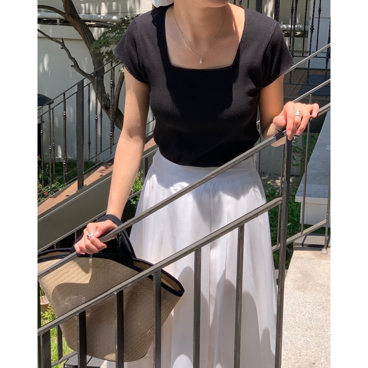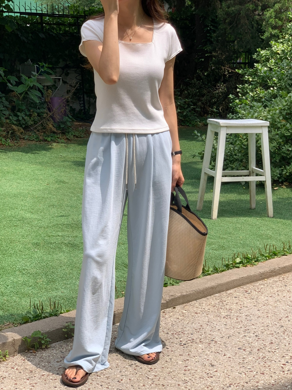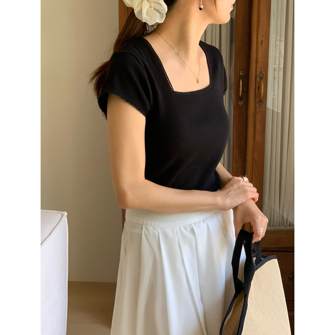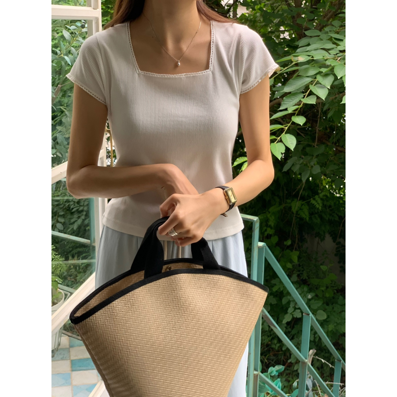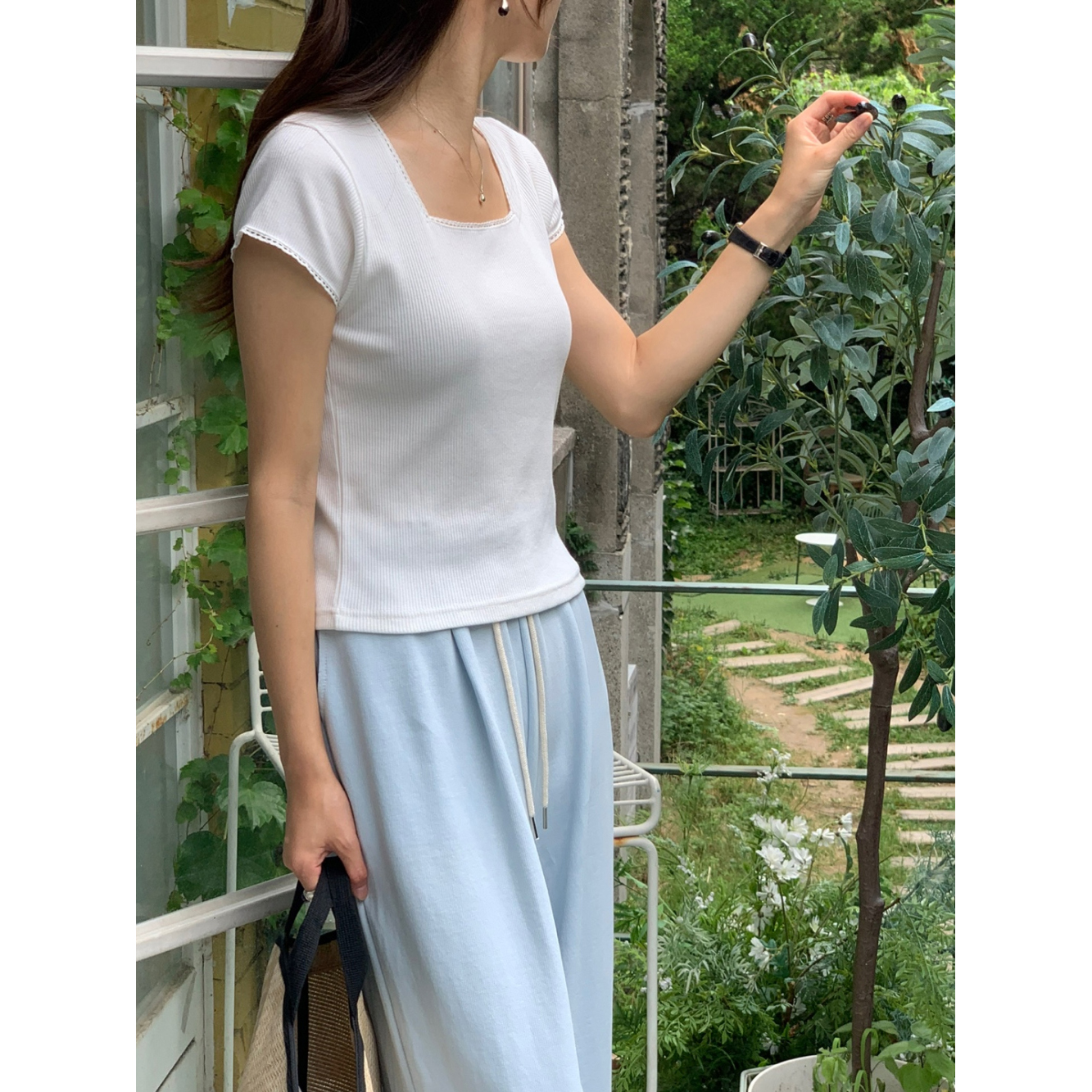 오키 레이스 트리밍 스퀘어넥 반팔 슬림 티