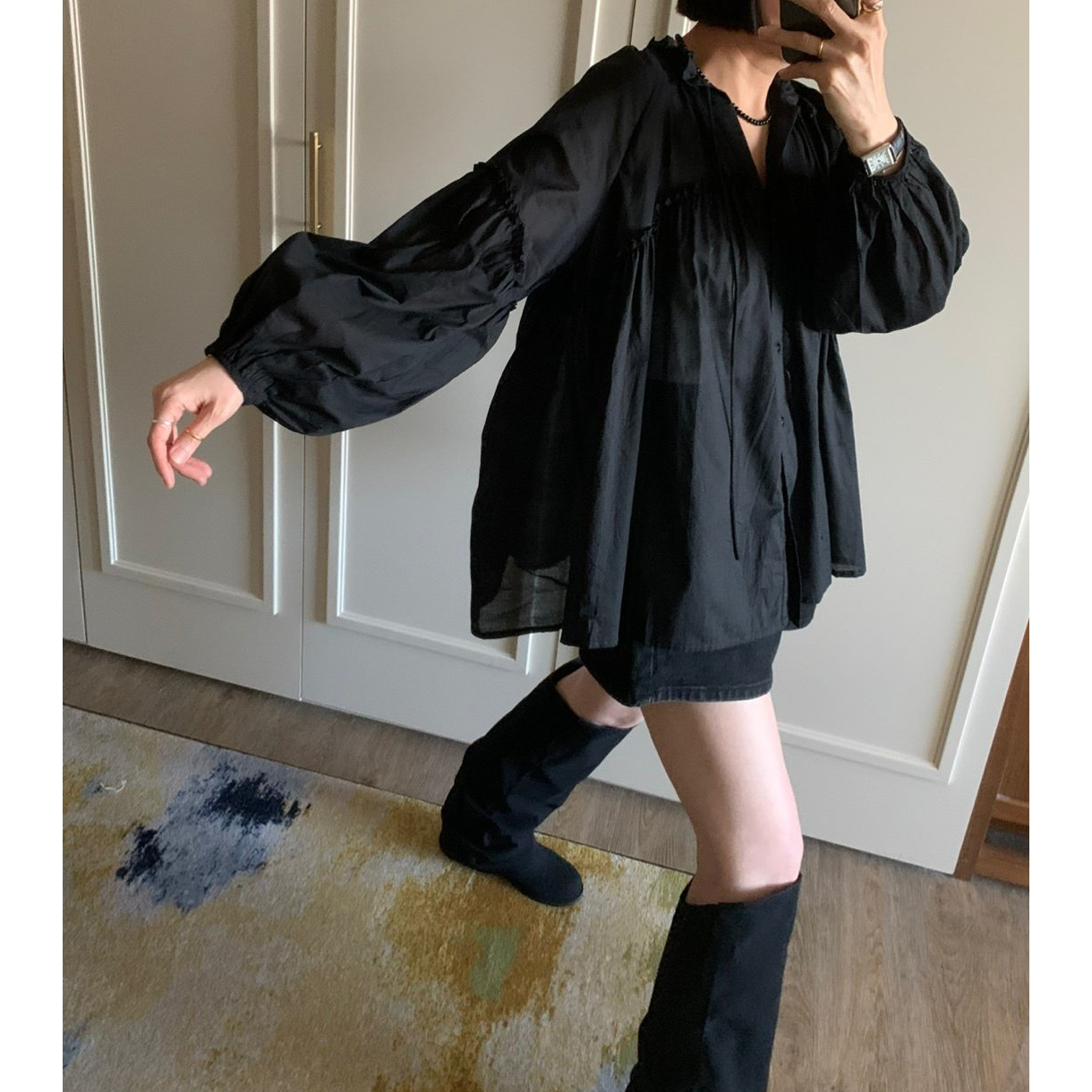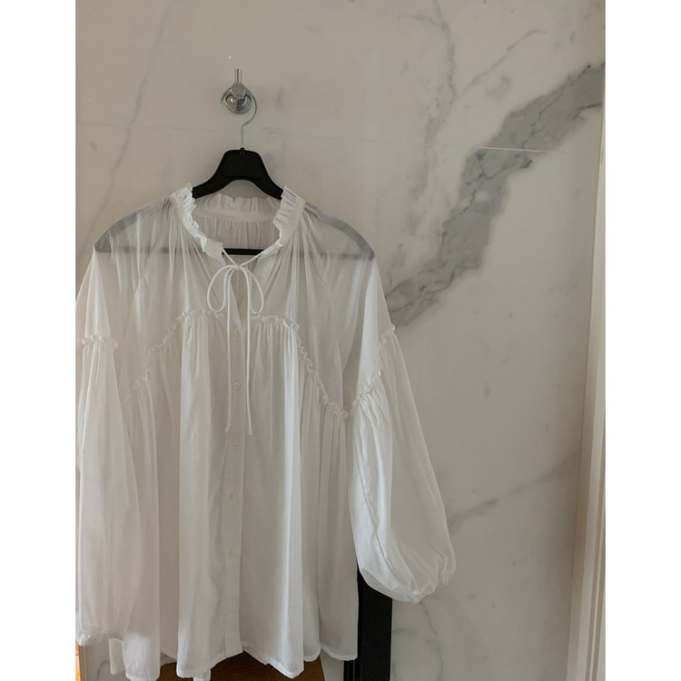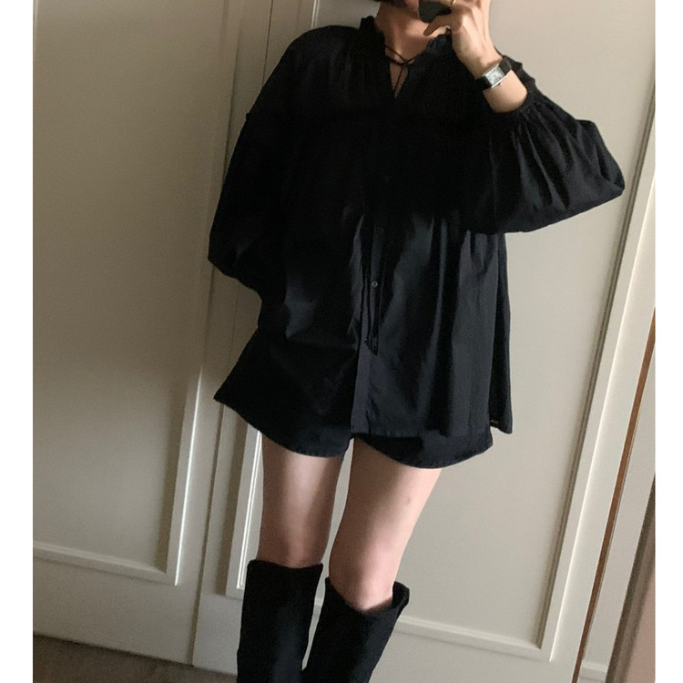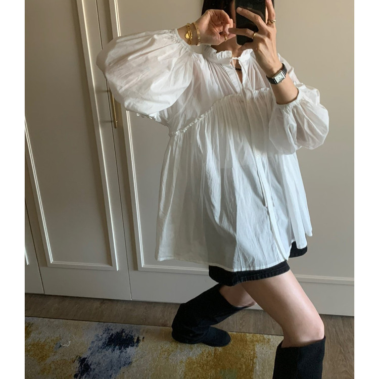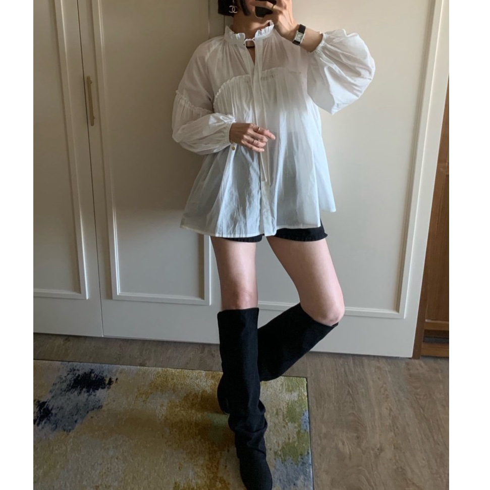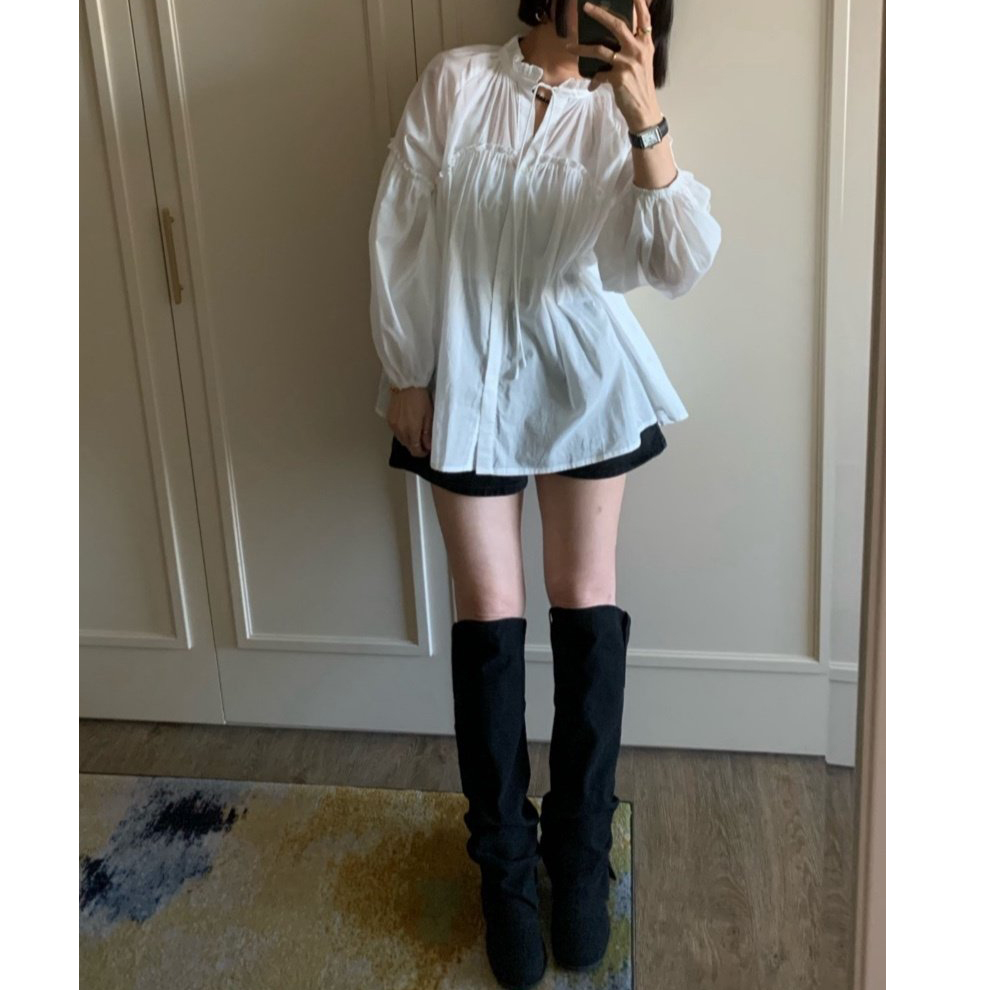 미요 얇은 긴팔 셔링 롱블라우스