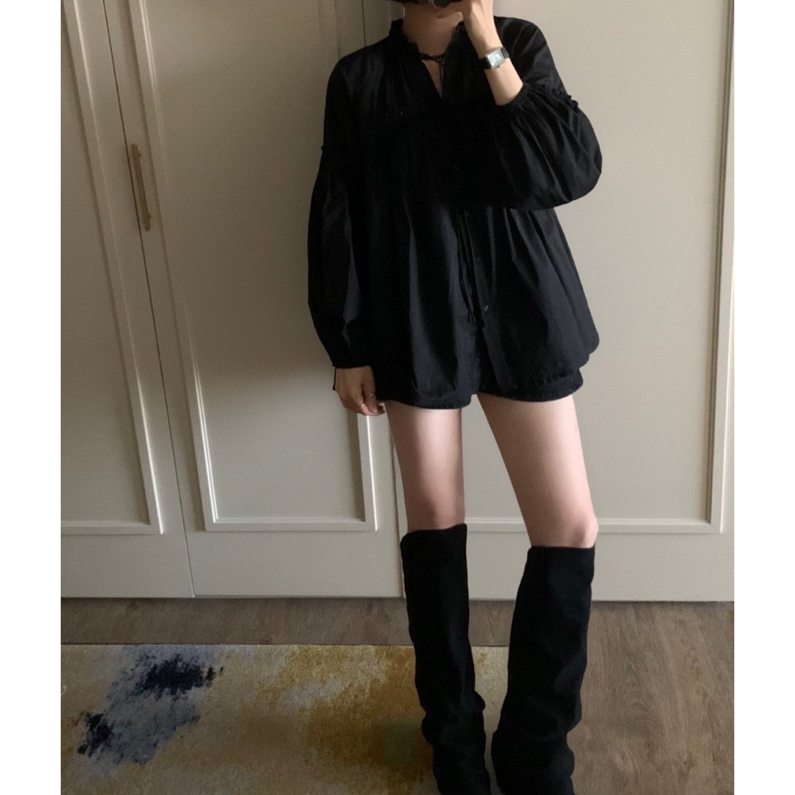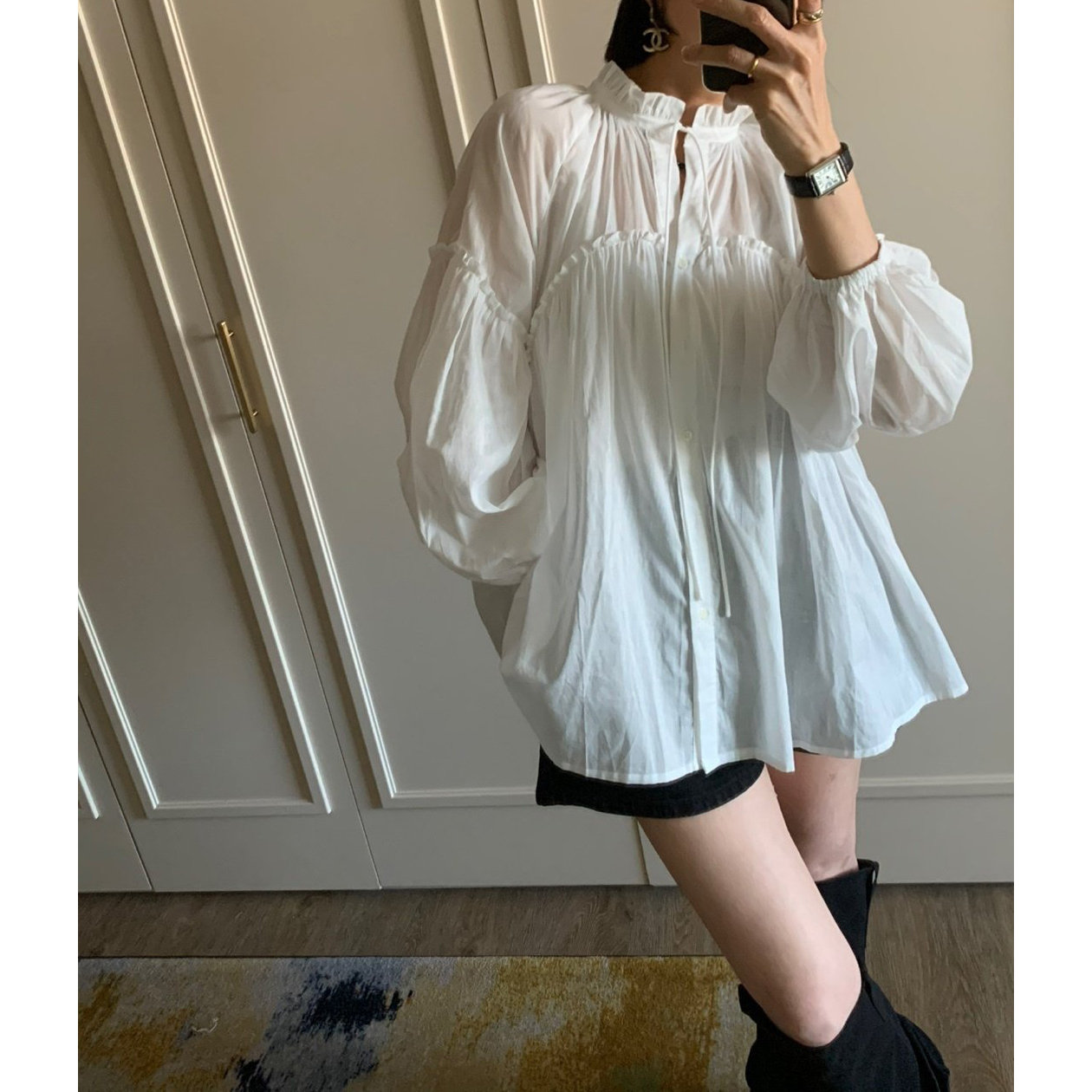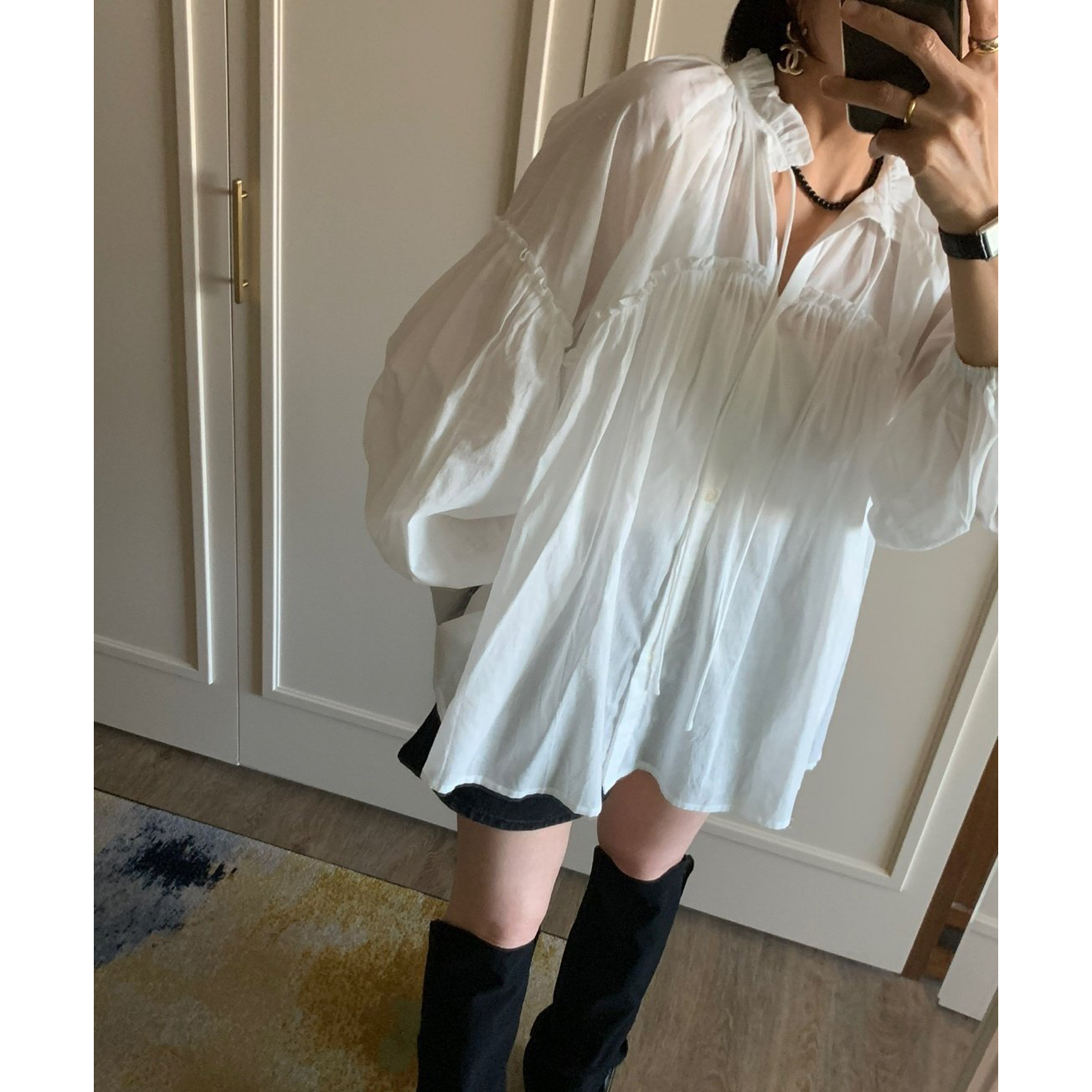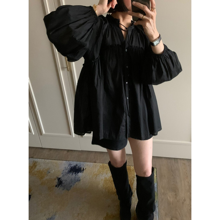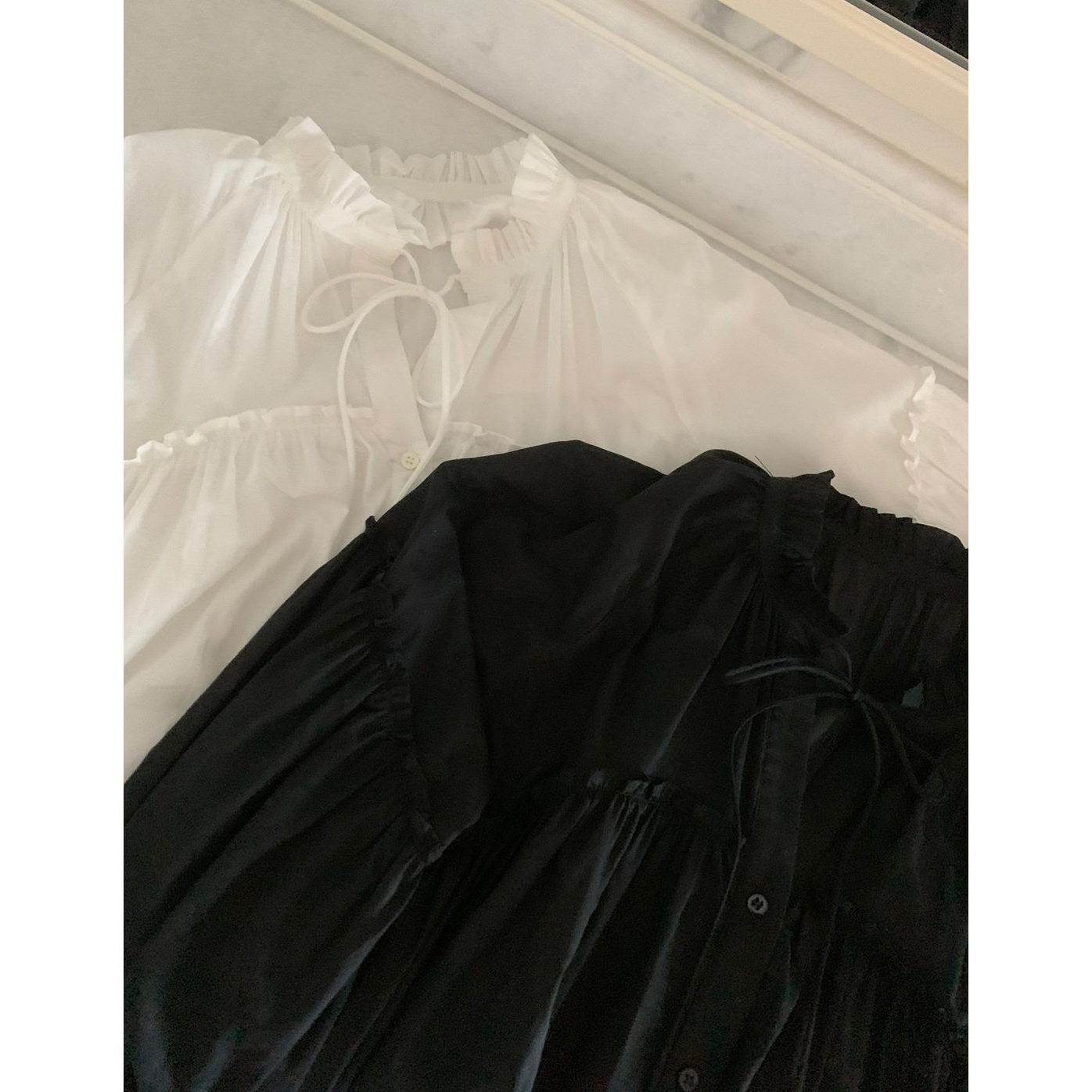 미요 얇은 긴팔 셔링 롱블라우스