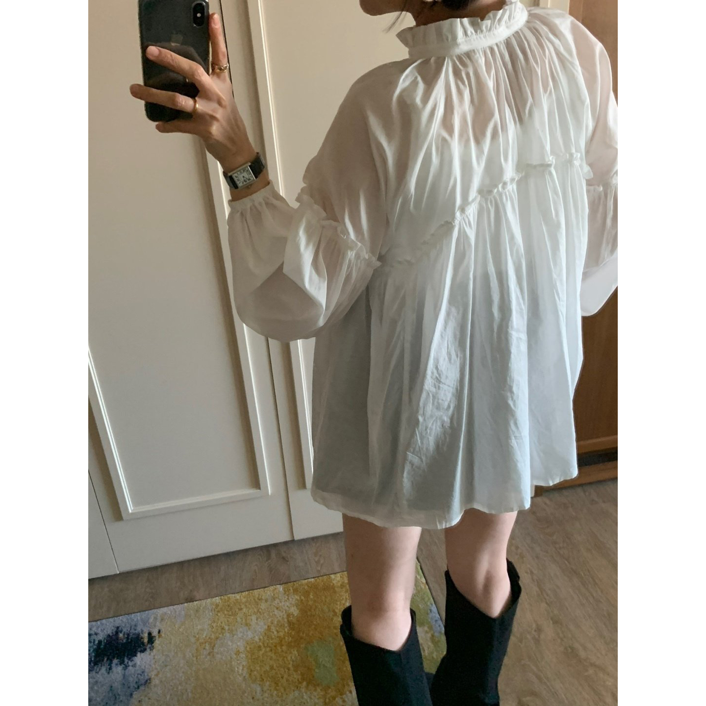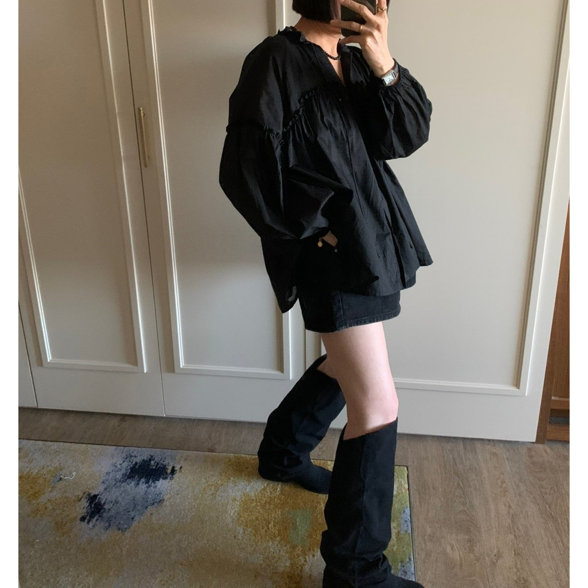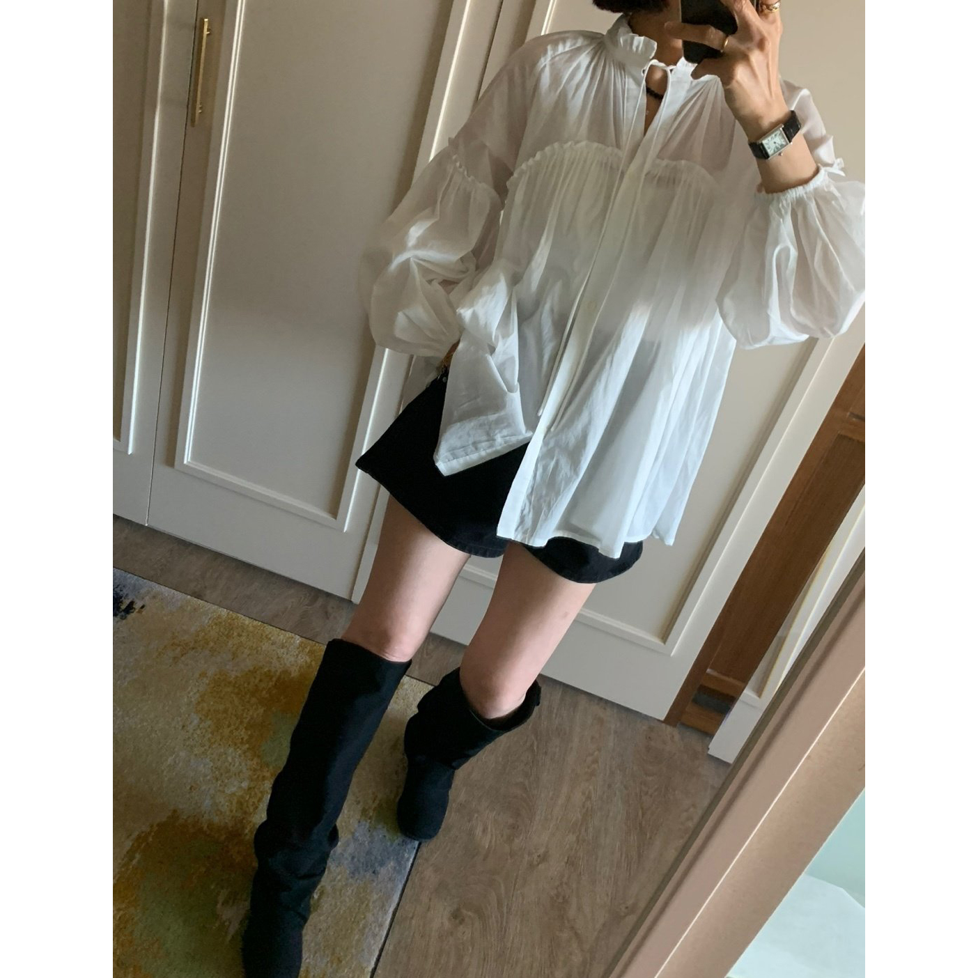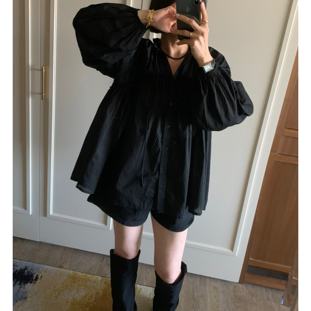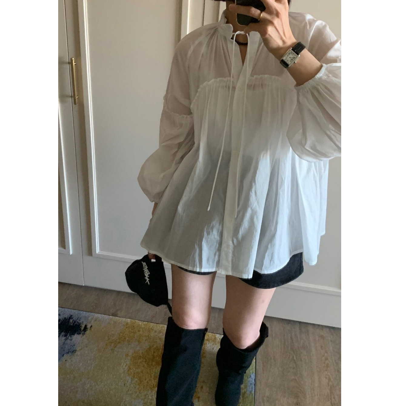 미요 얇은 긴팔 셔링 롱블라우스