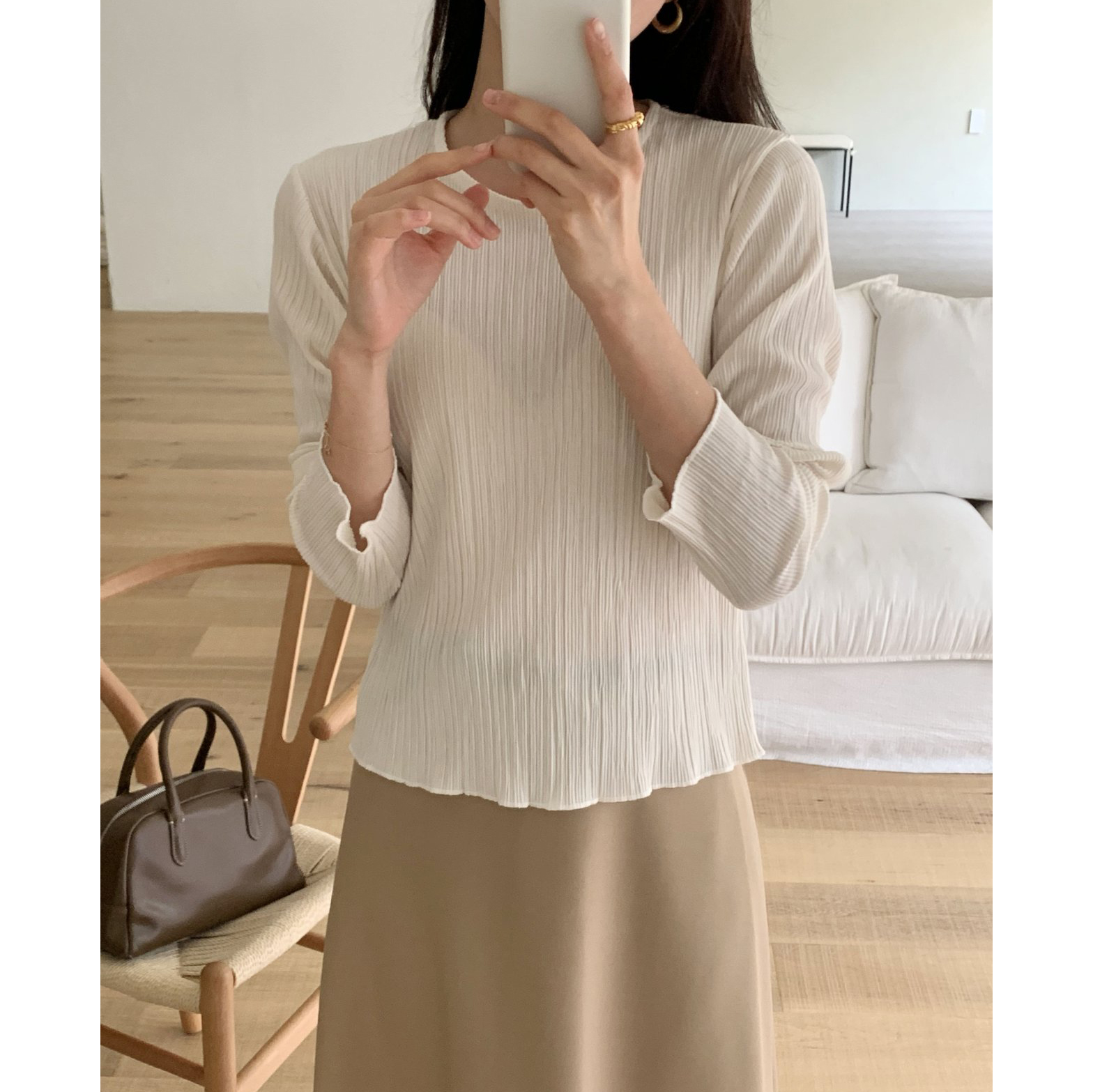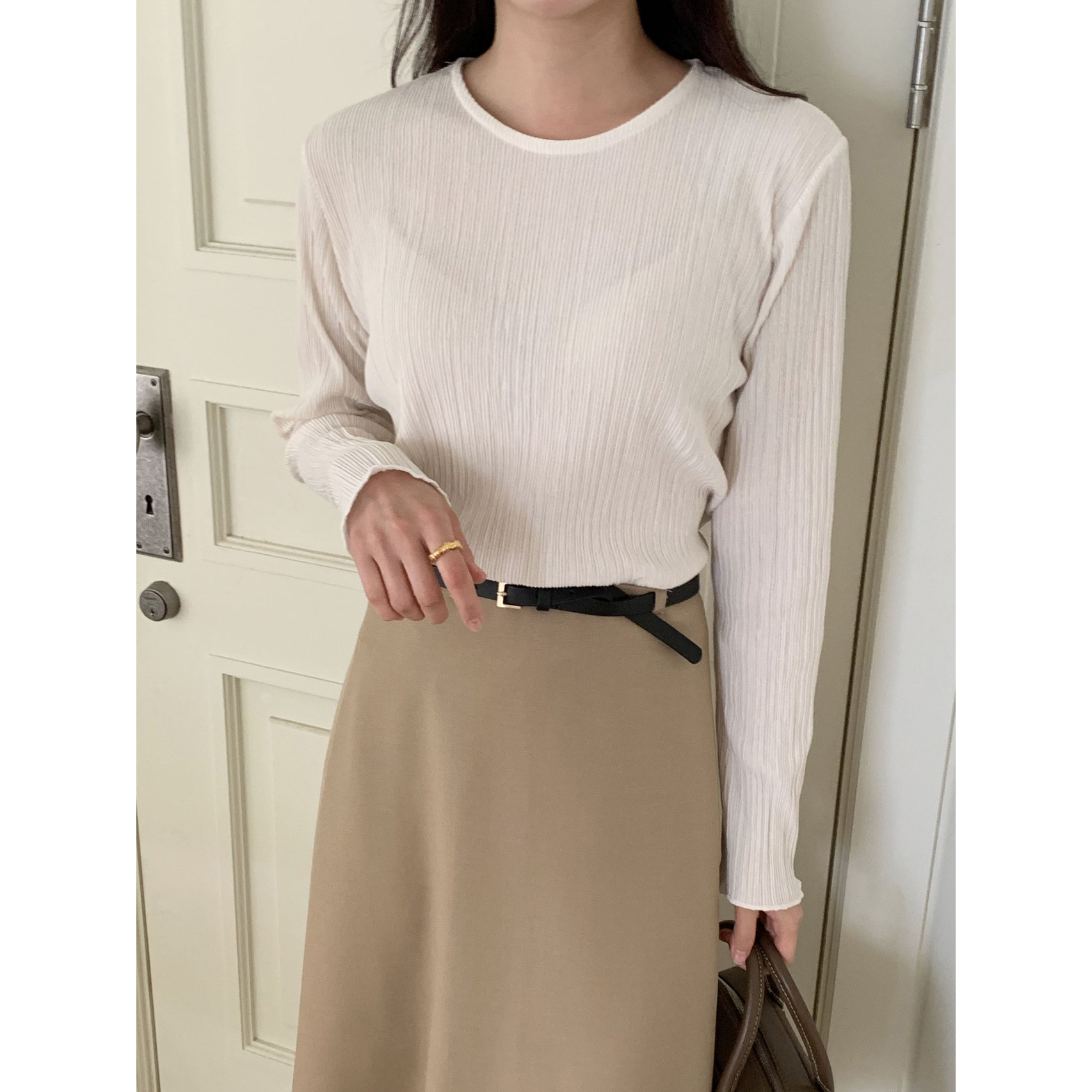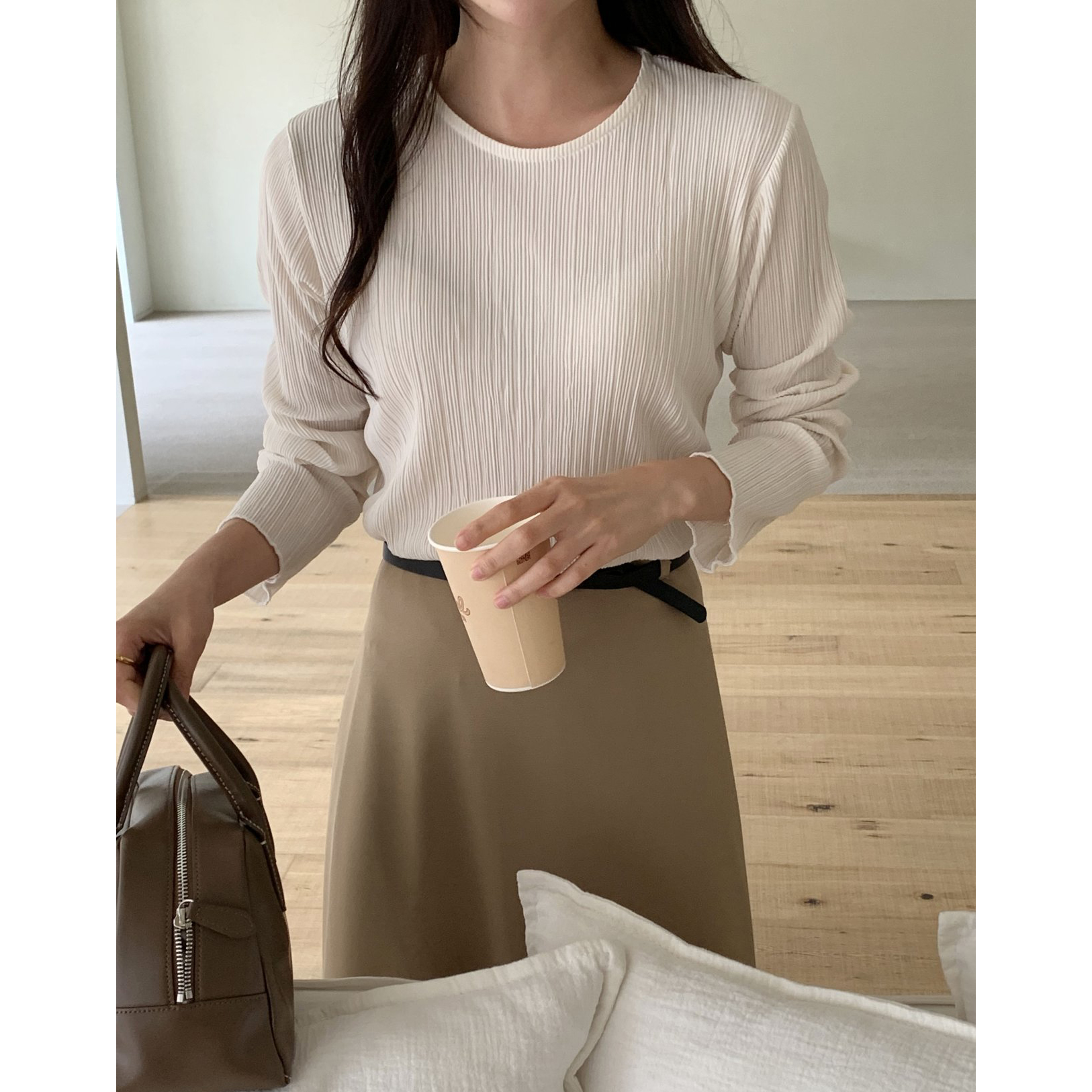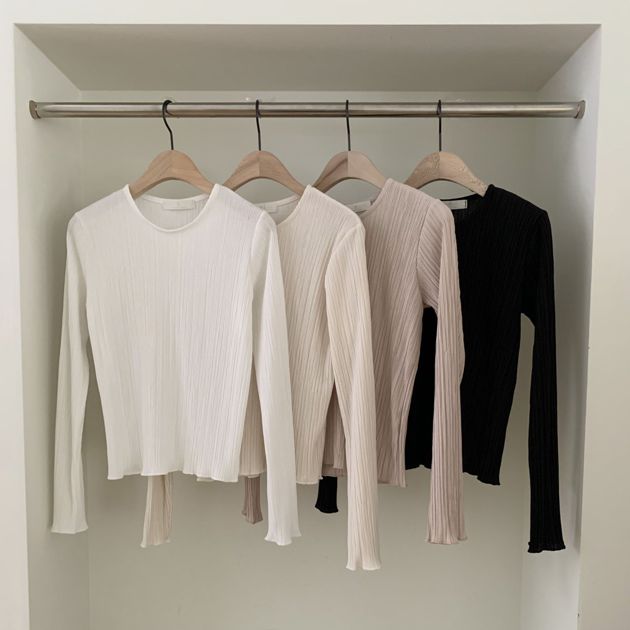 라미 주름 엠보 긴팔 기본티 블라우스