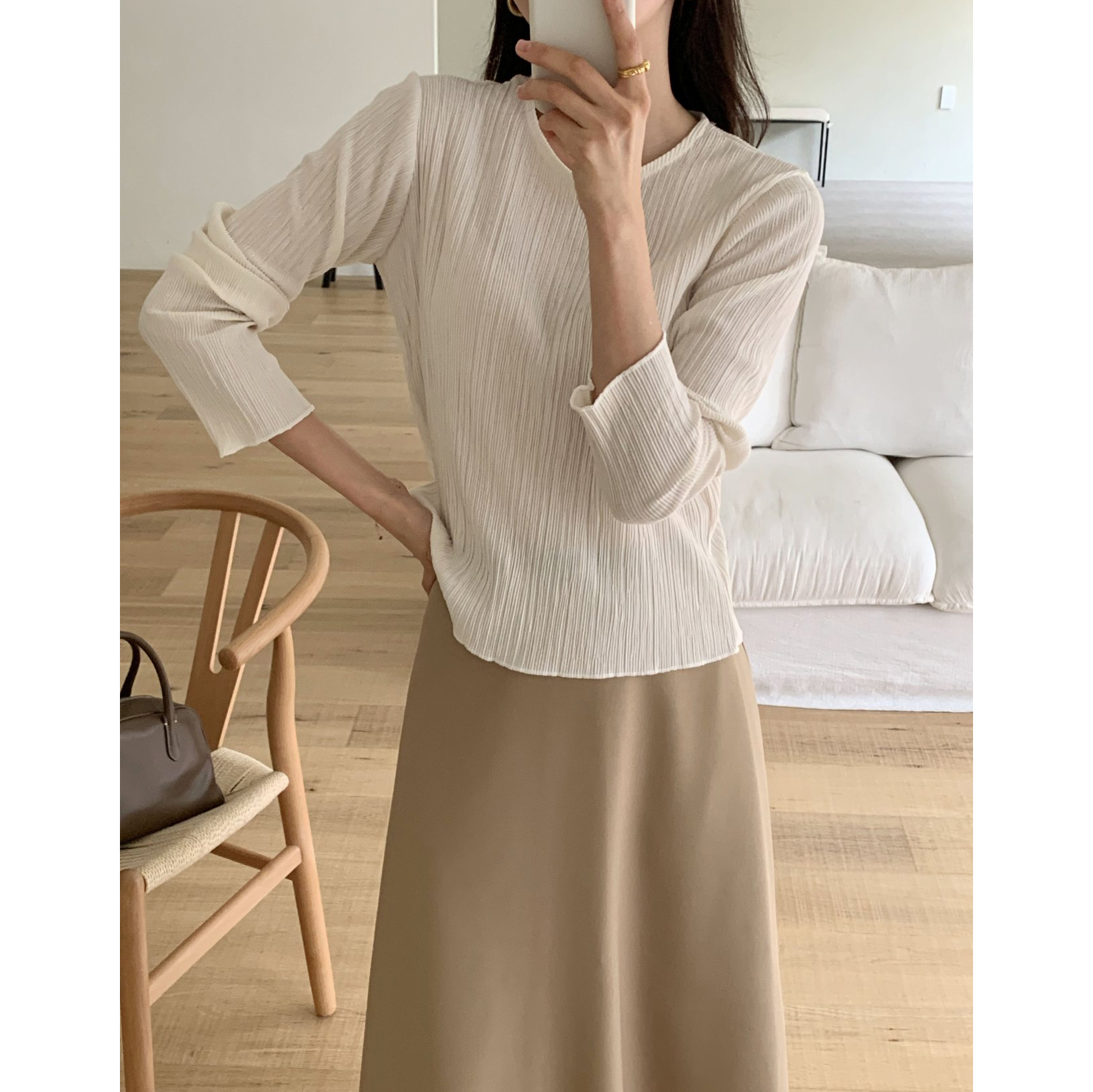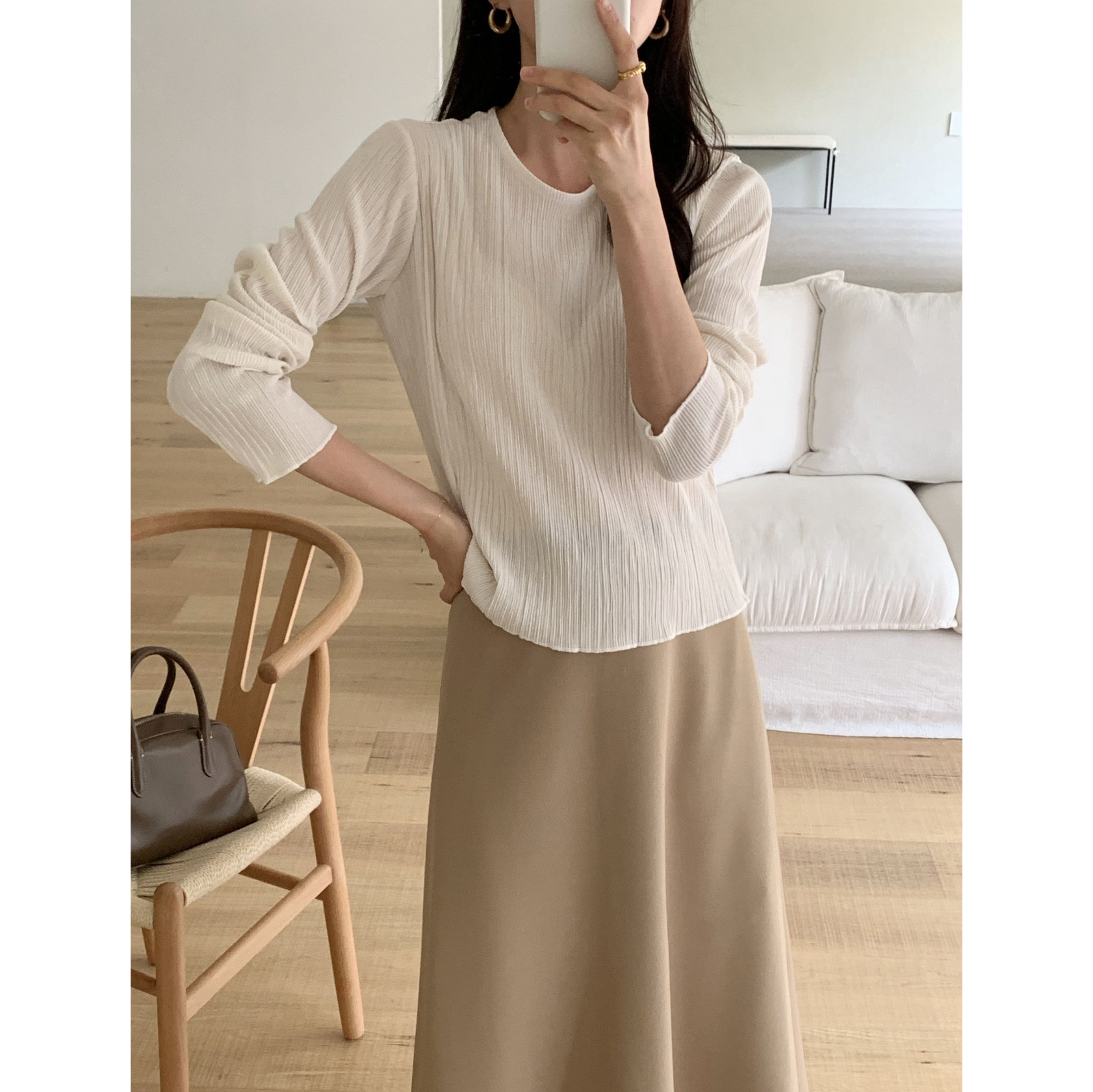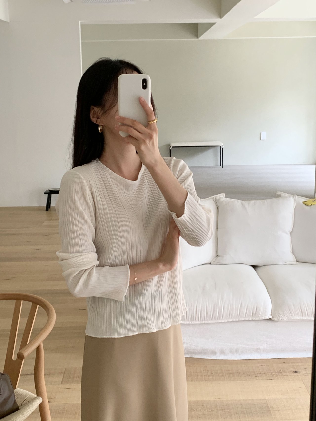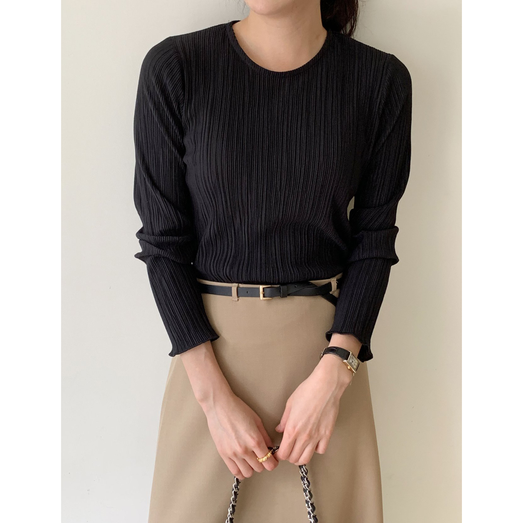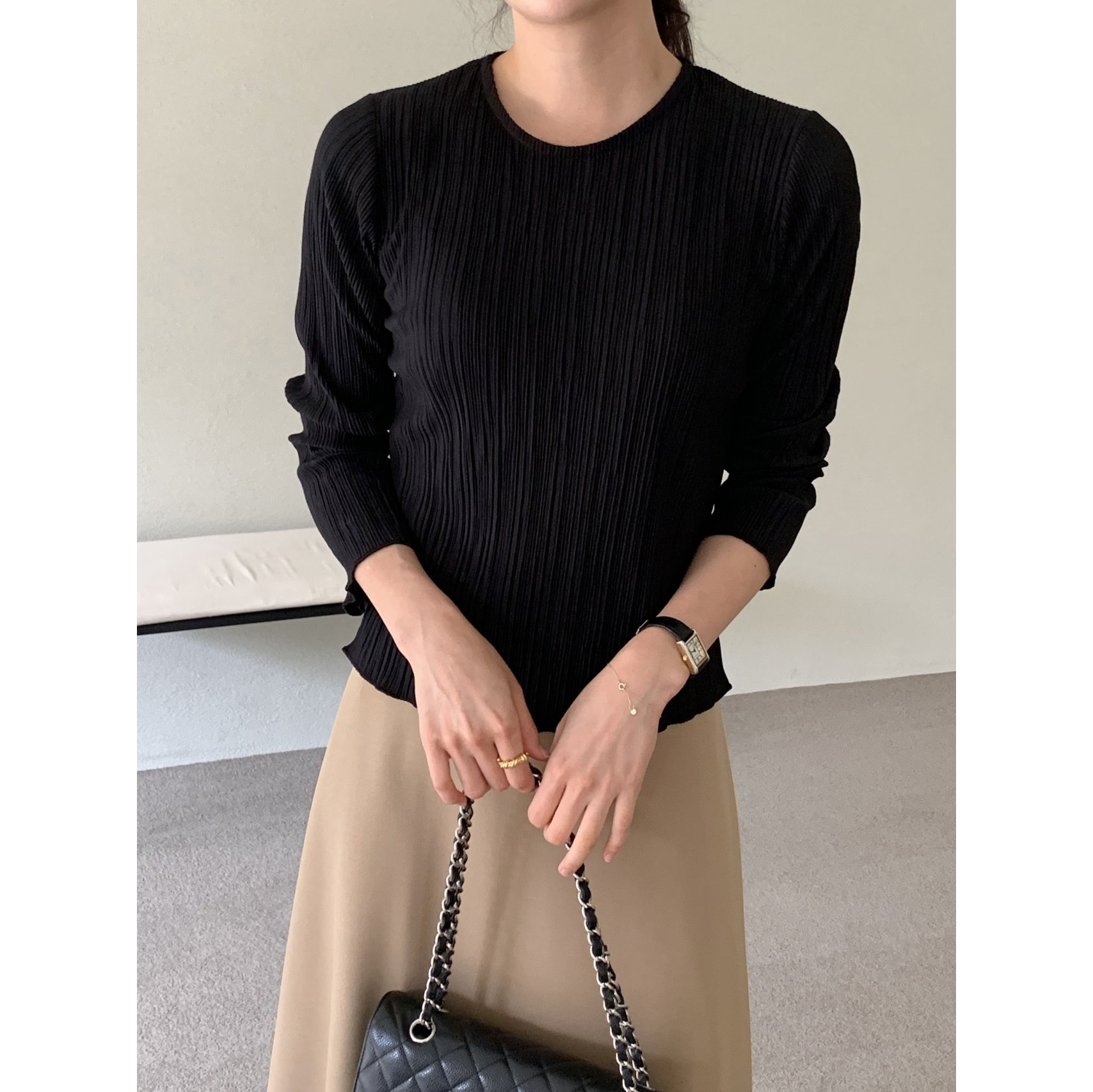 라미 주름 엠보 긴팔 기본티 블라우스