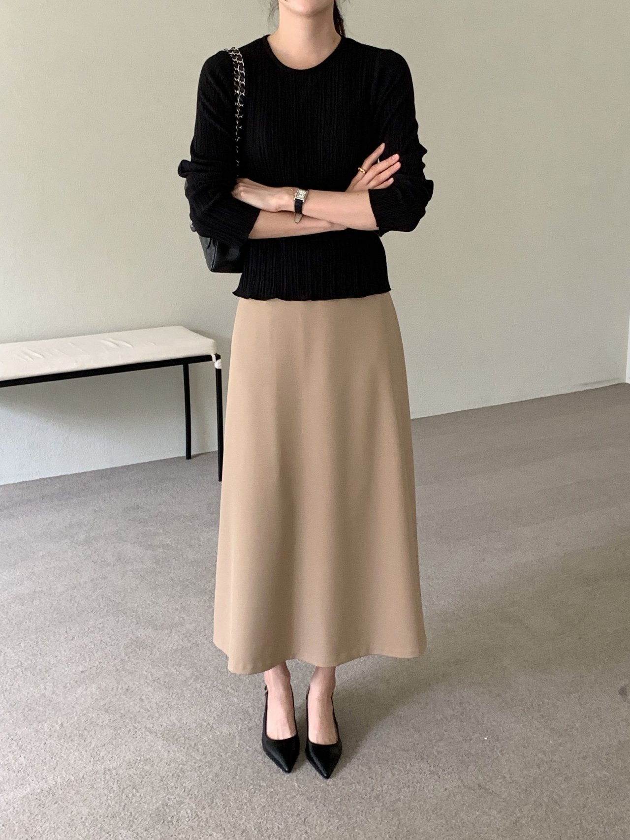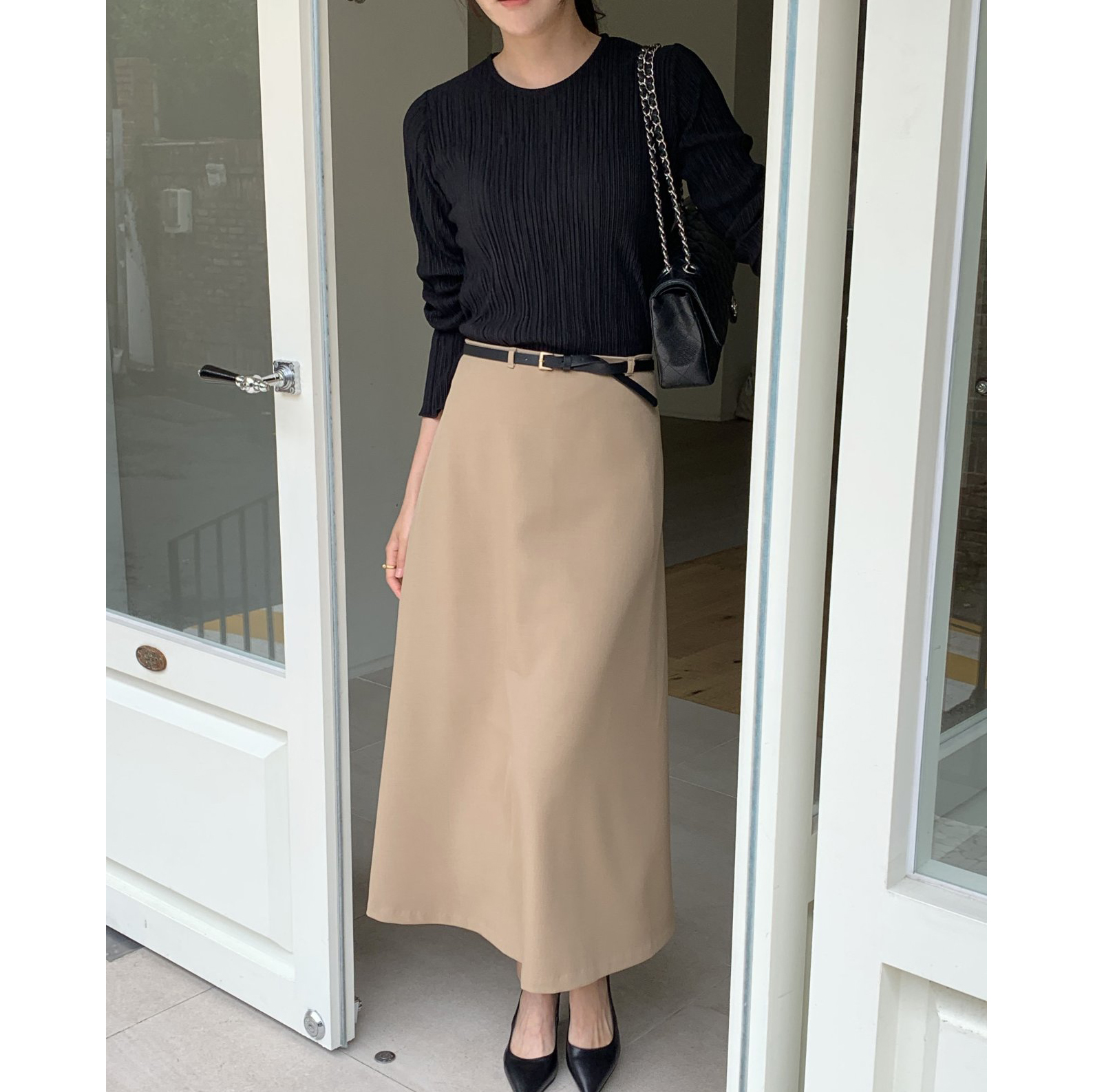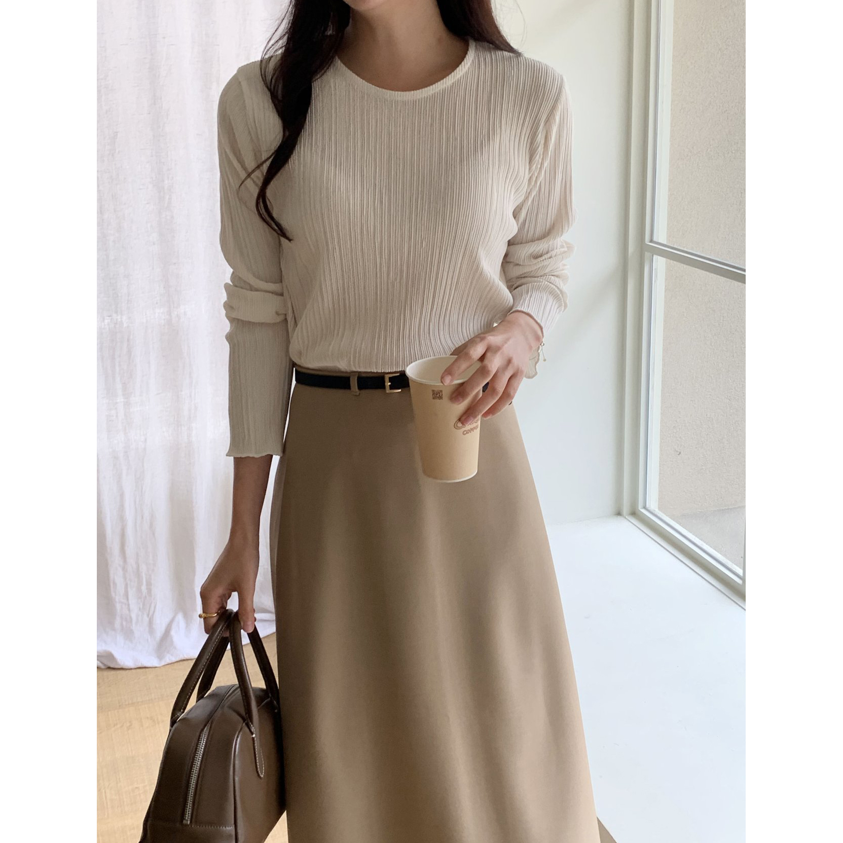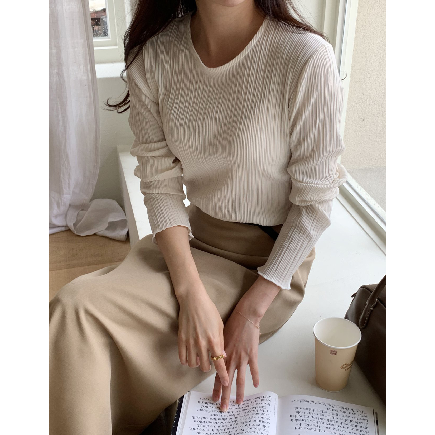 라미 주름 엠보 긴팔 기본티 블라우스