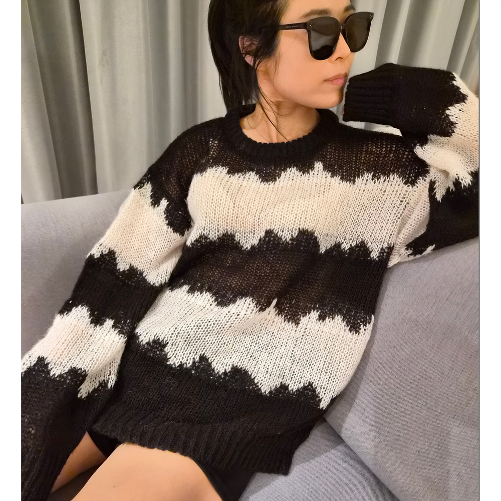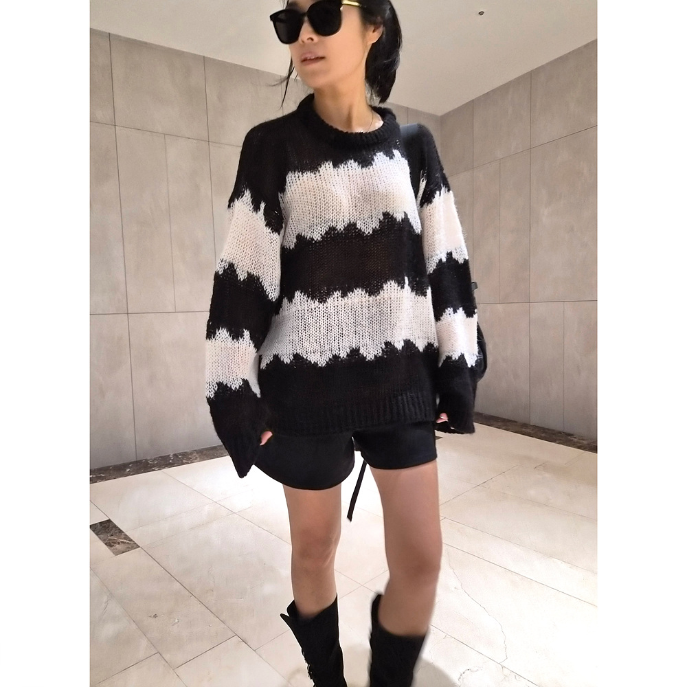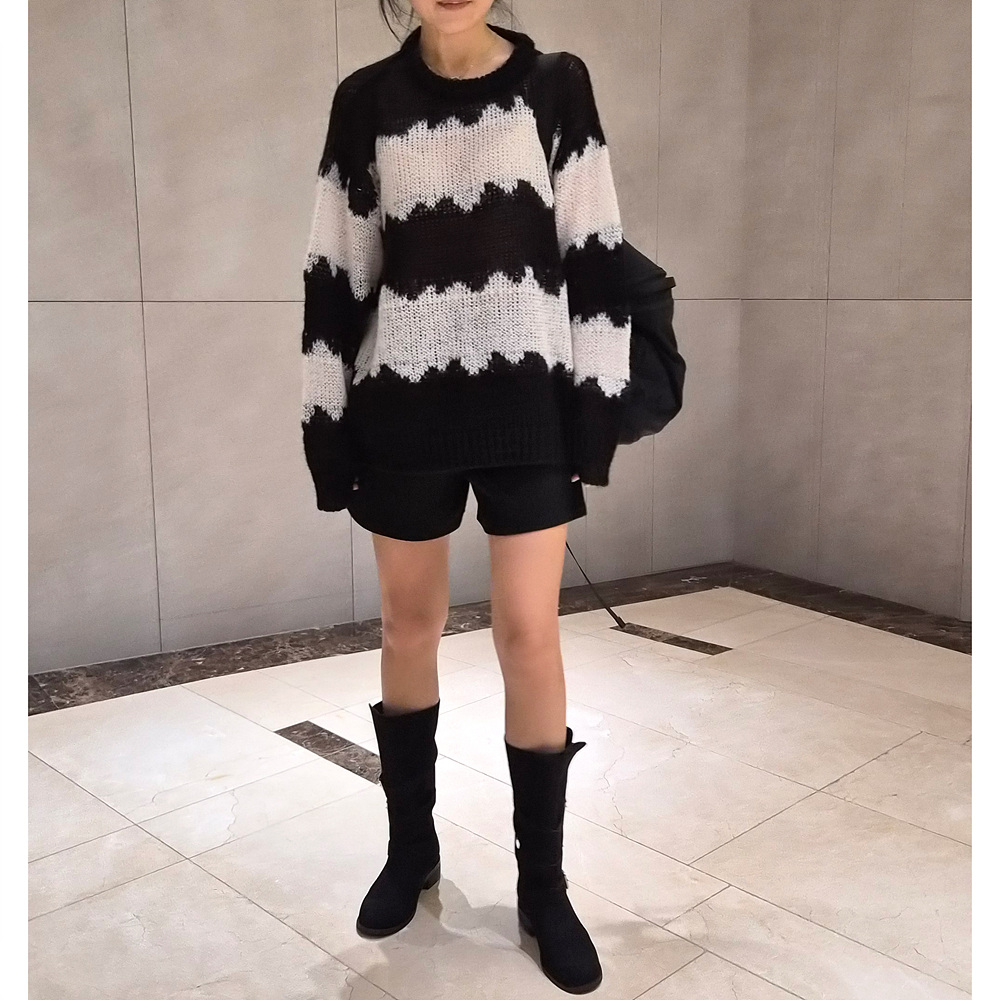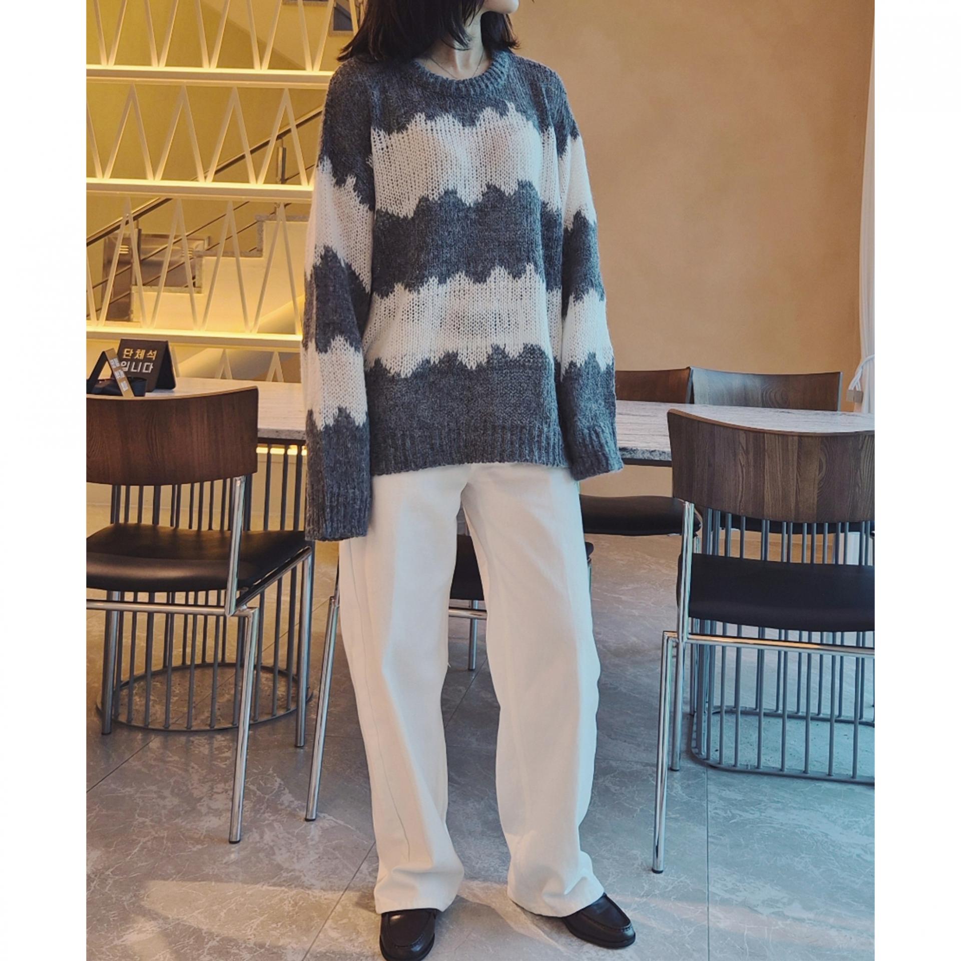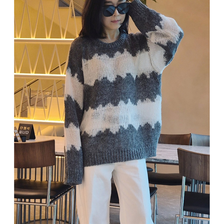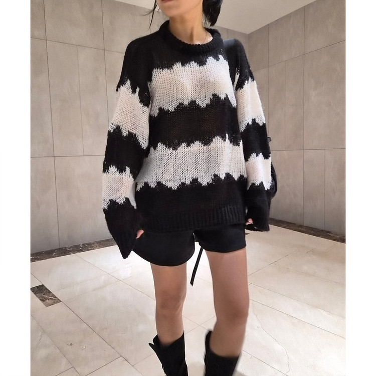 물결 배색 루즈핏 알파카 니트