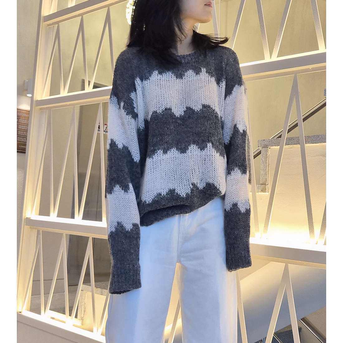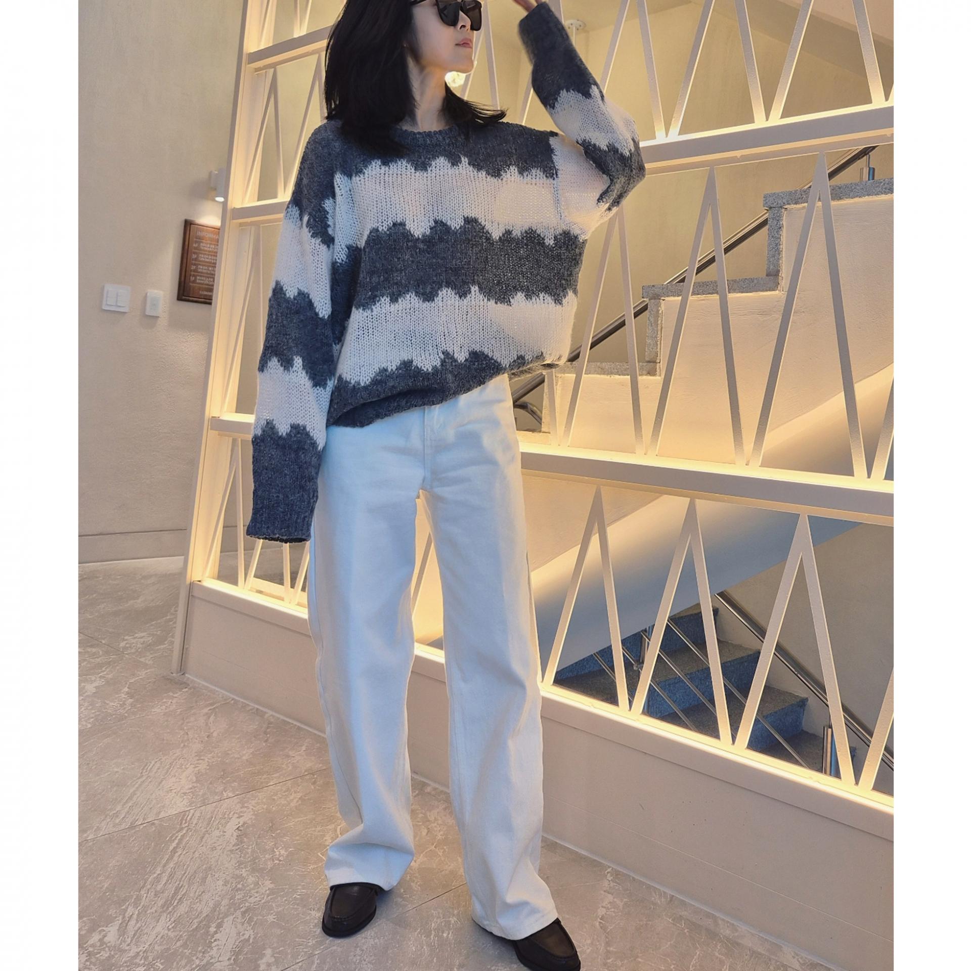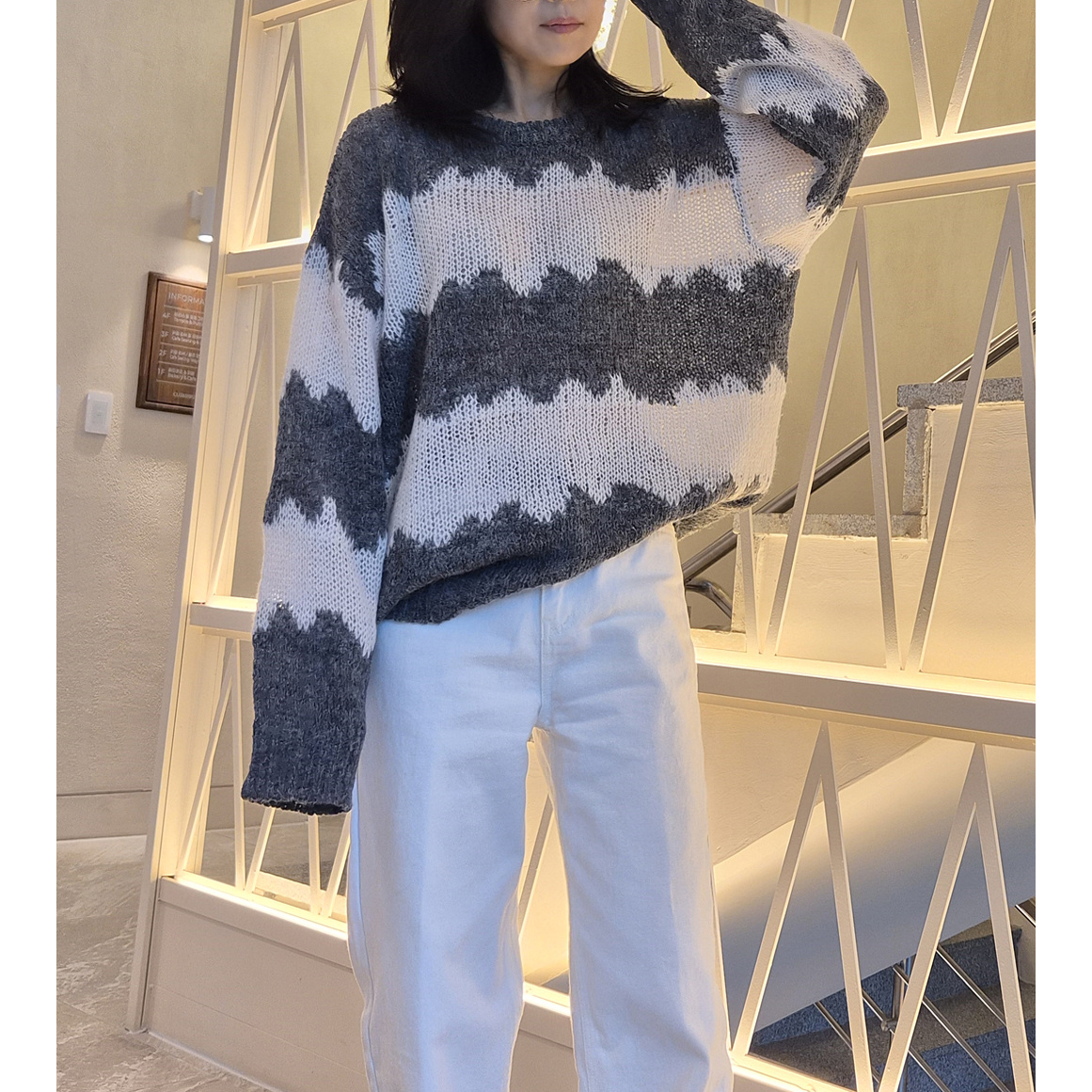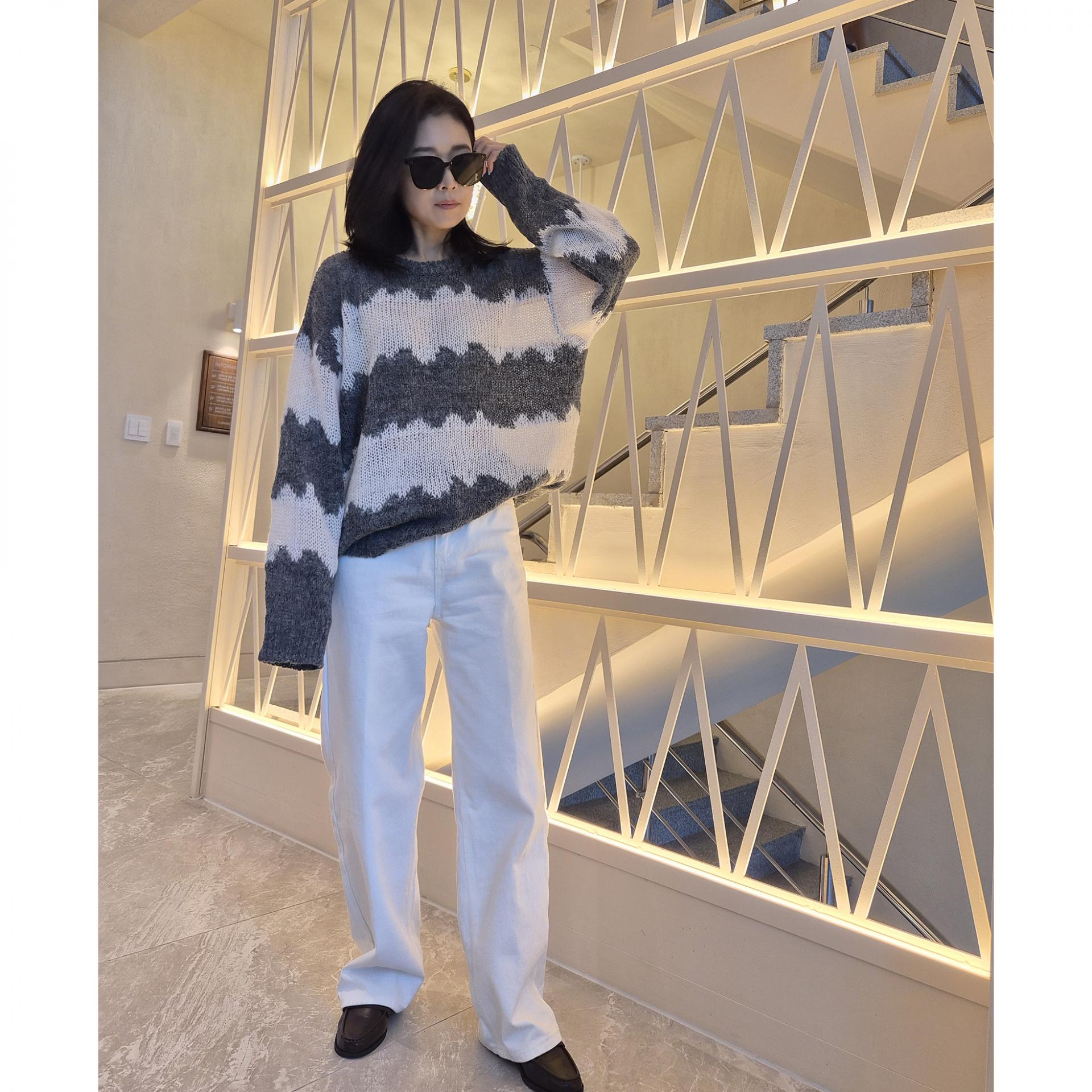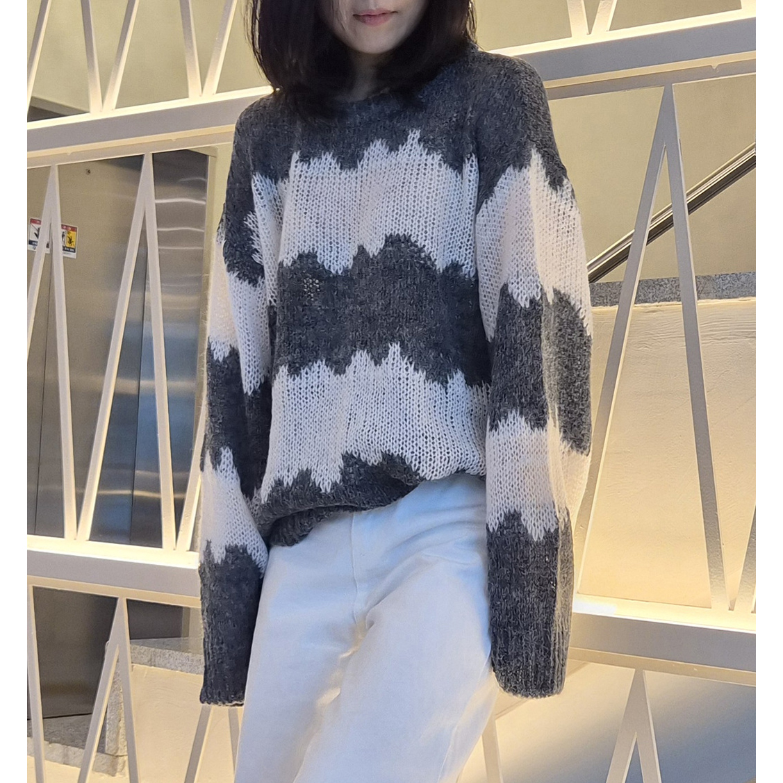 물결 배색 루즈핏 알파카 니트