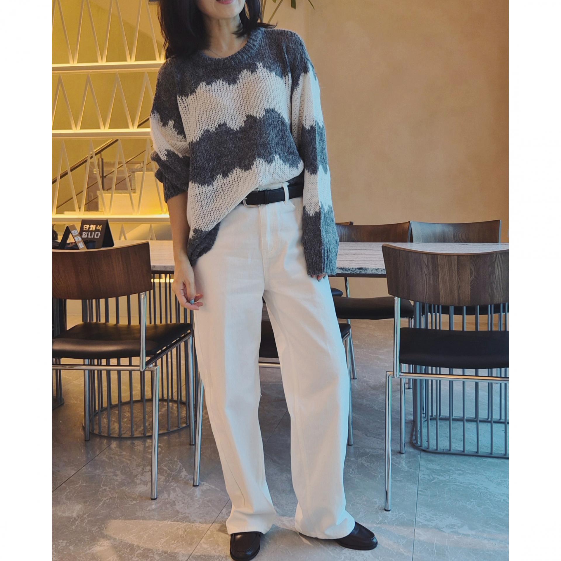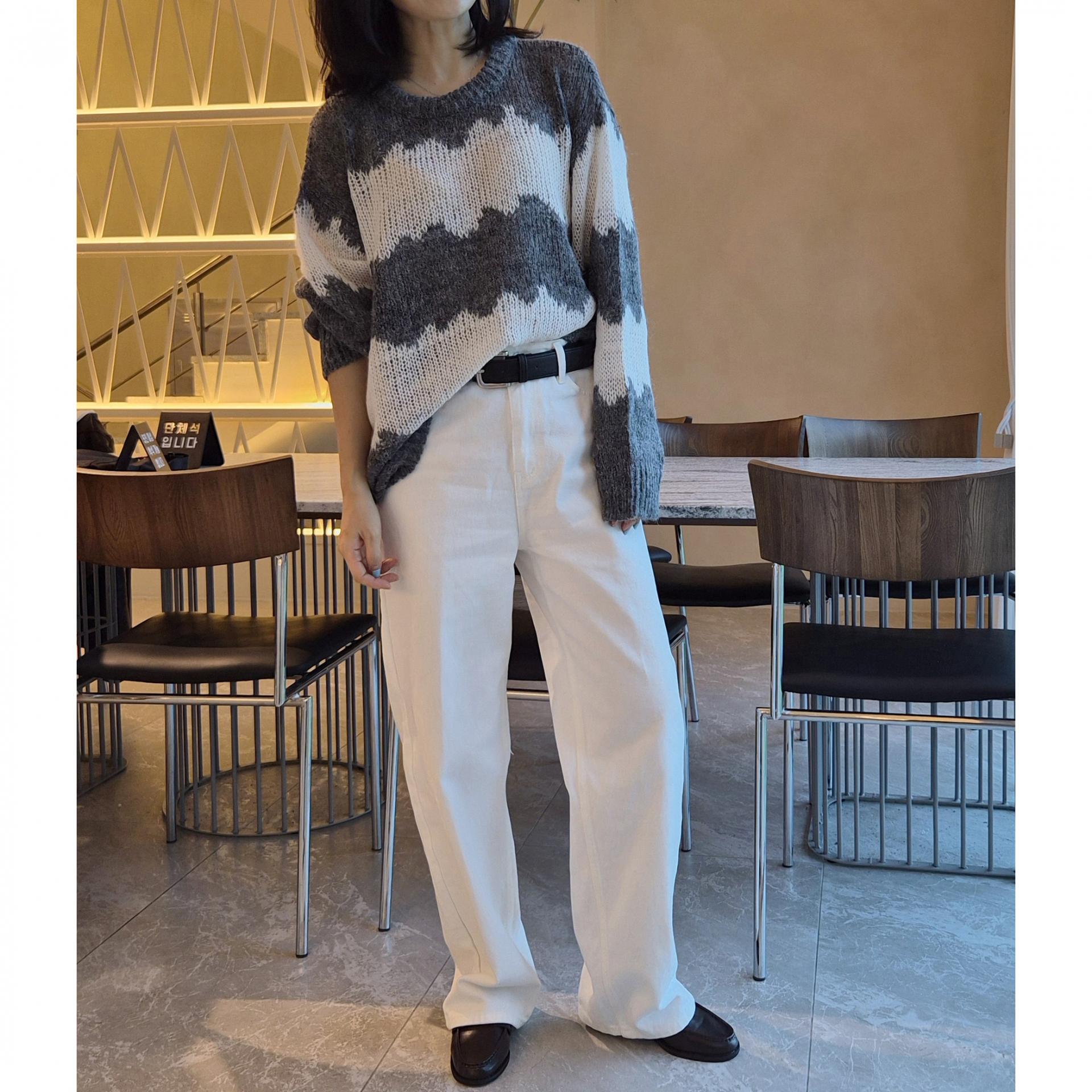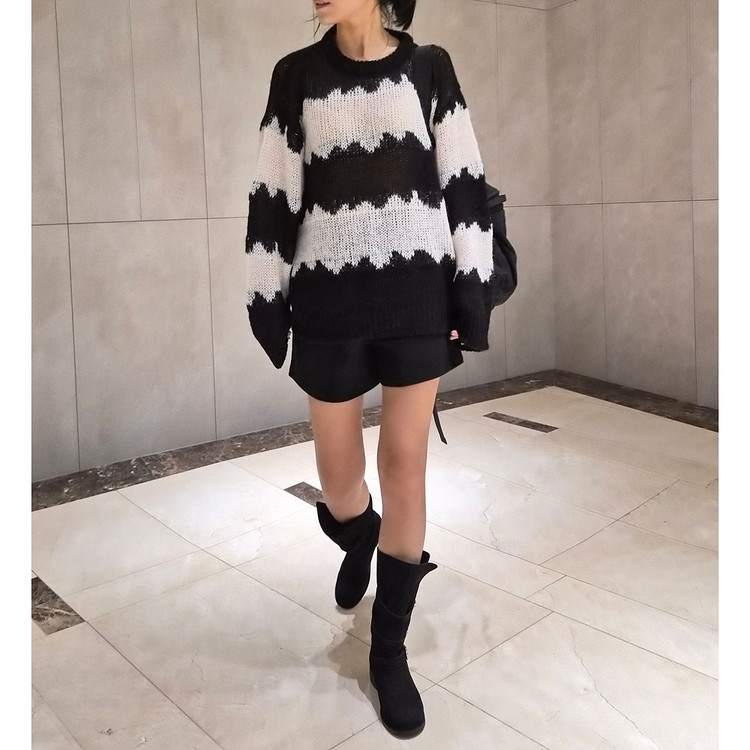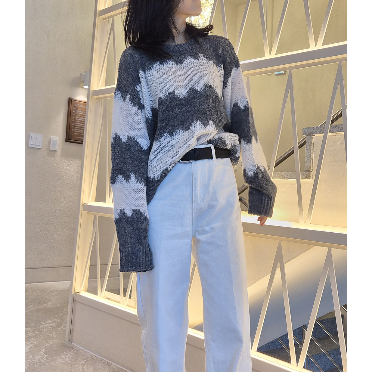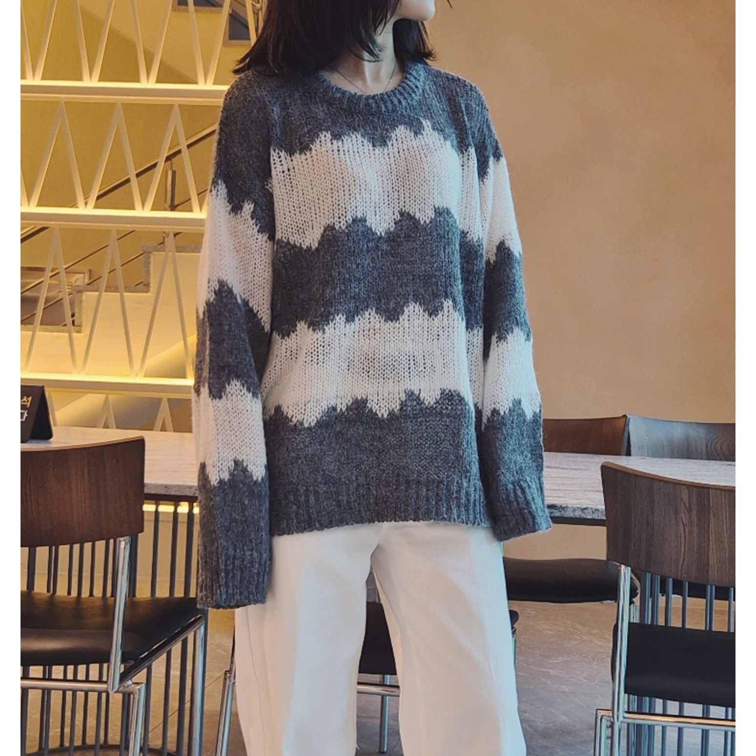 물결 배색 루즈핏 알파카 니트