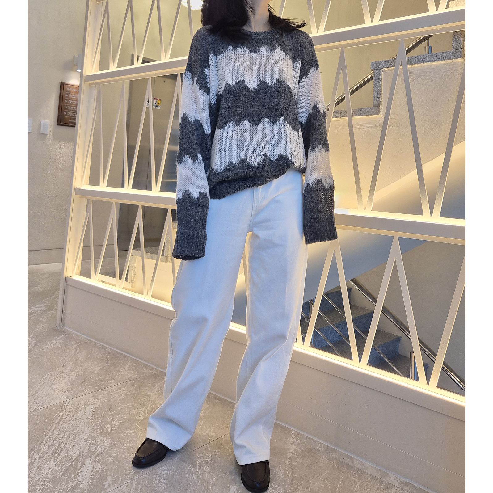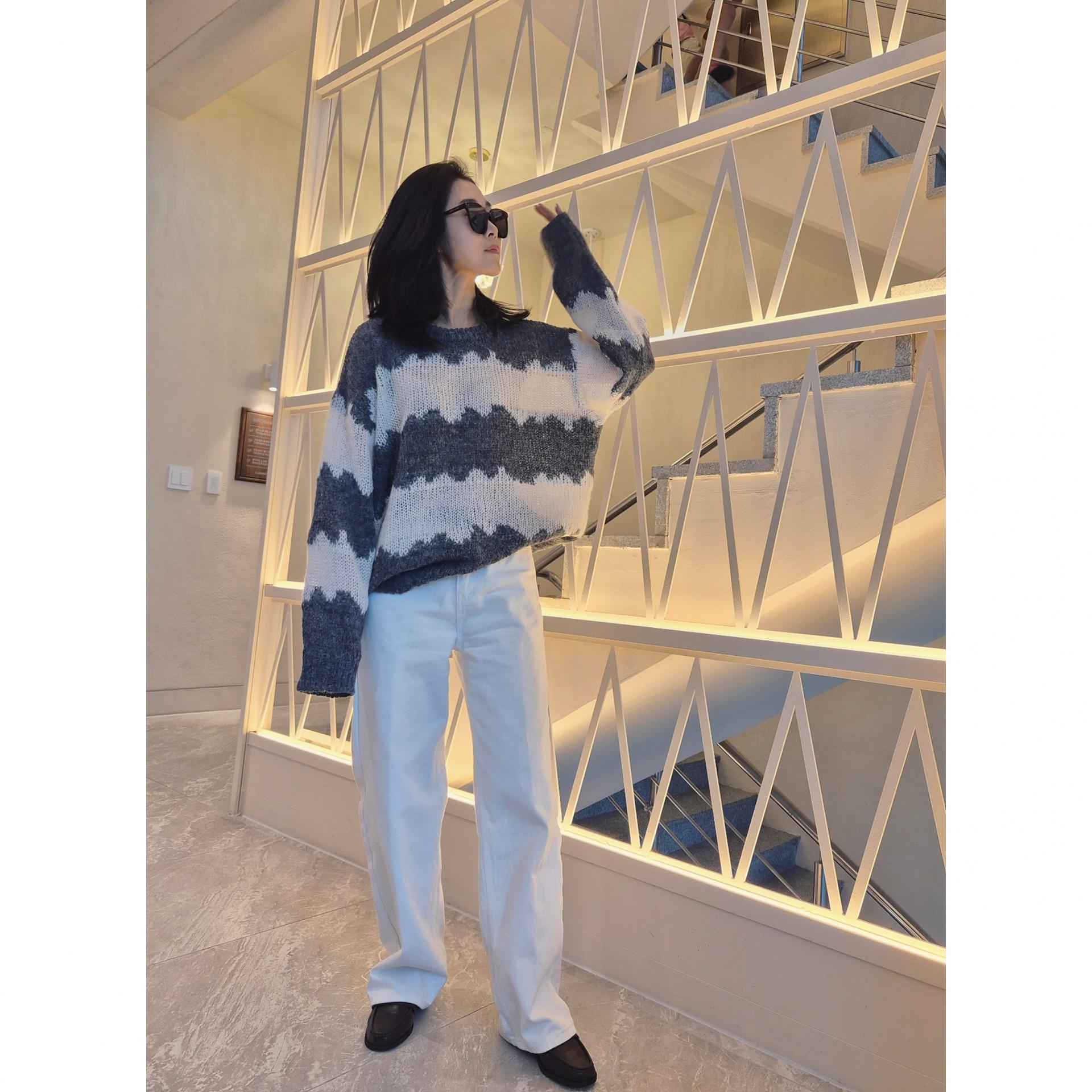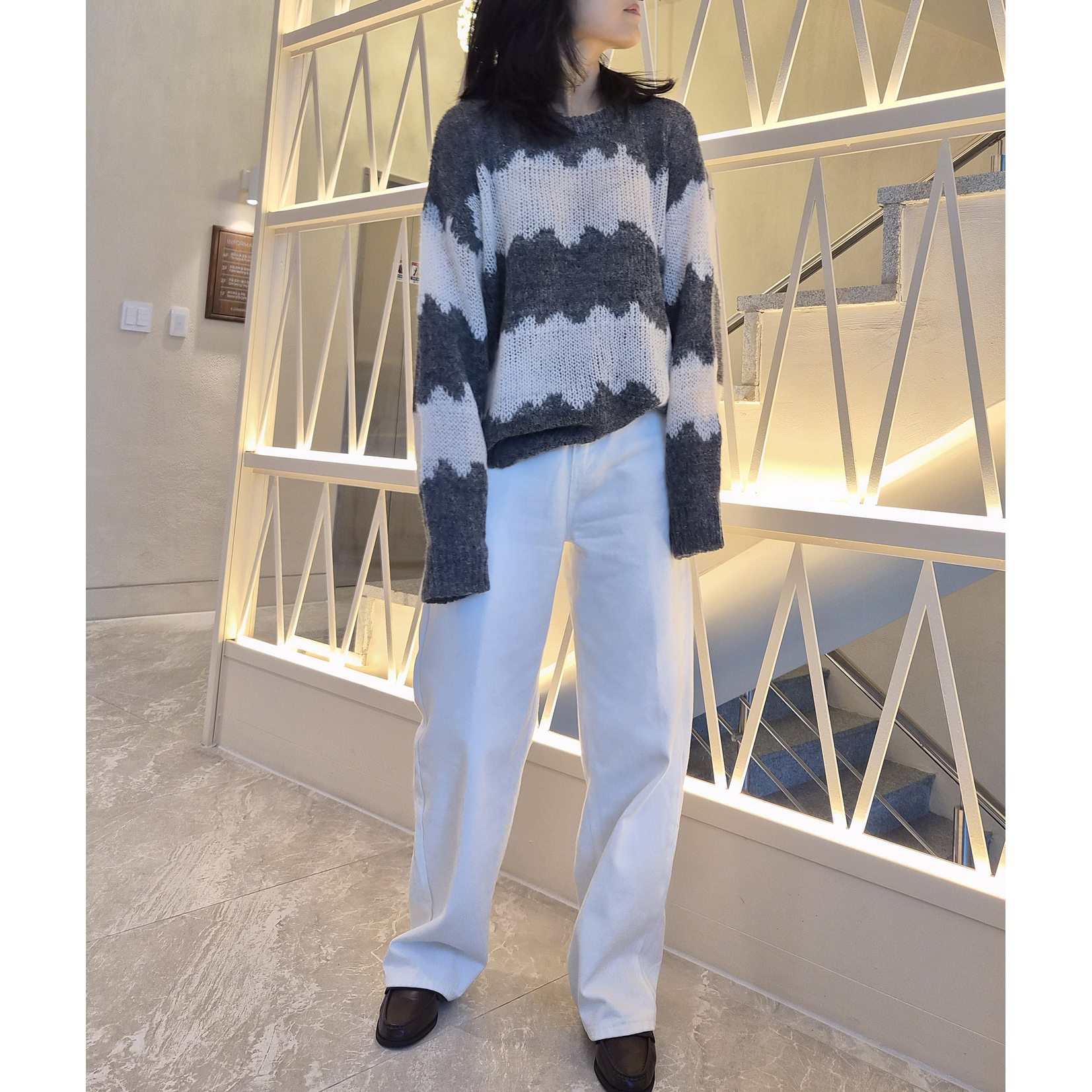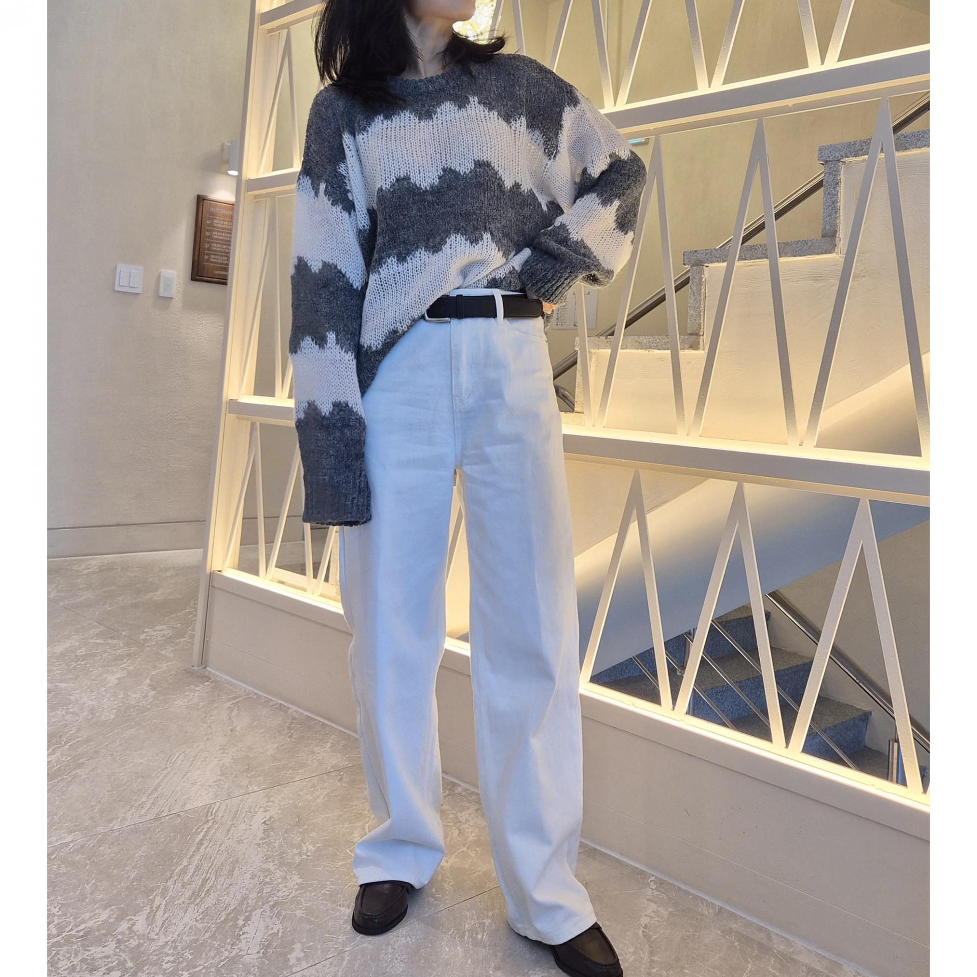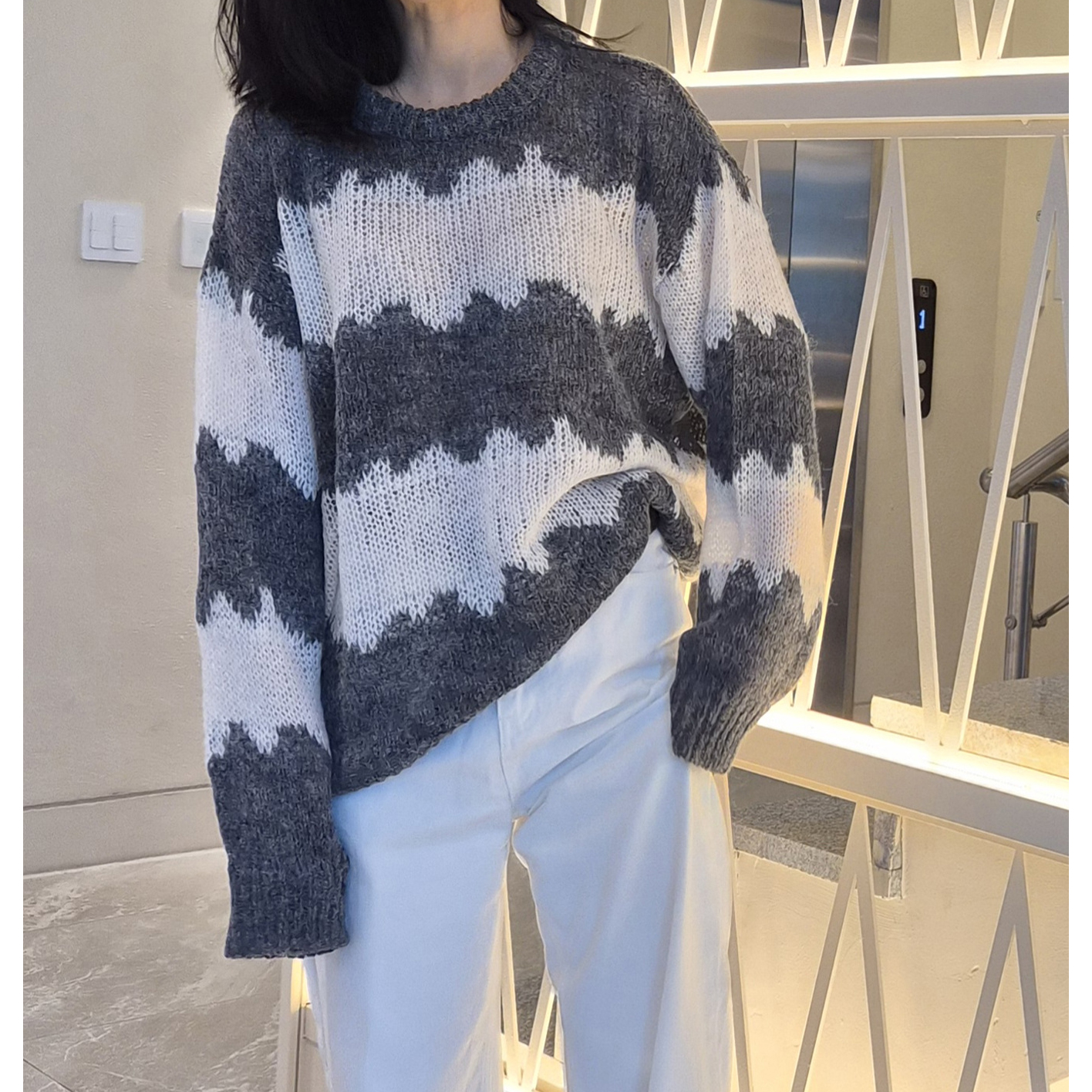 물결 배색 루즈핏 알파카 니트