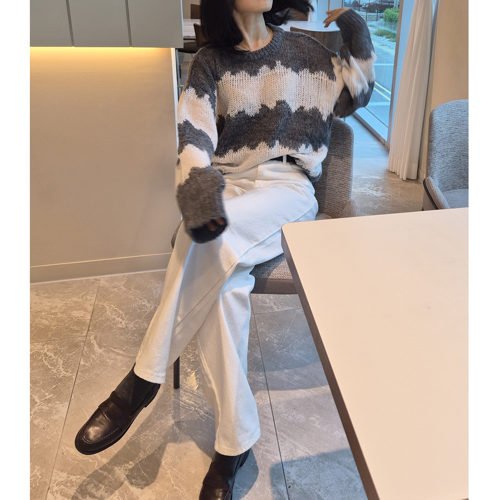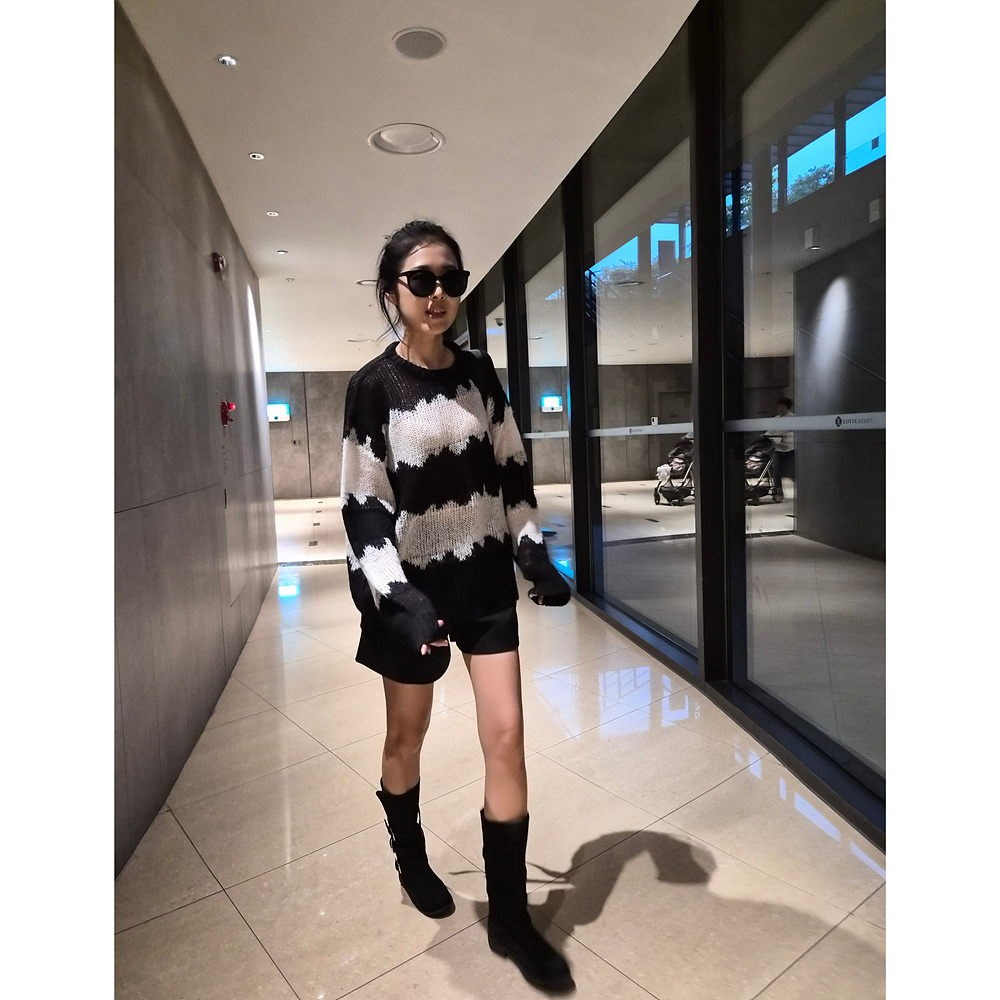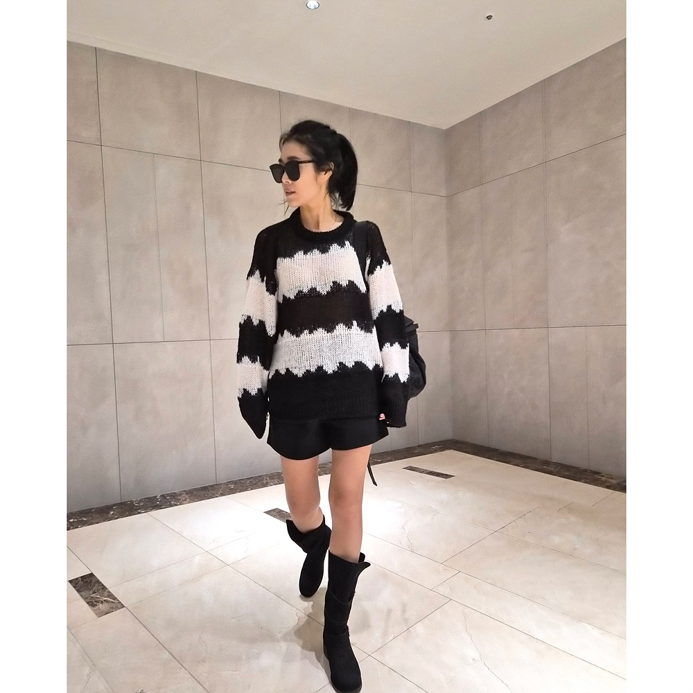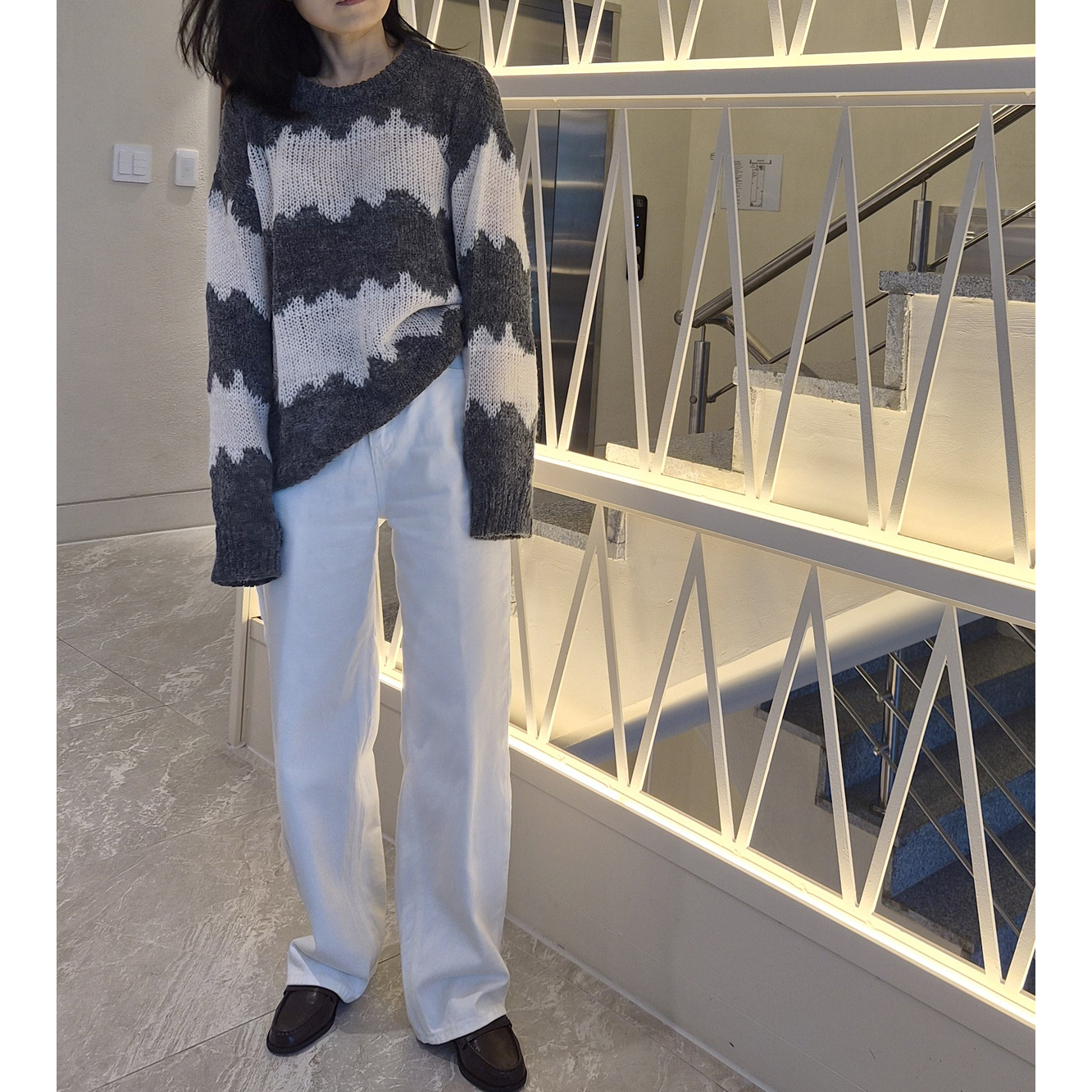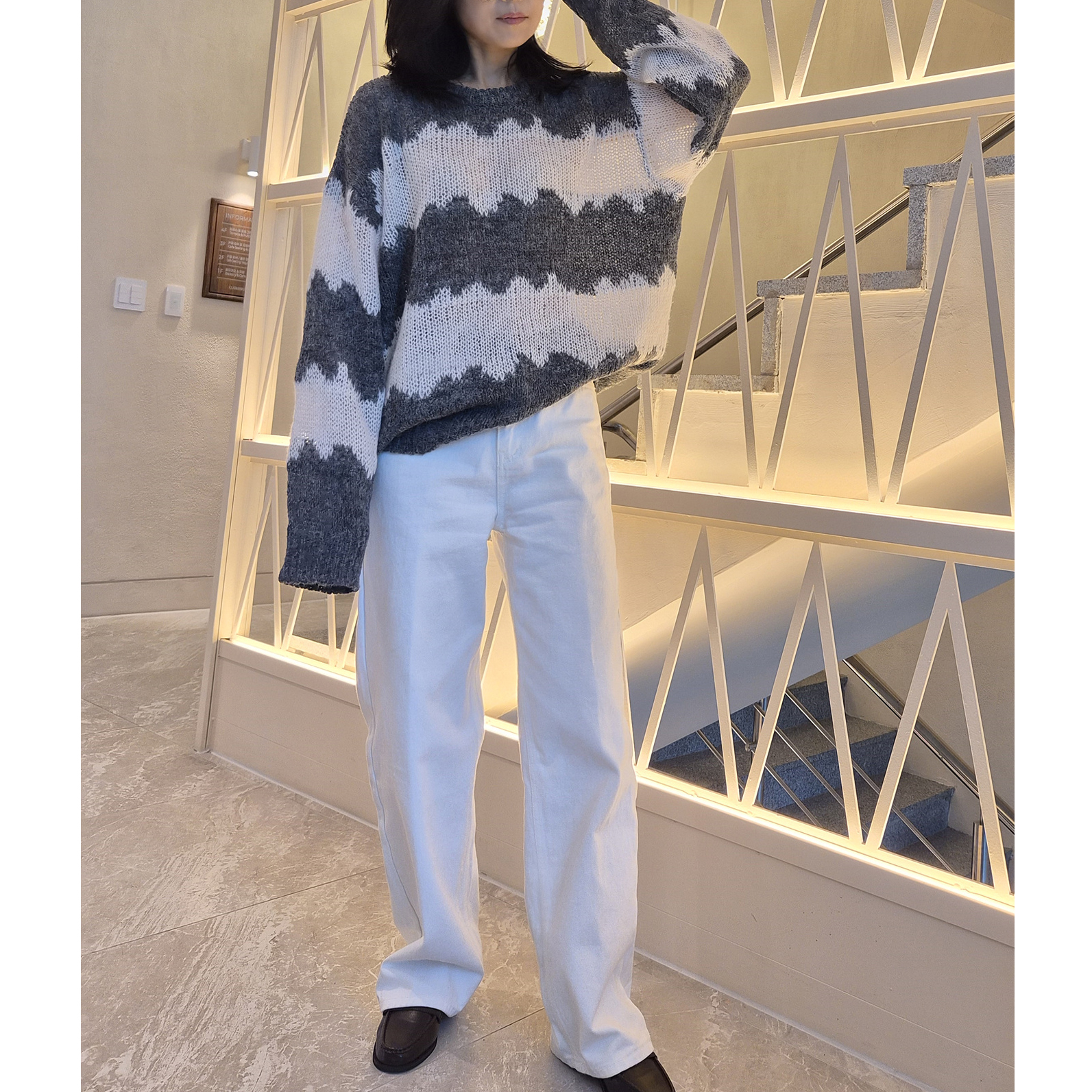 물결 배색 루즈핏 알파카 니트