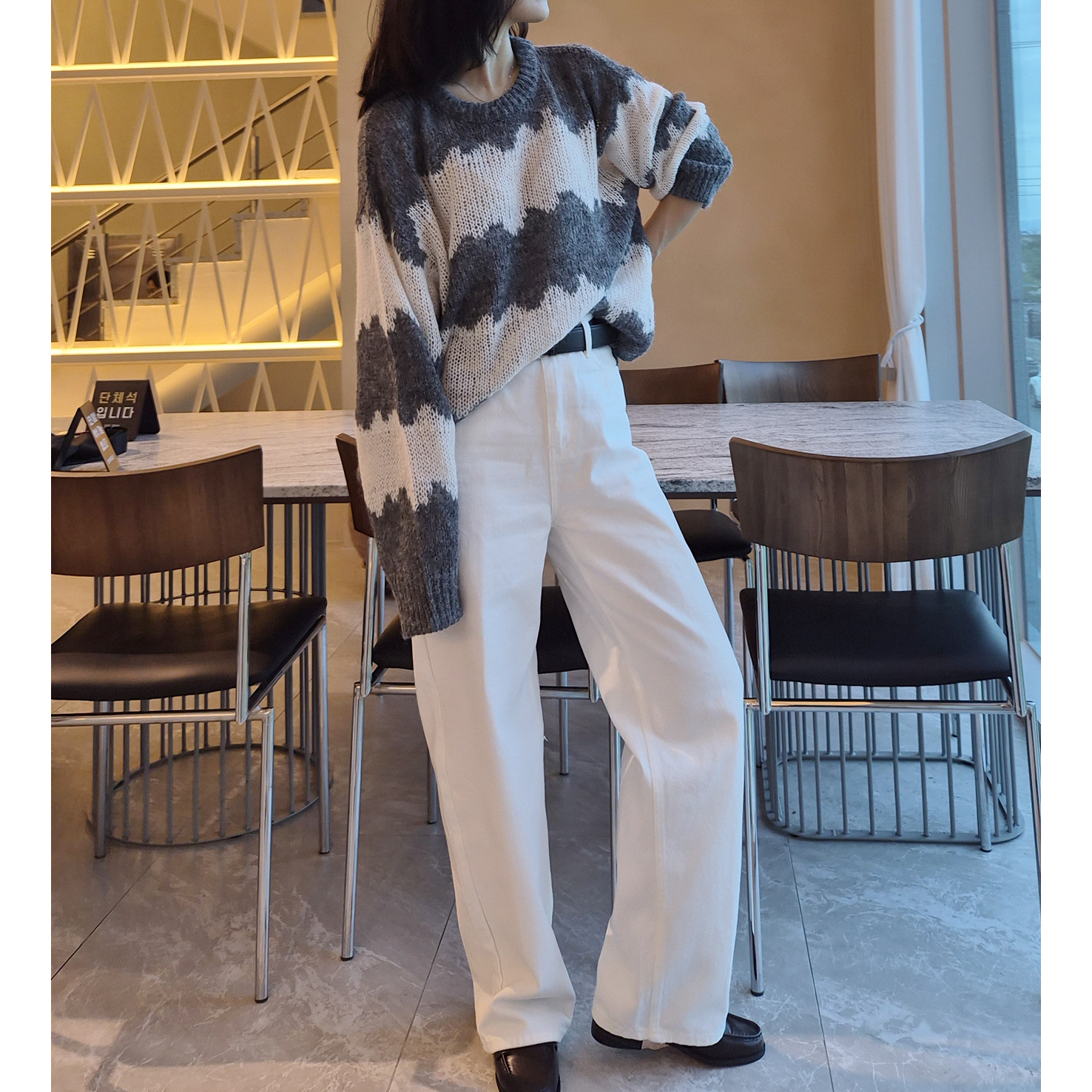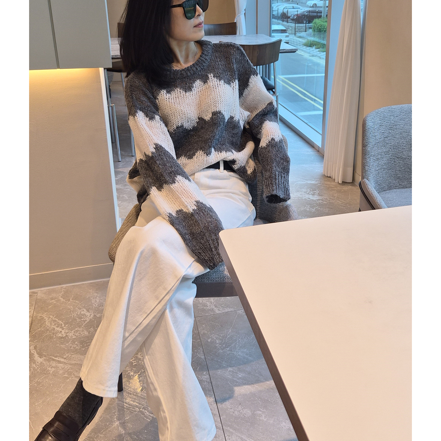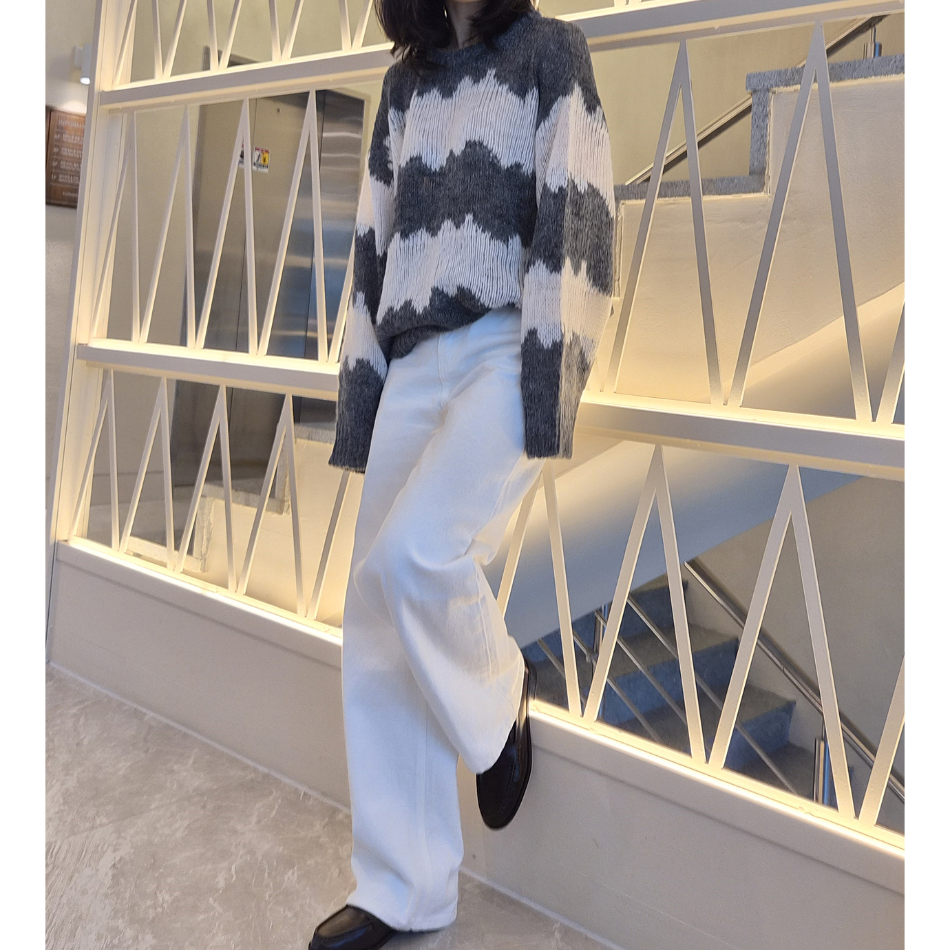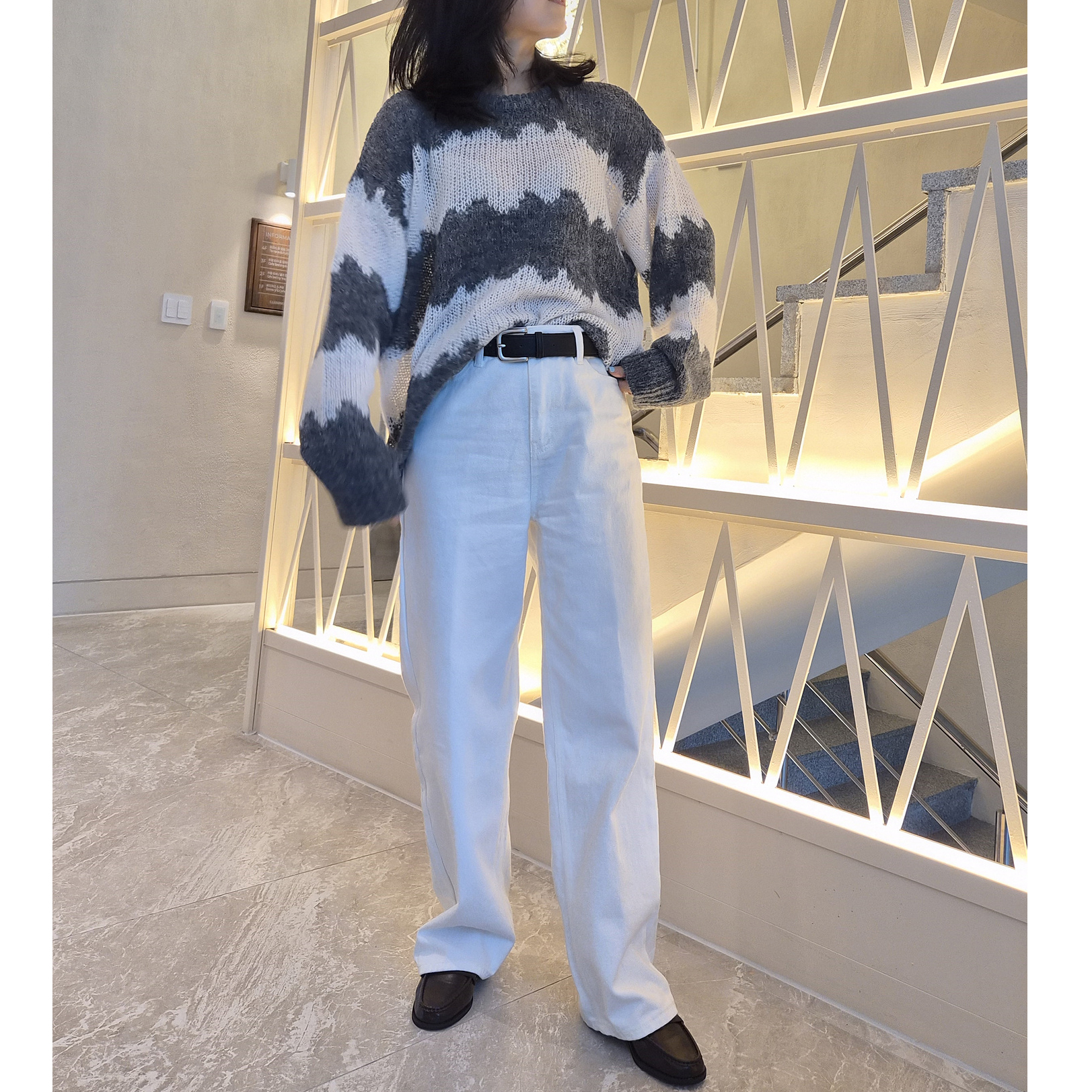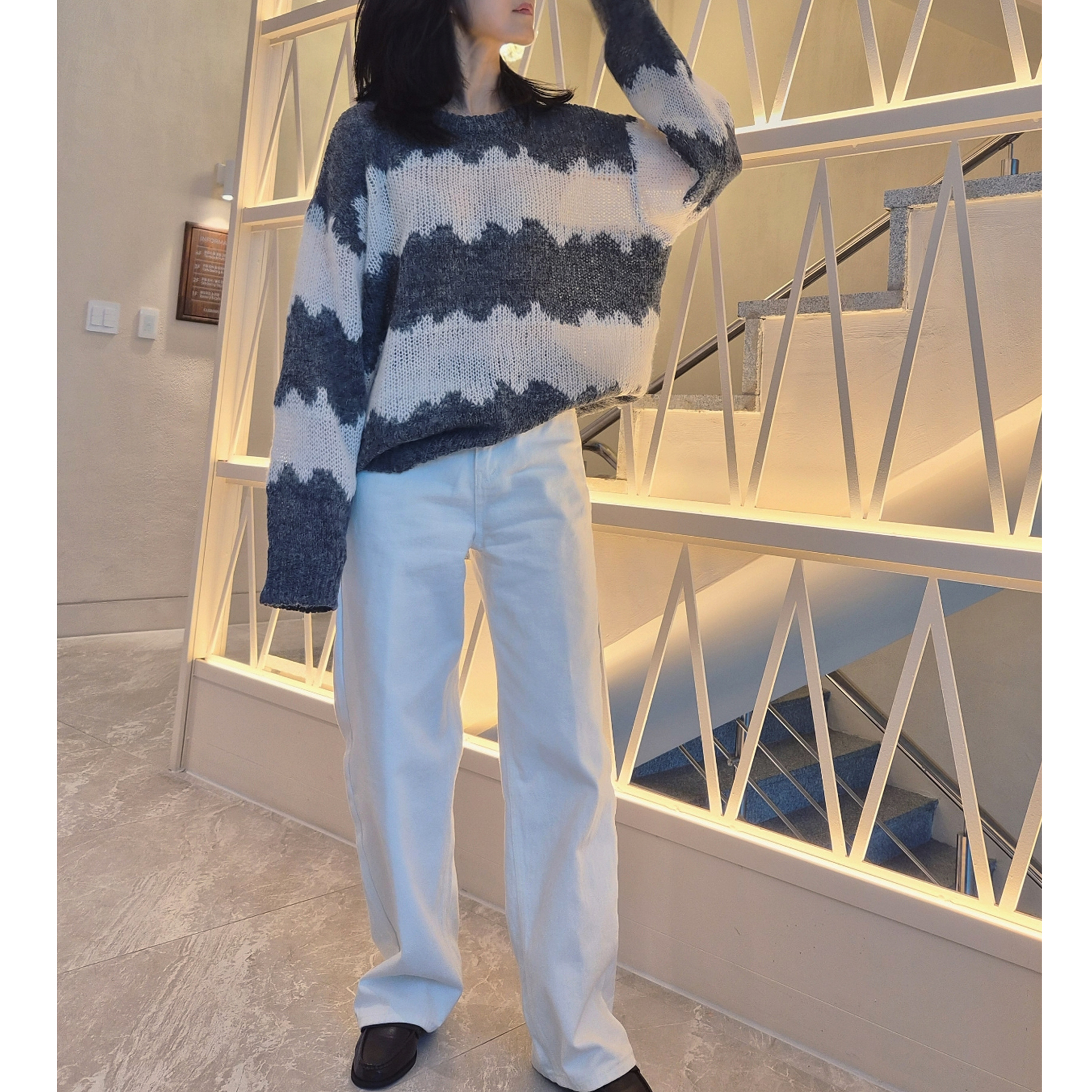 물결 배색 루즈핏 알파카 니트