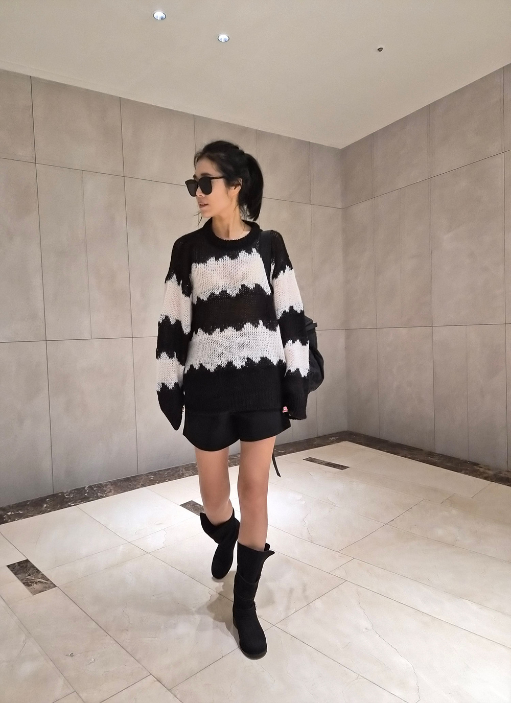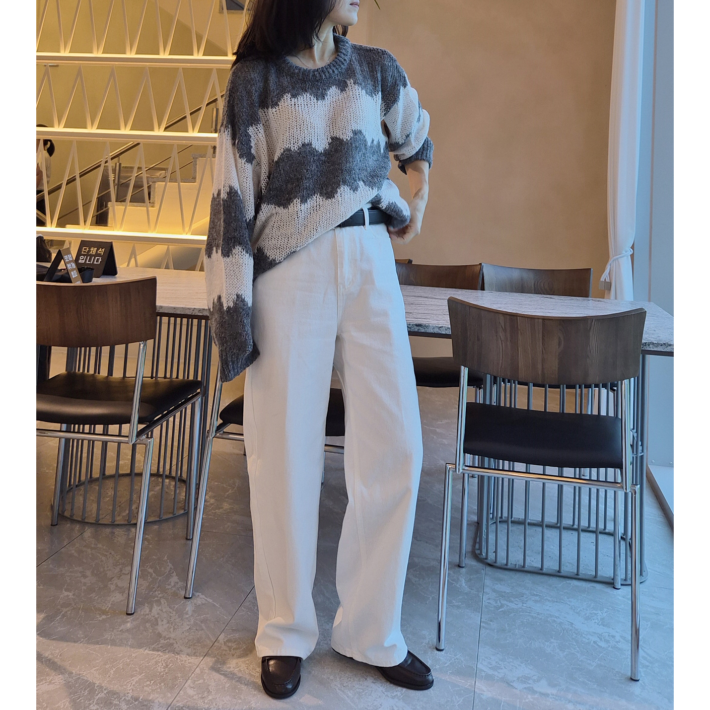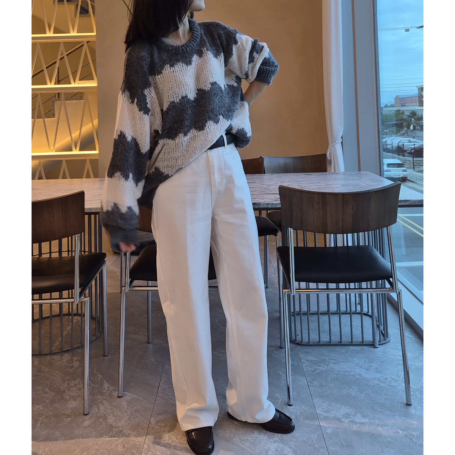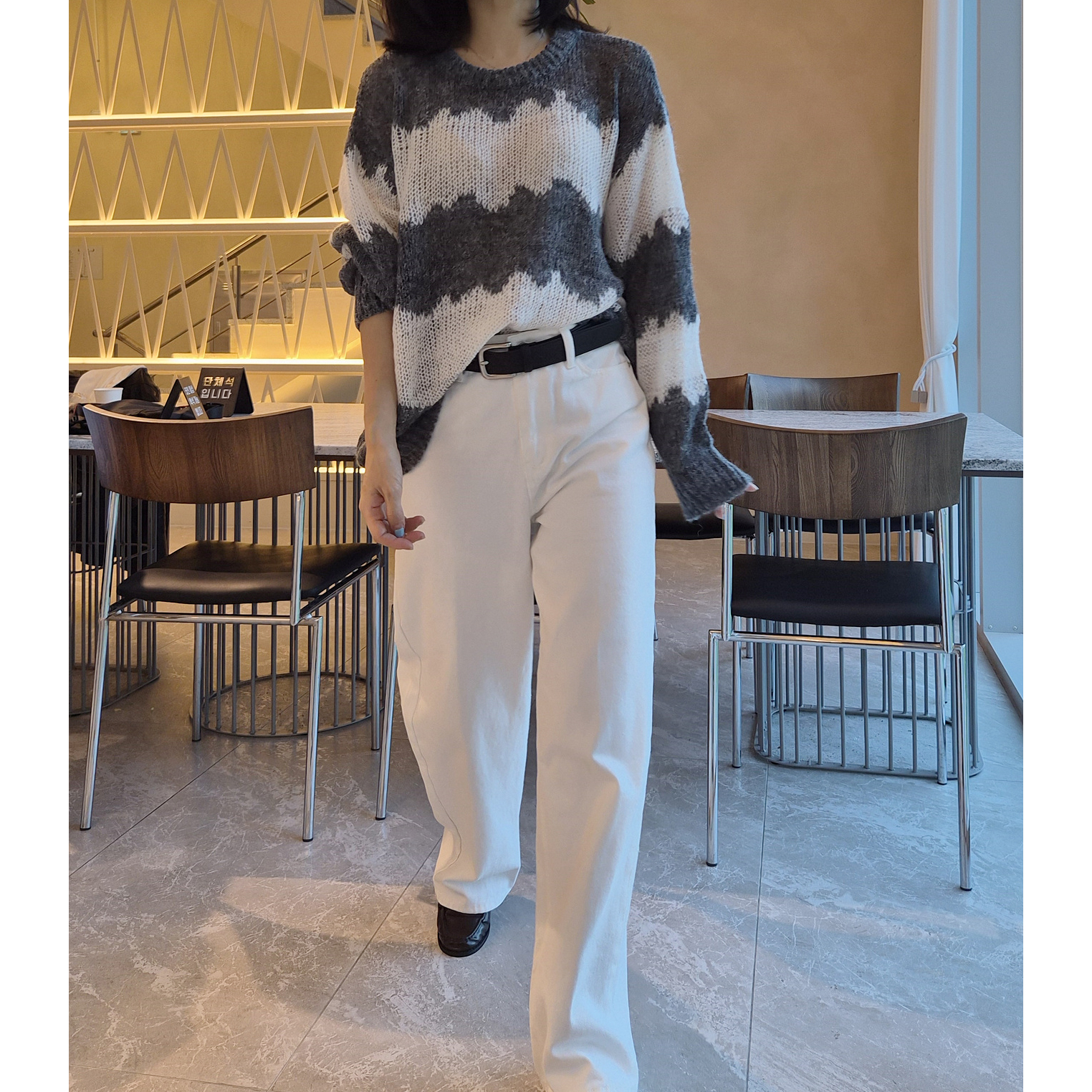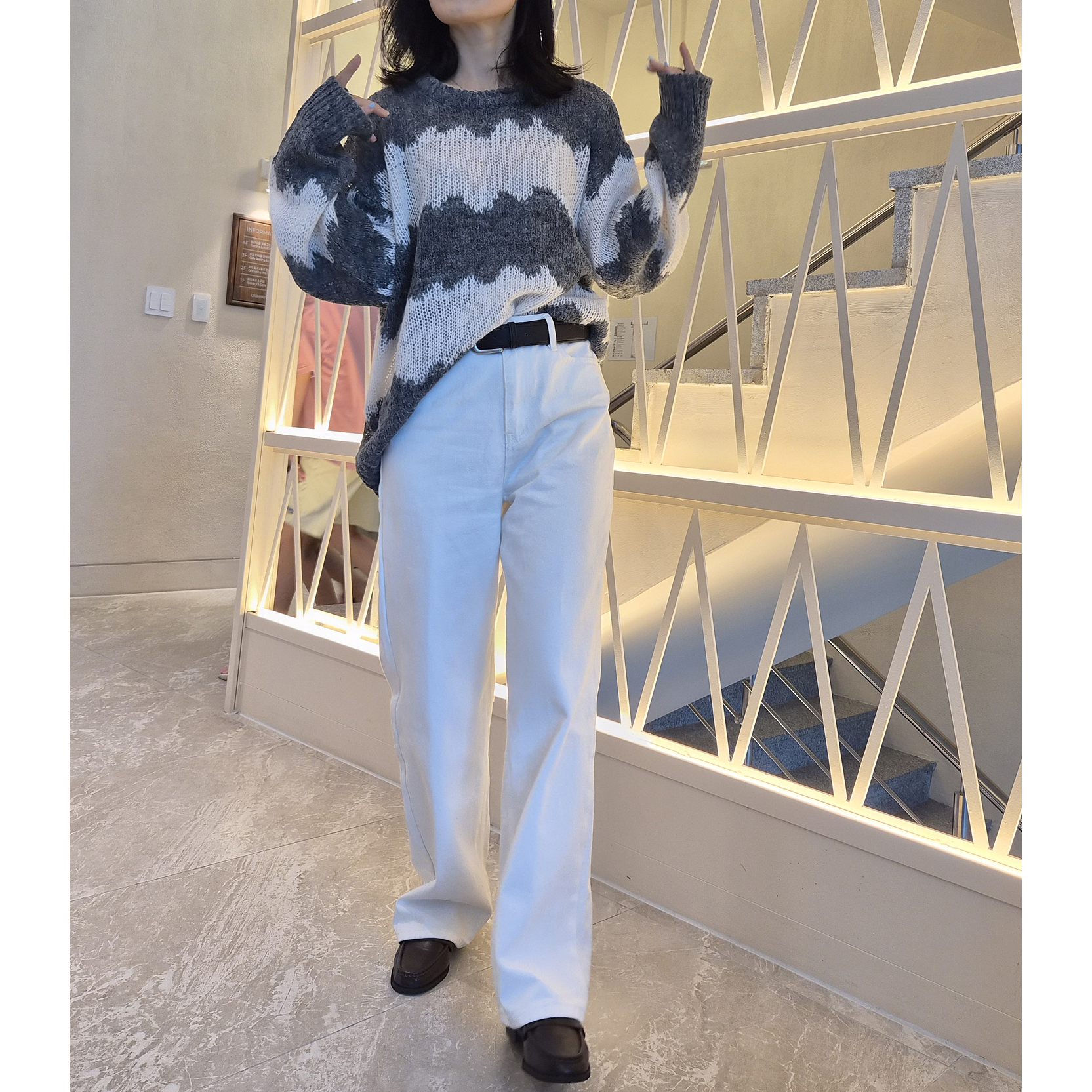 물결 배색 루즈핏 알파카 니트