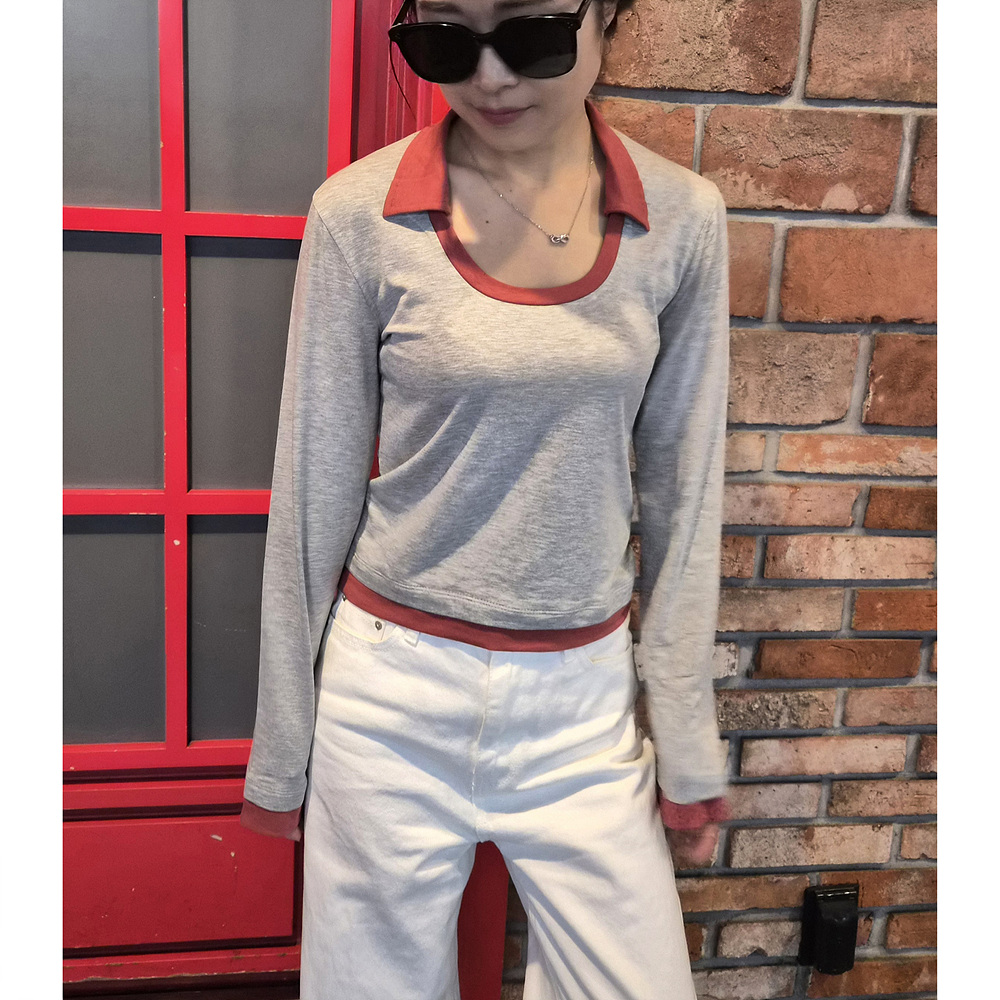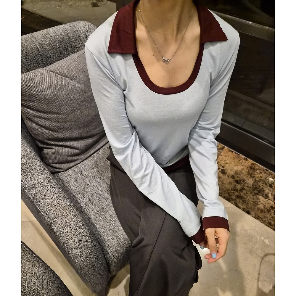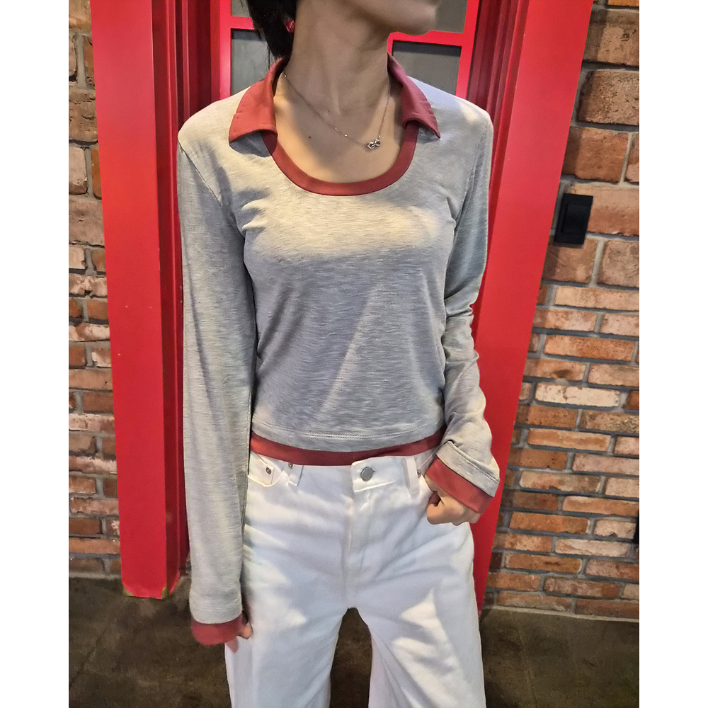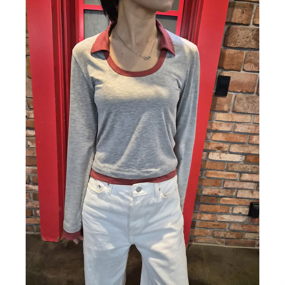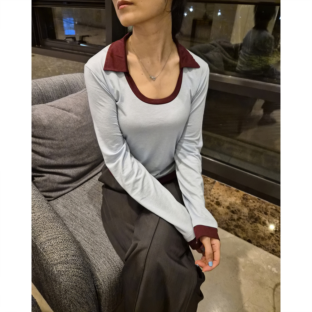 로즈 배색 카라 유넥 긴팔 티셔츠