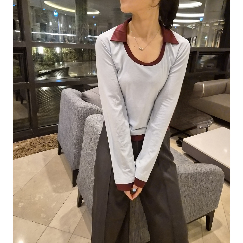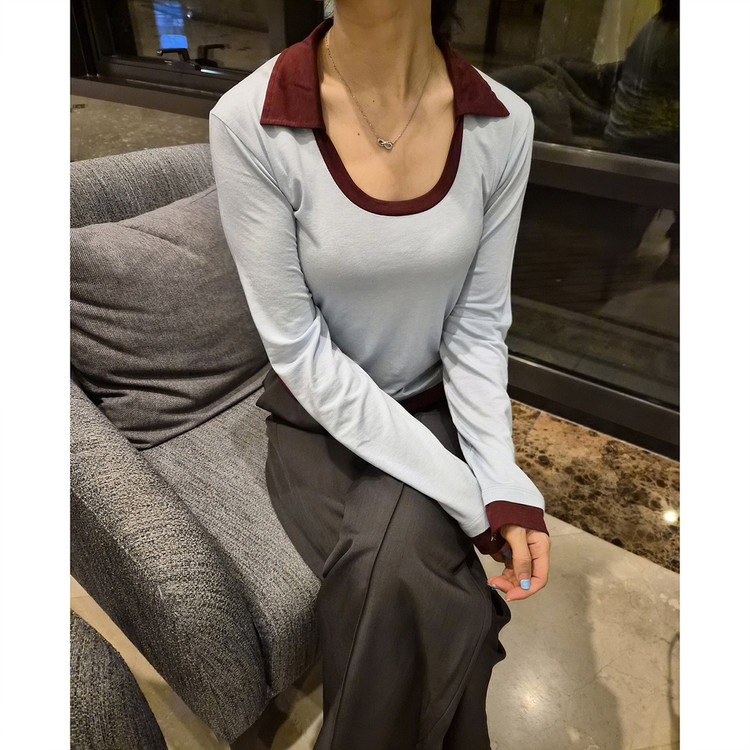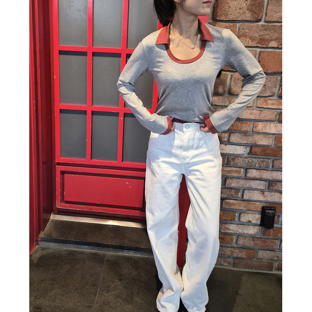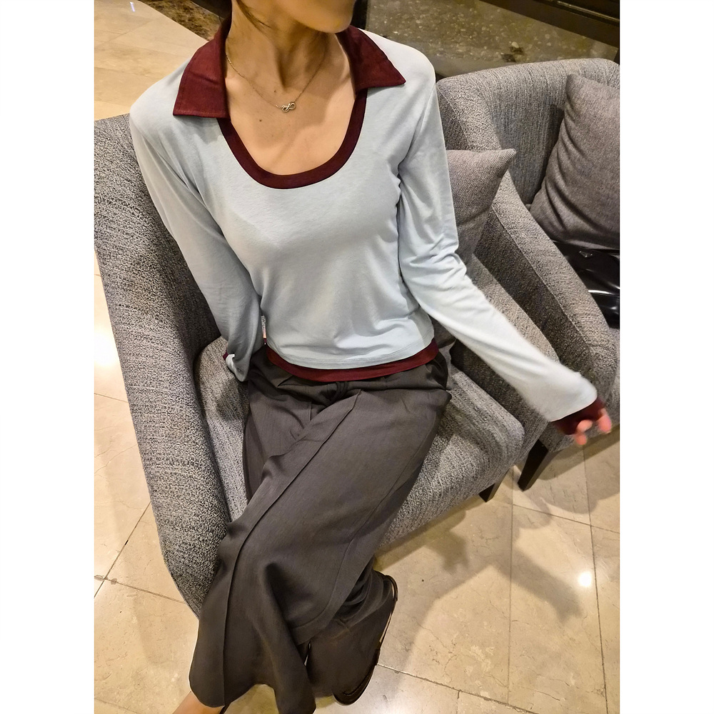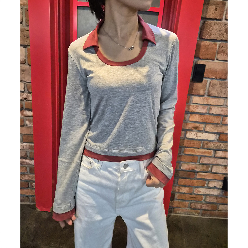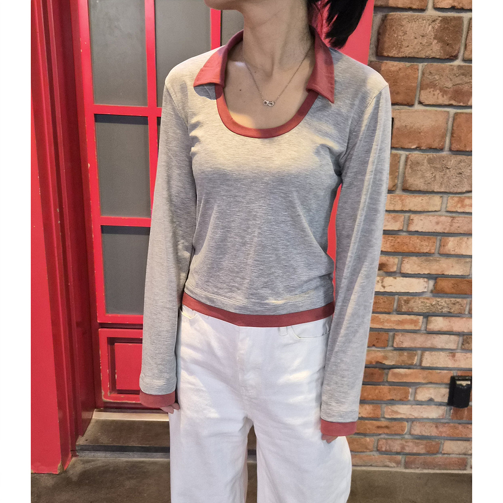 로즈 배색 카라 유넥 긴팔 티셔츠