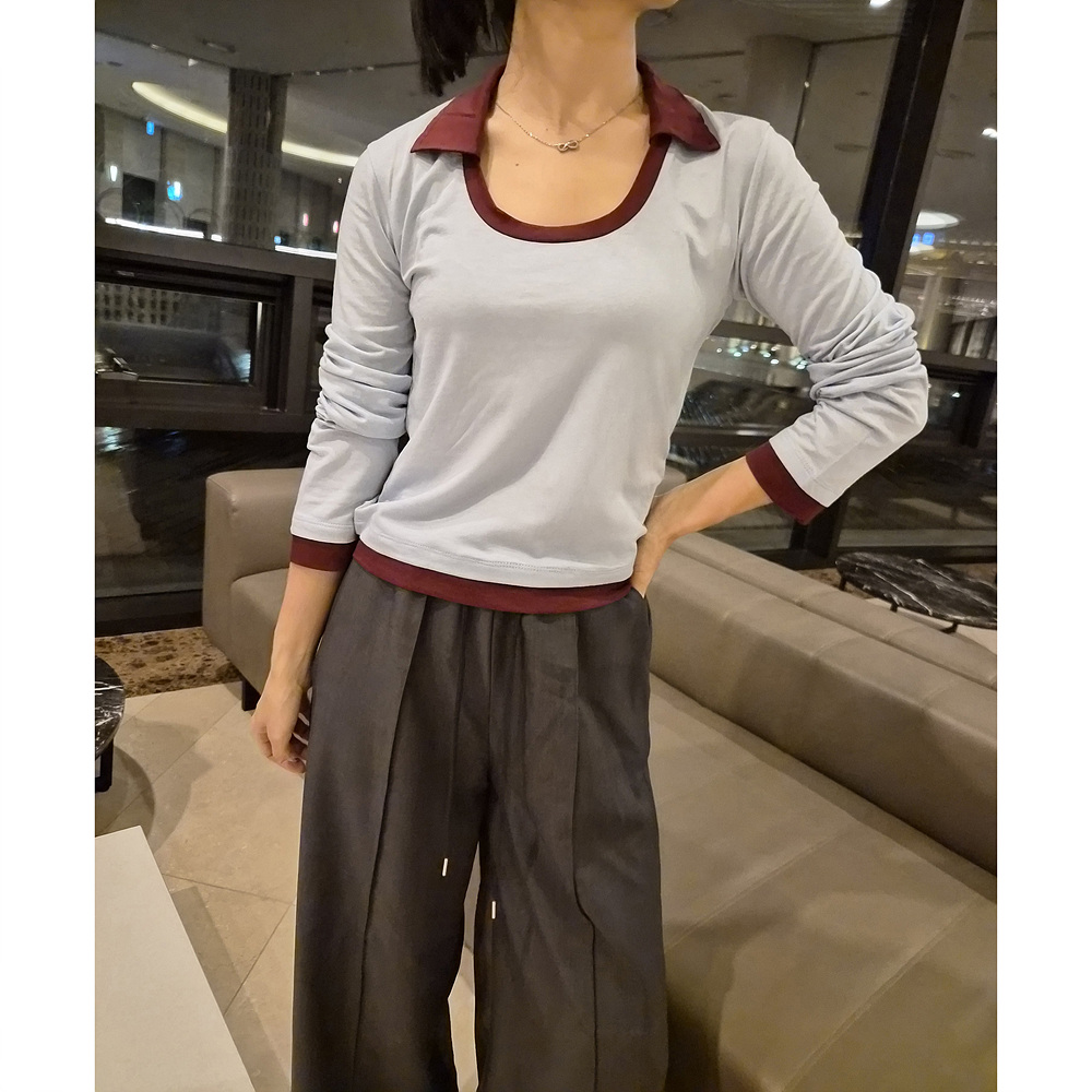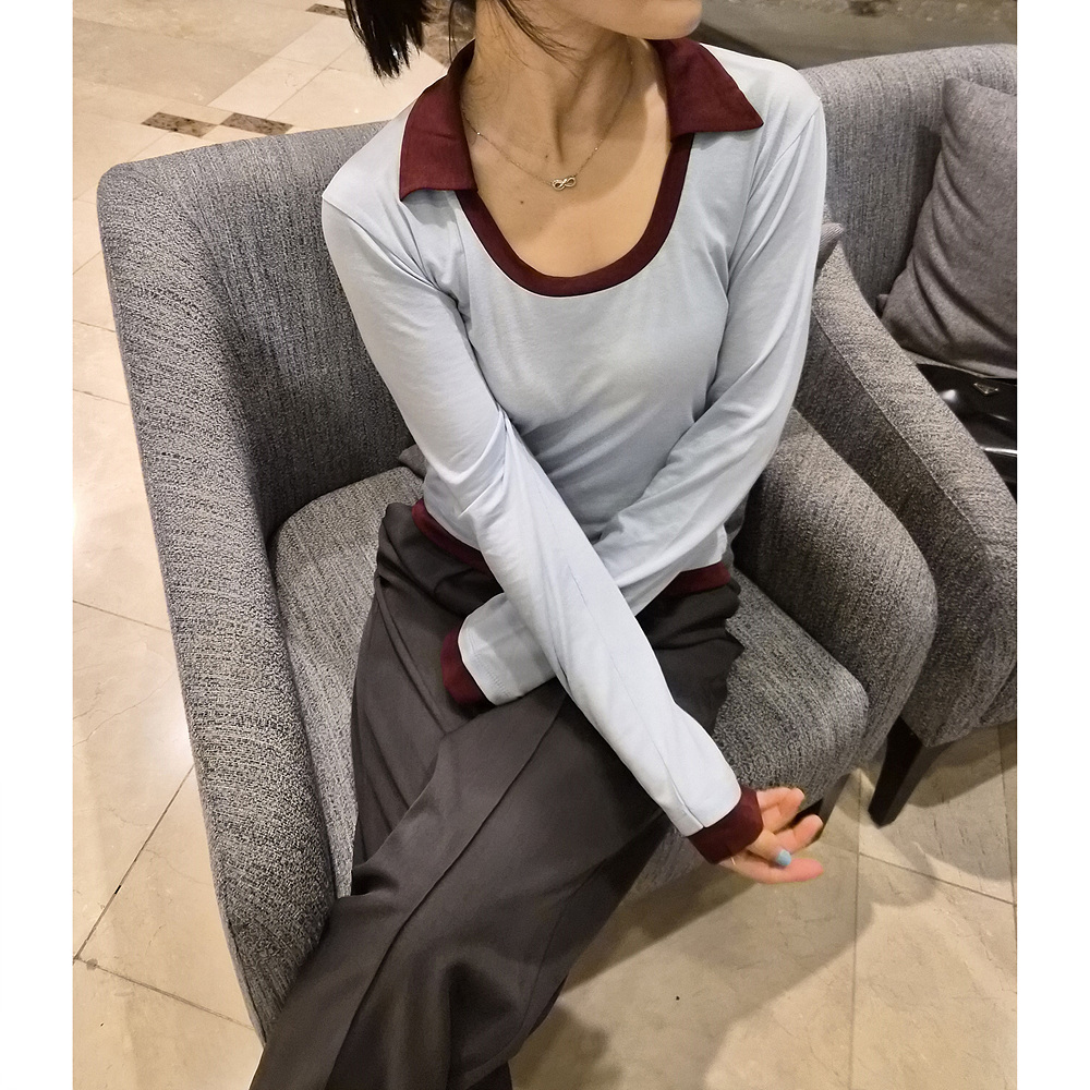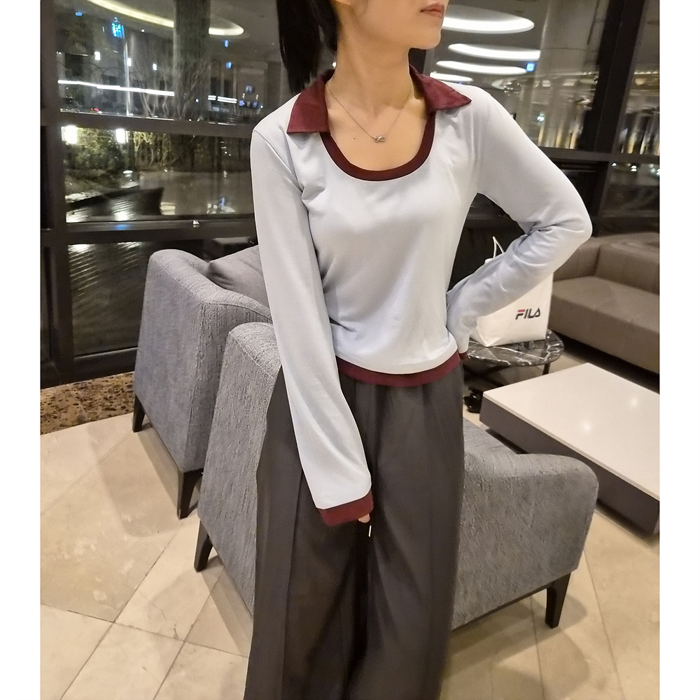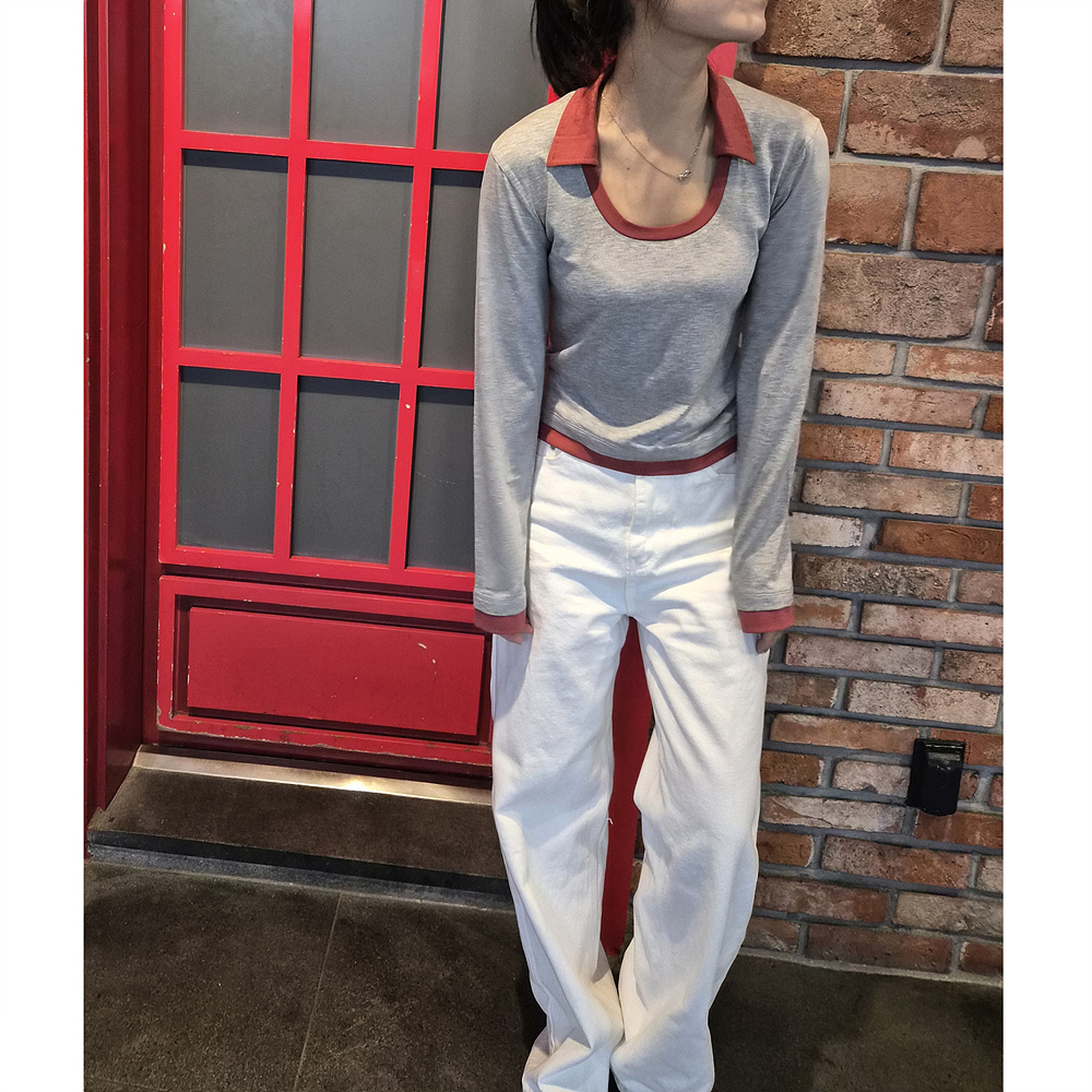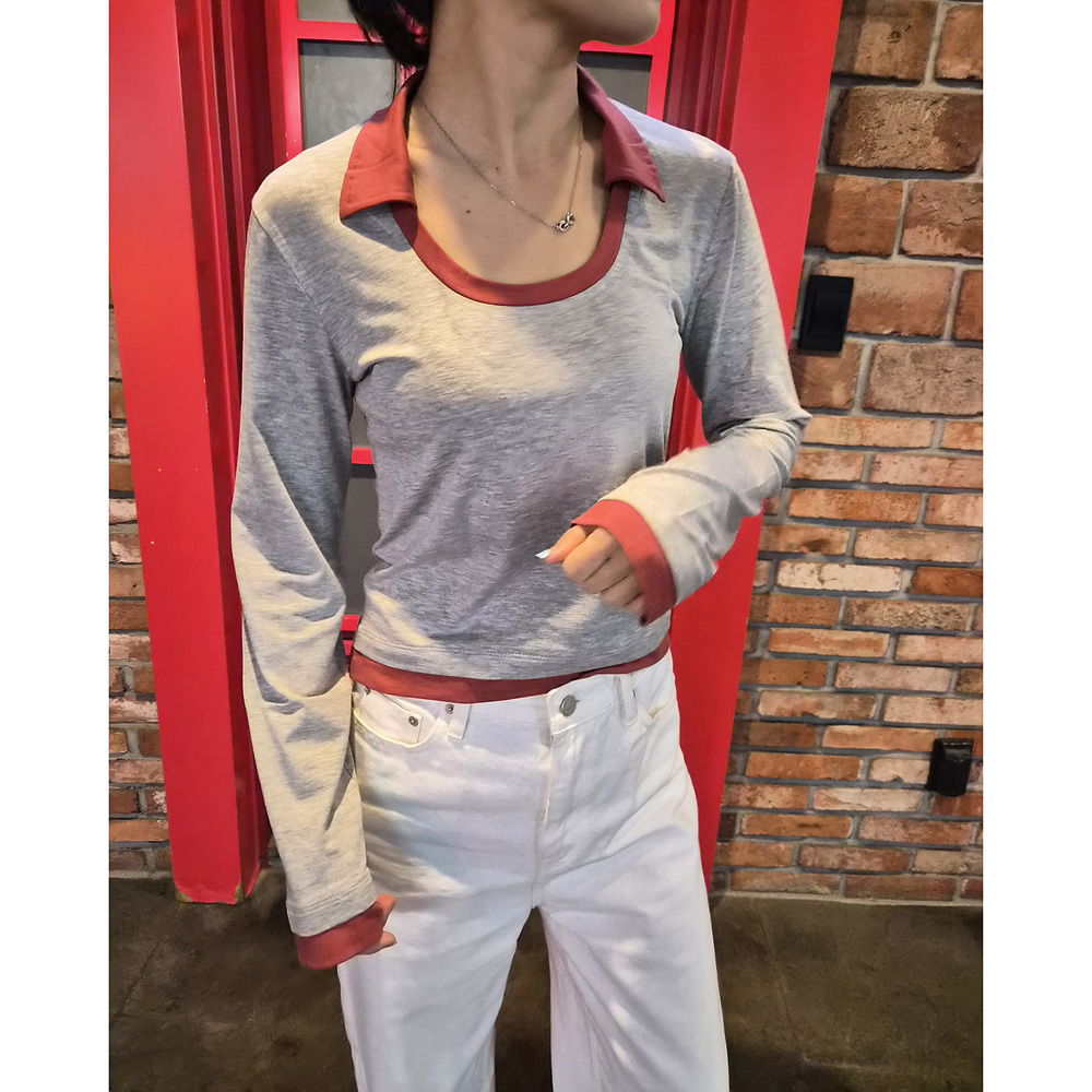 로즈 배색 카라 유넥 긴팔 티셔츠