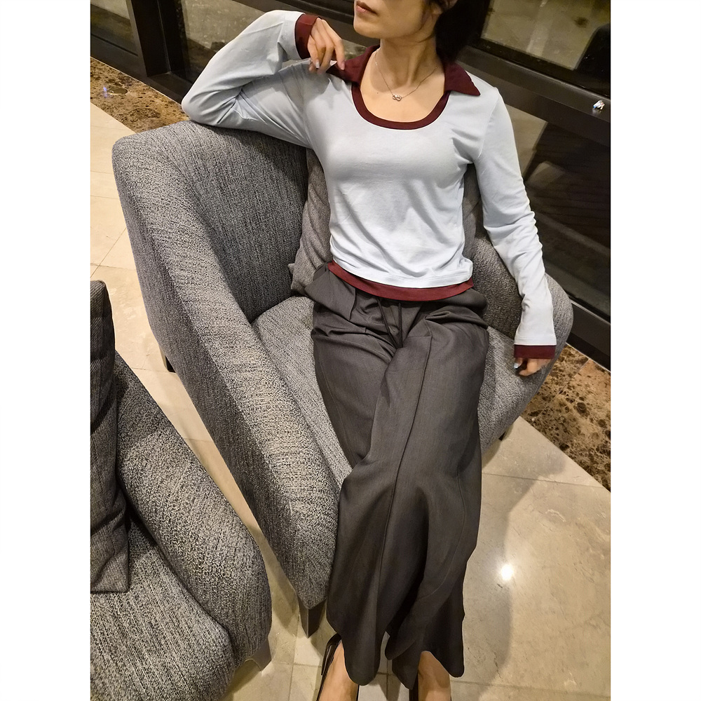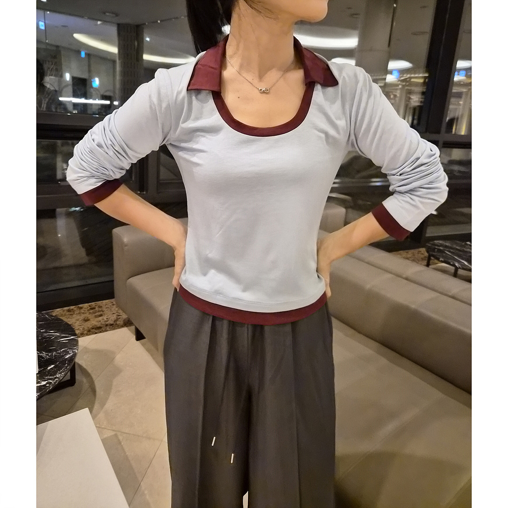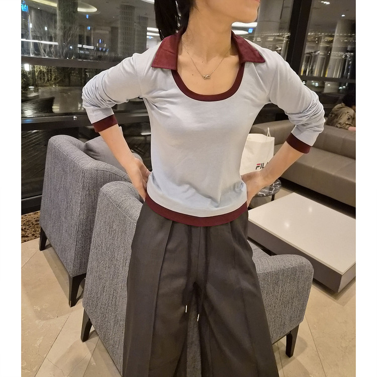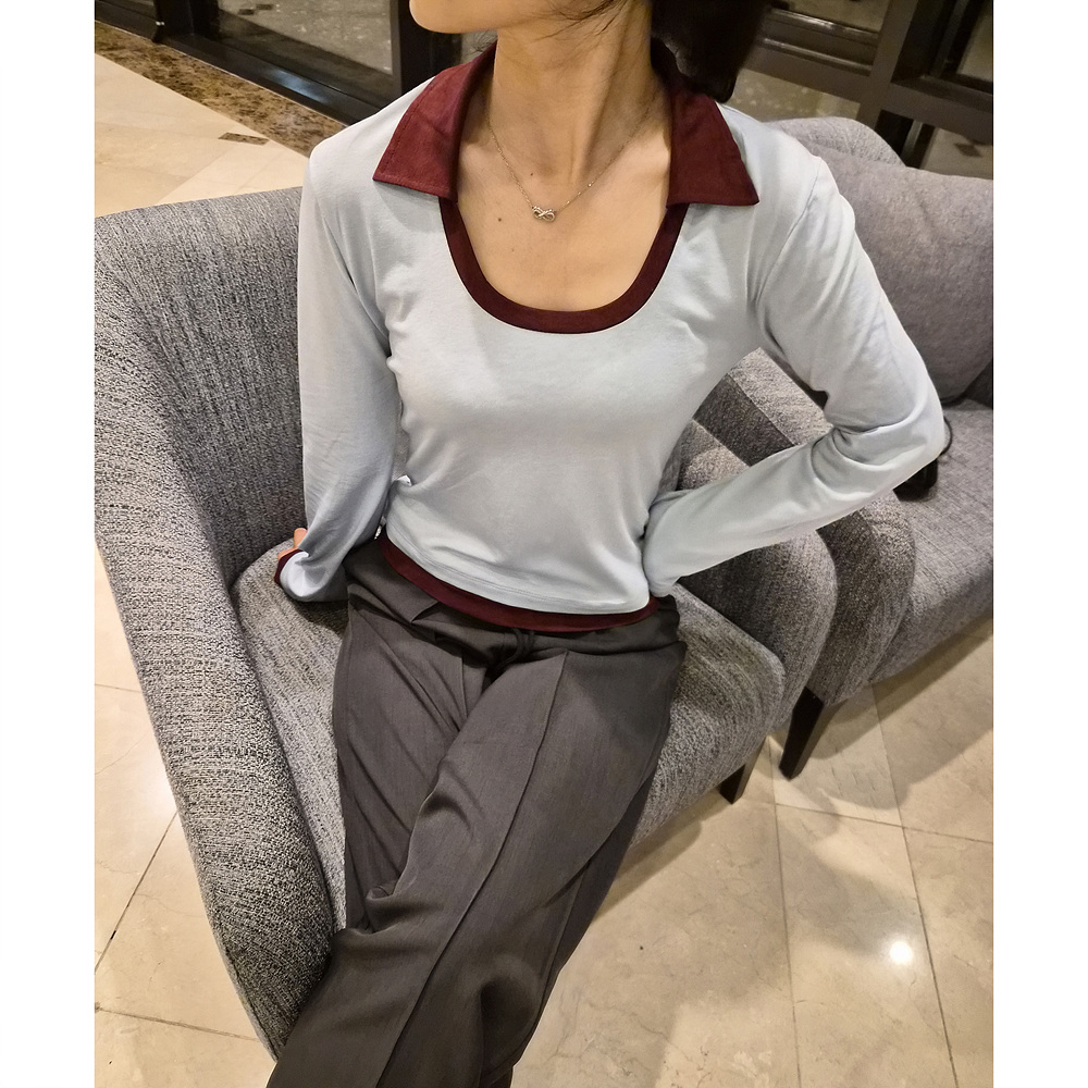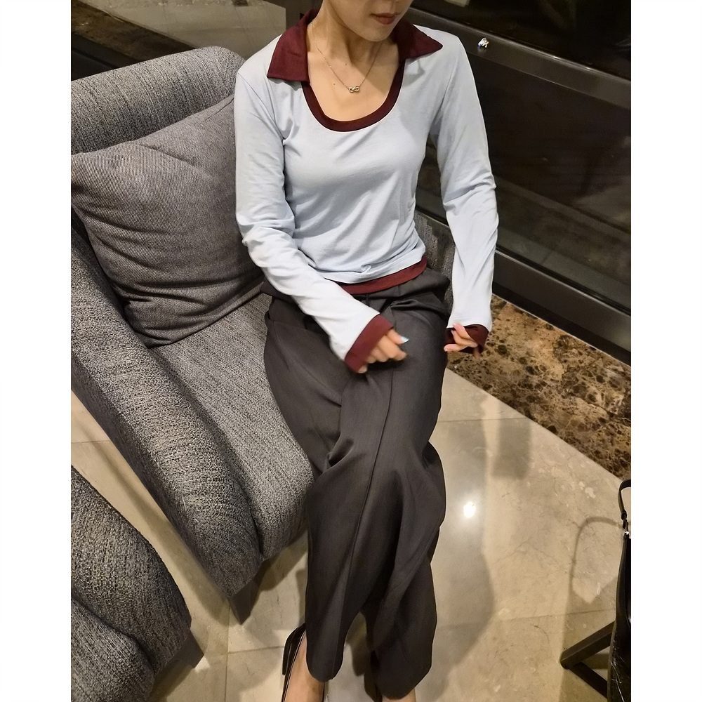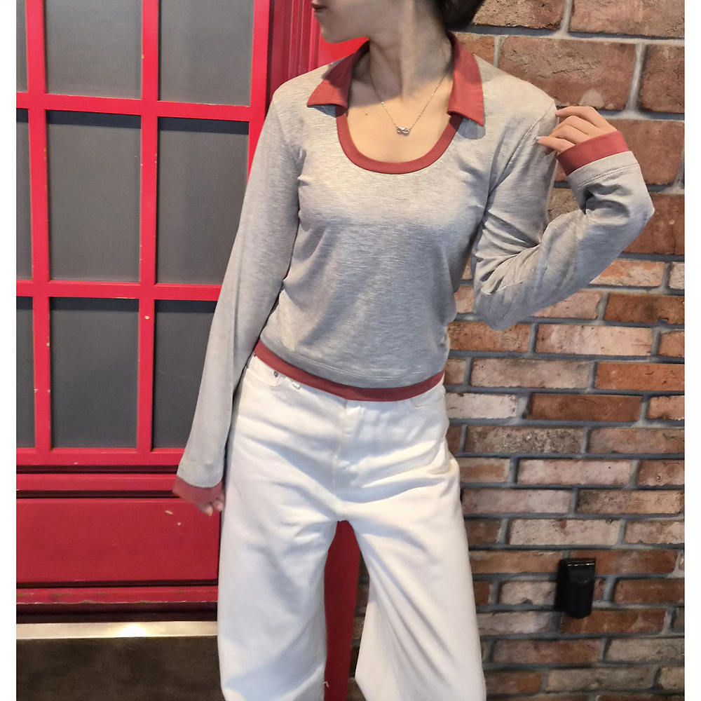로즈 배색 카라 유넥 긴팔 티셔츠