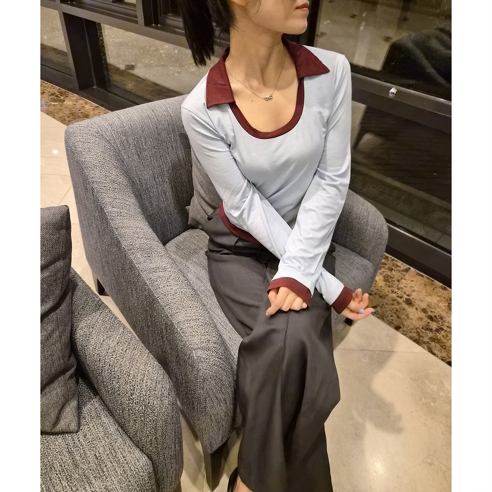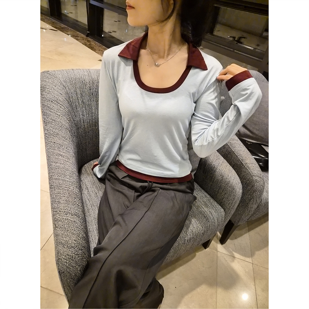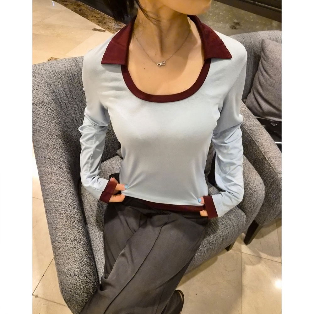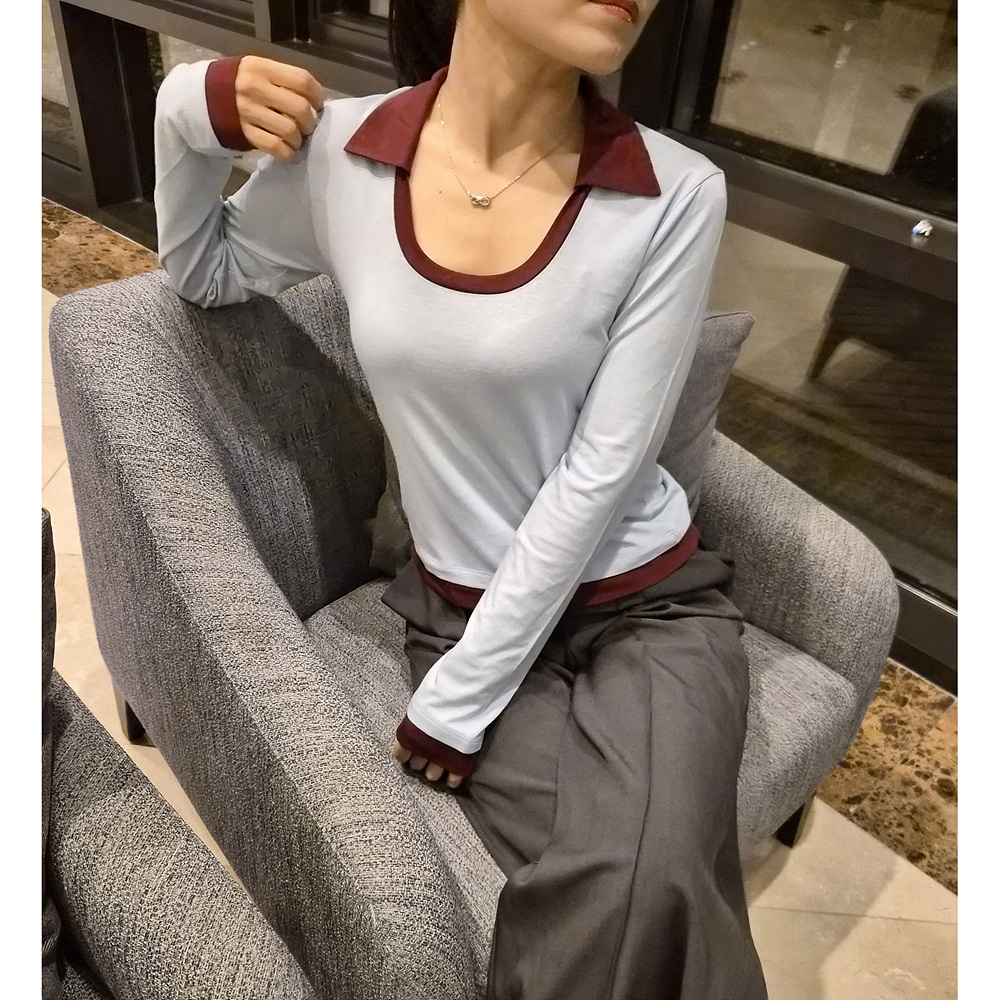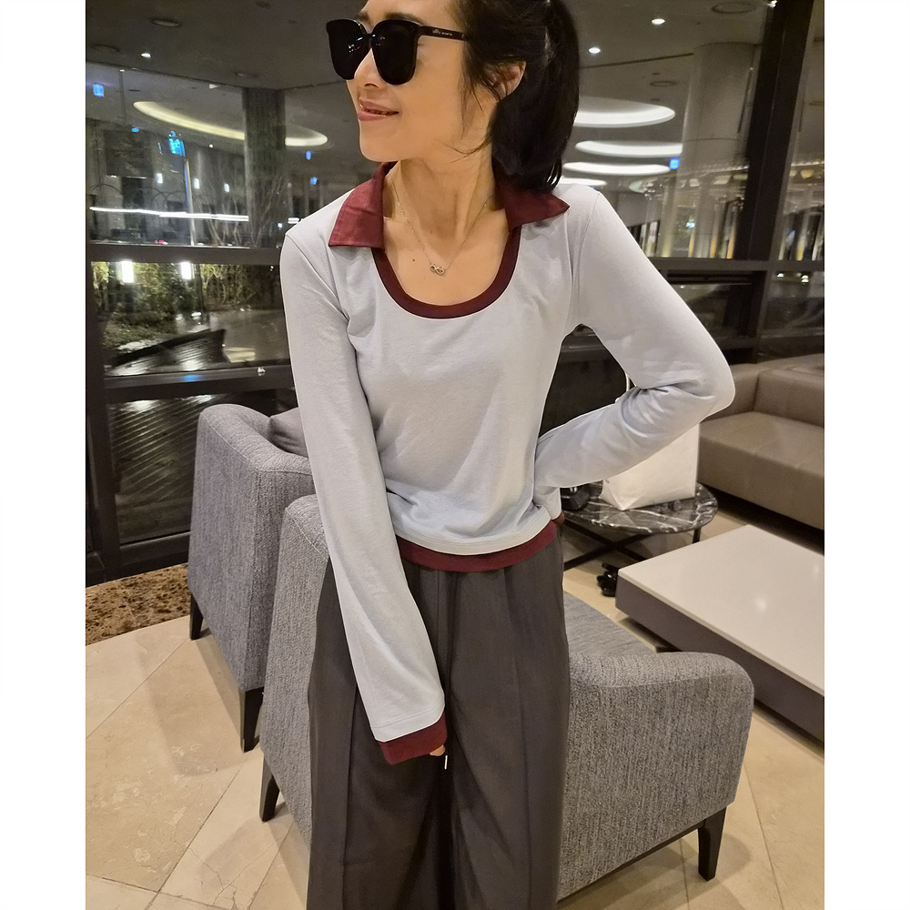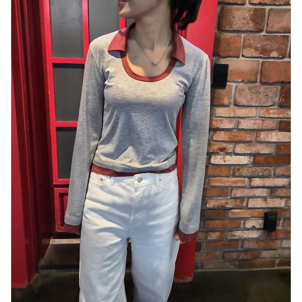 로즈 배색 카라 유넥 긴팔 티셔츠