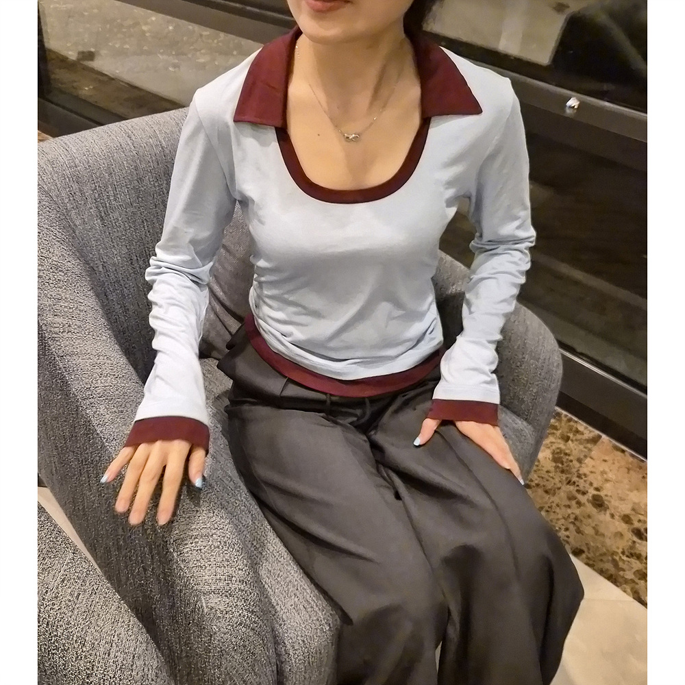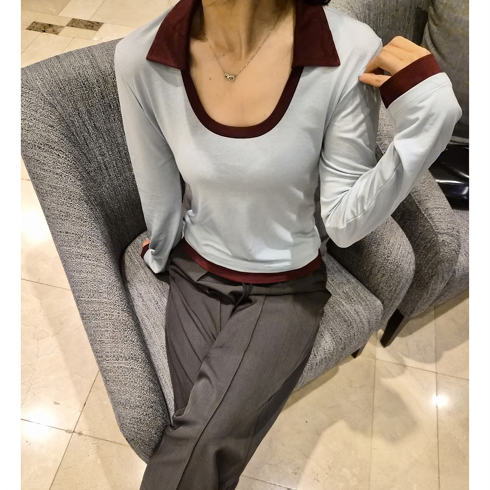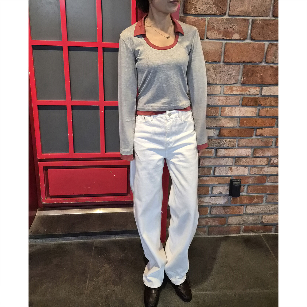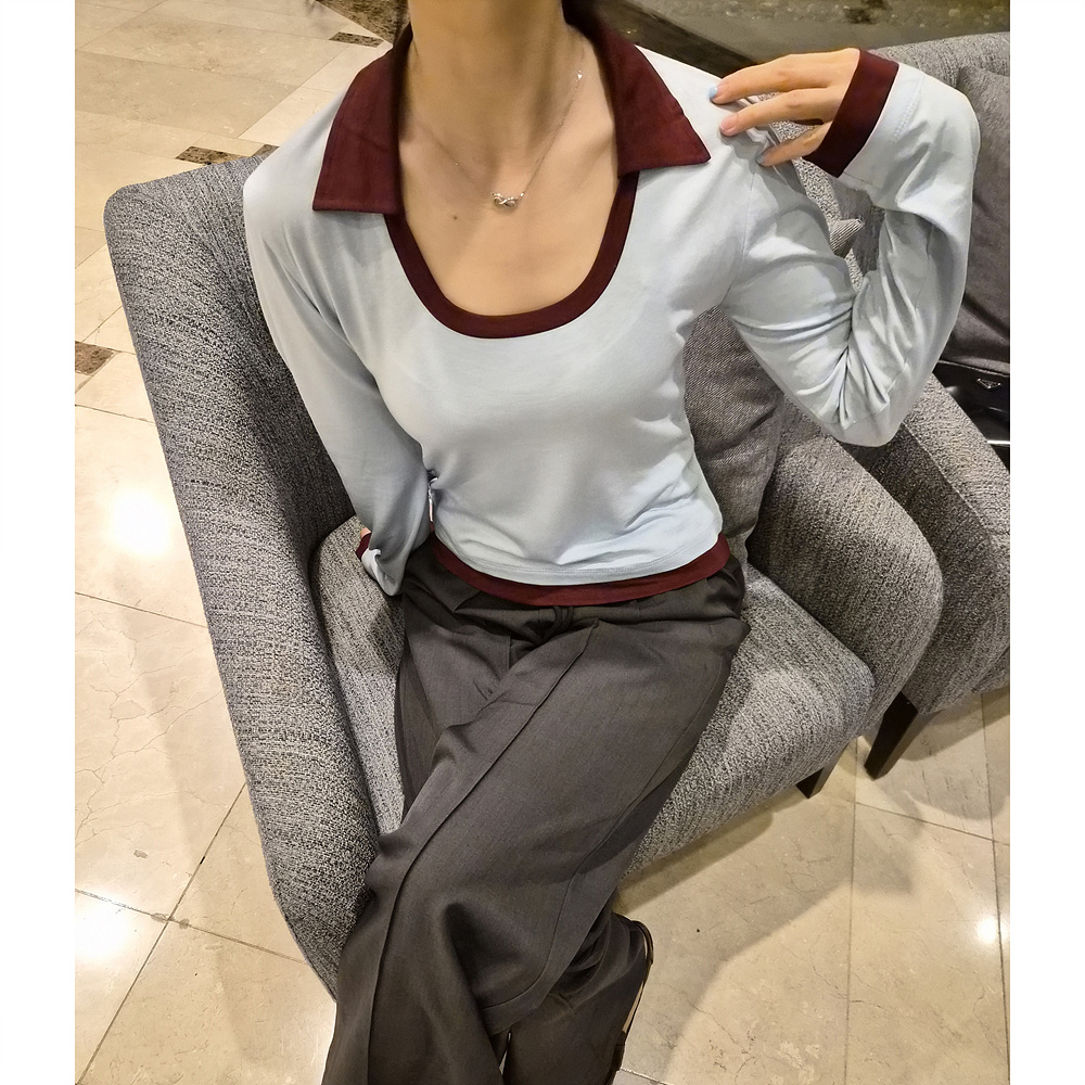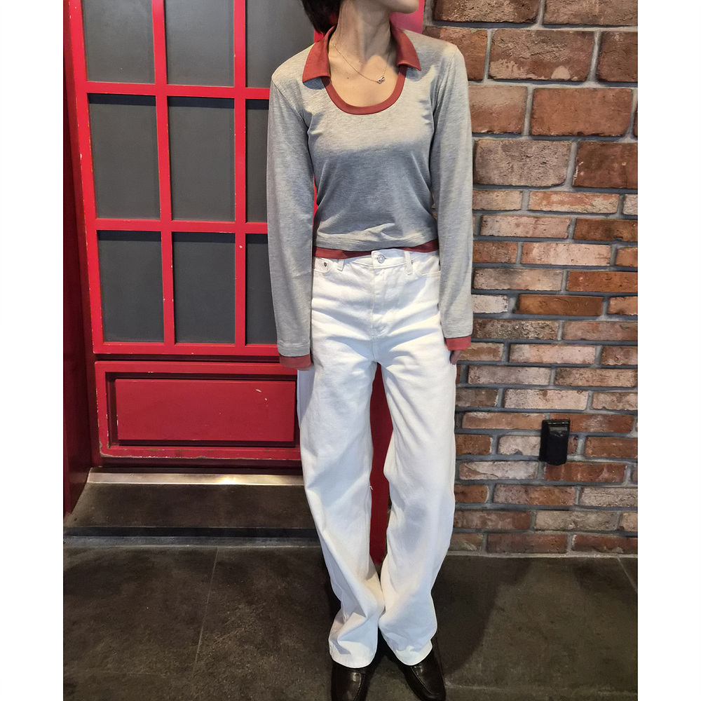 로즈 배색 카라 유넥 긴팔 티셔츠