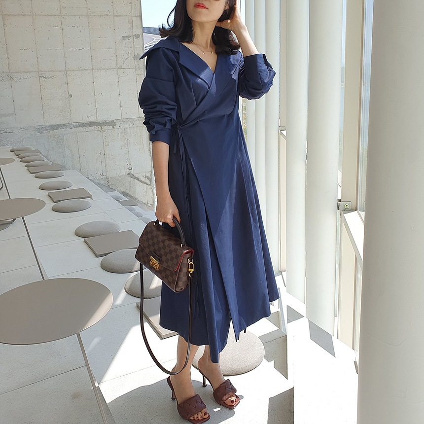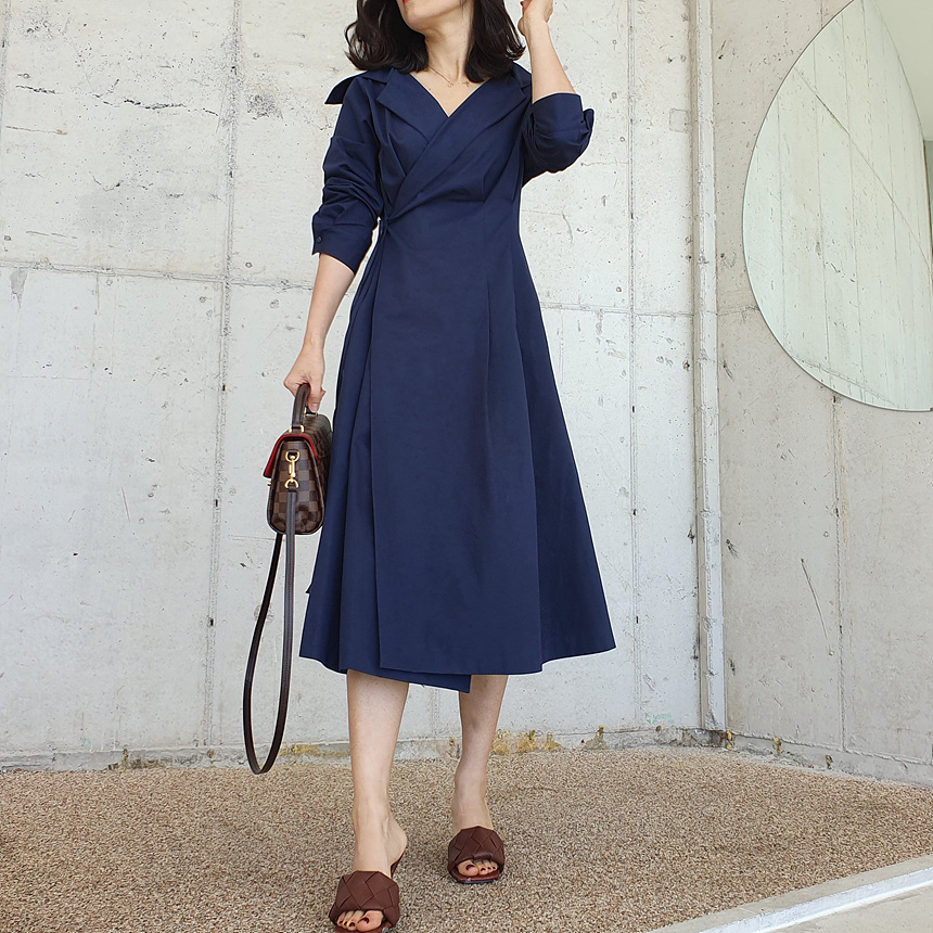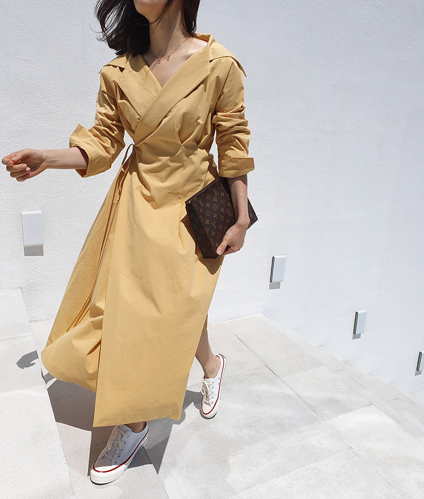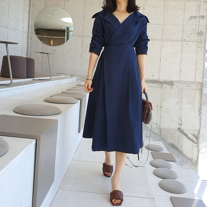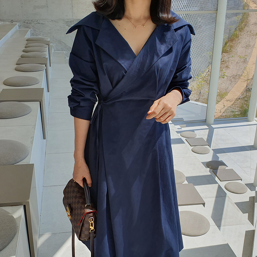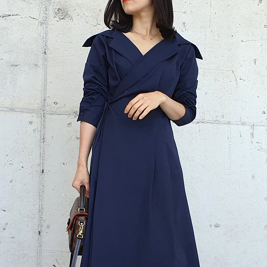 바로발송 유니크 와이드 카라 랩 셔츠 롱 원피스