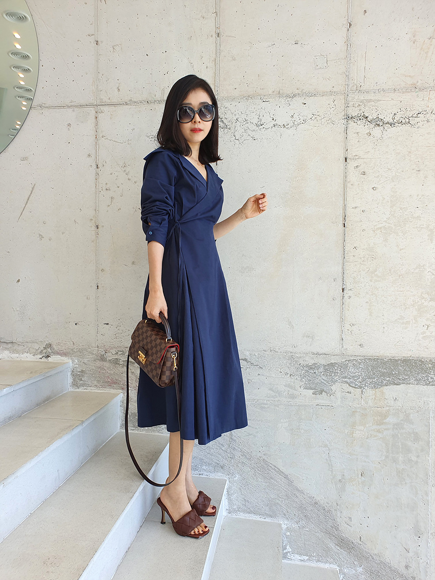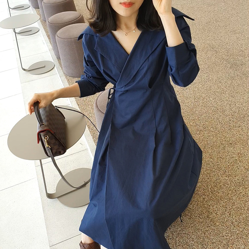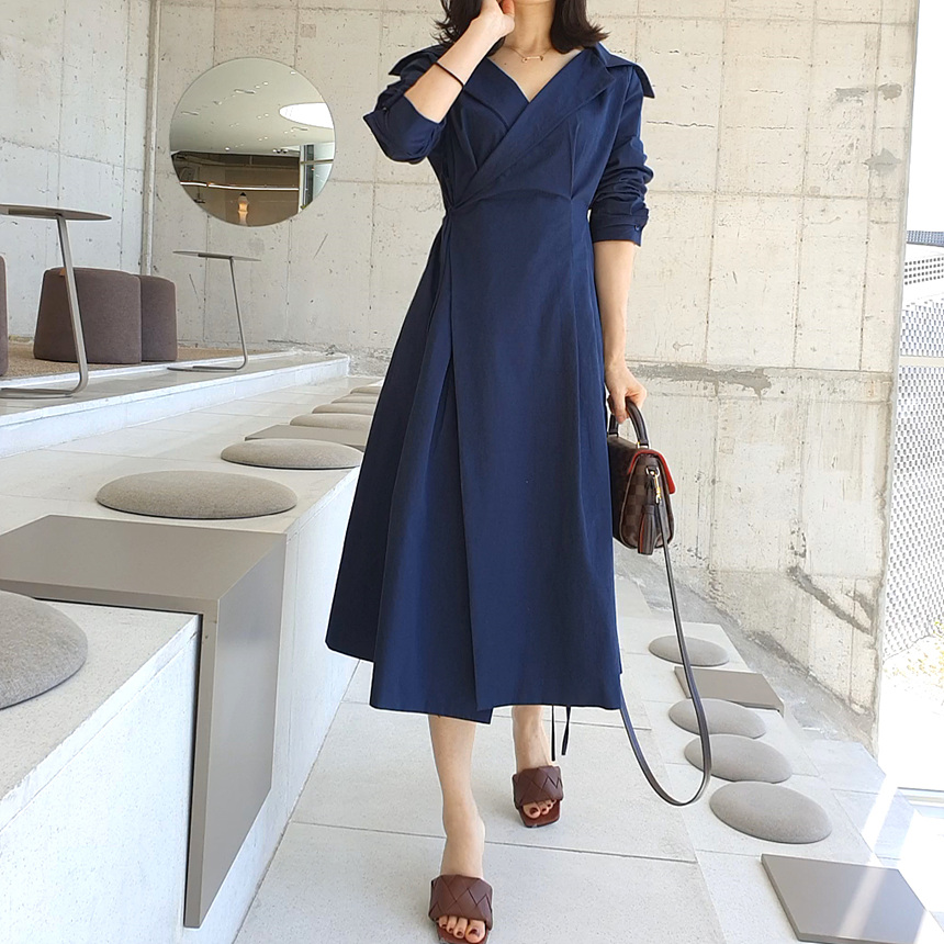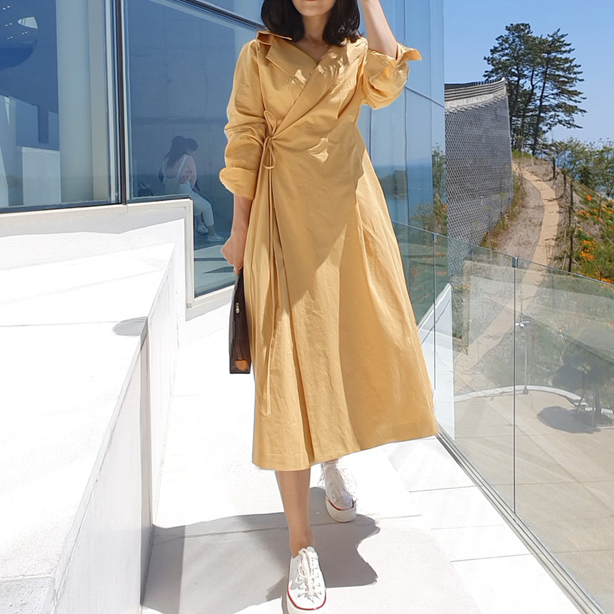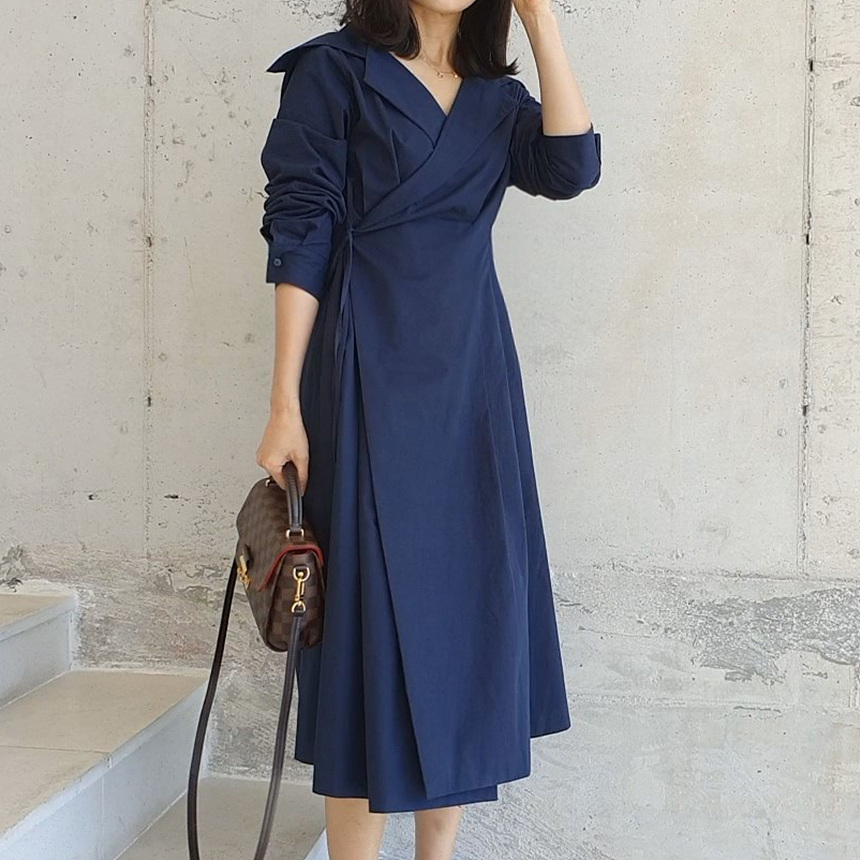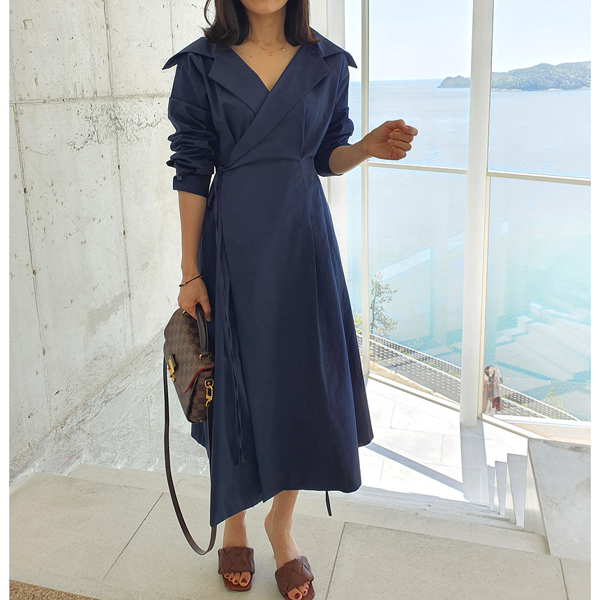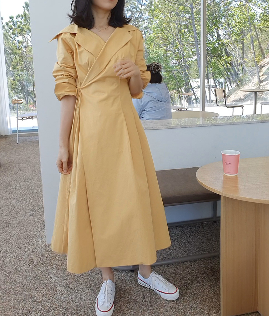 바로발송 유니크 와이드 카라 랩 셔츠 롱 원피스