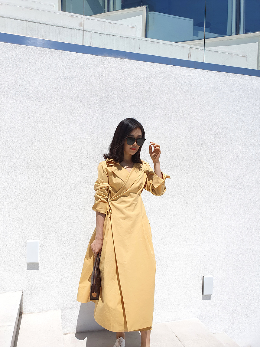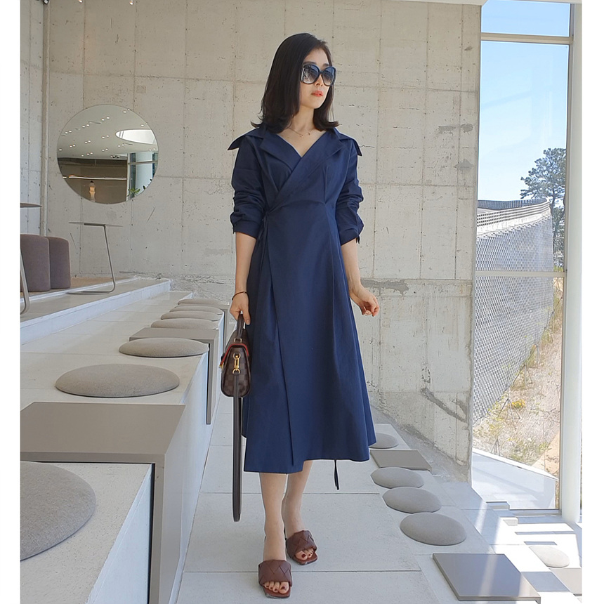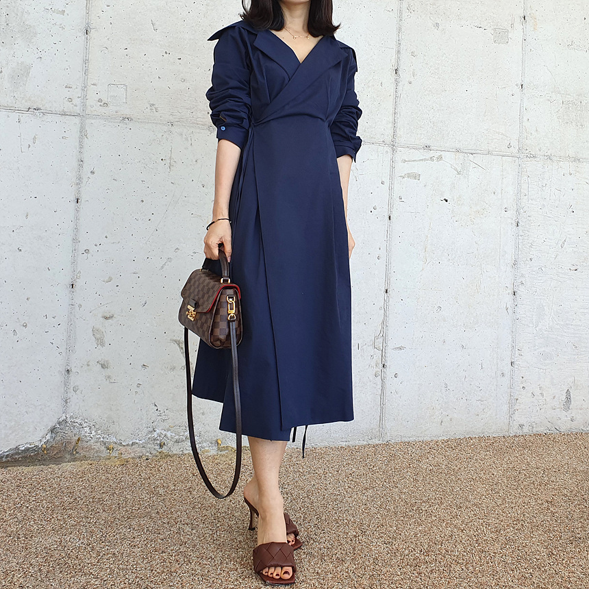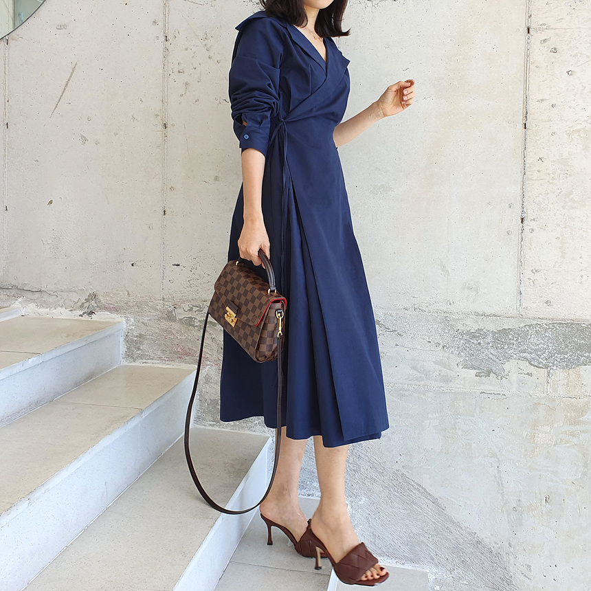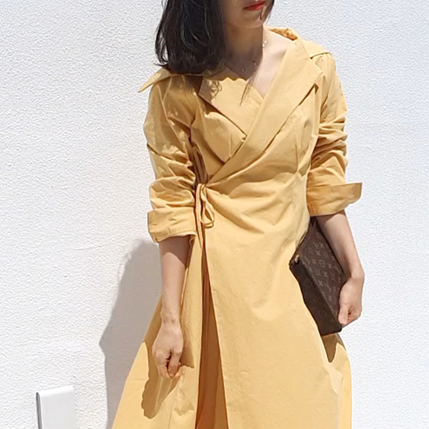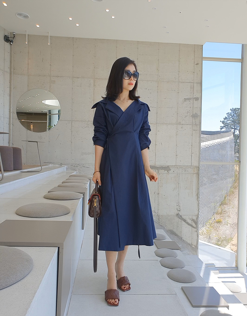 바로발송 유니크 와이드 카라 랩 셔츠 롱 원피스