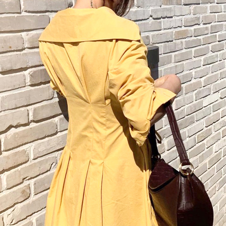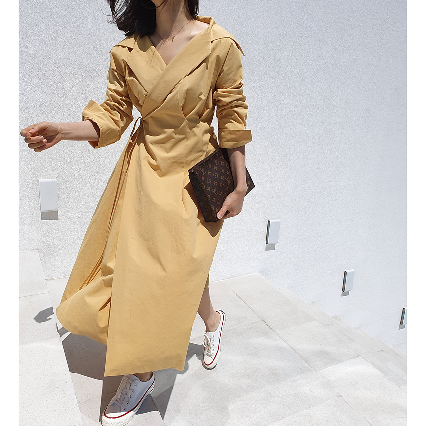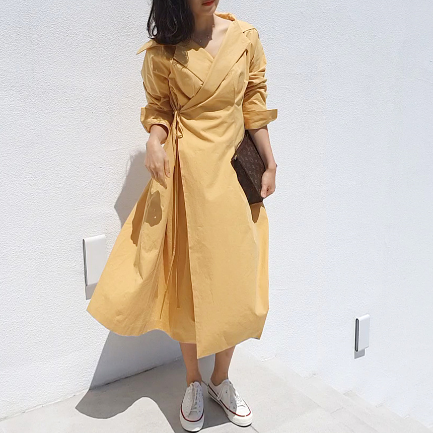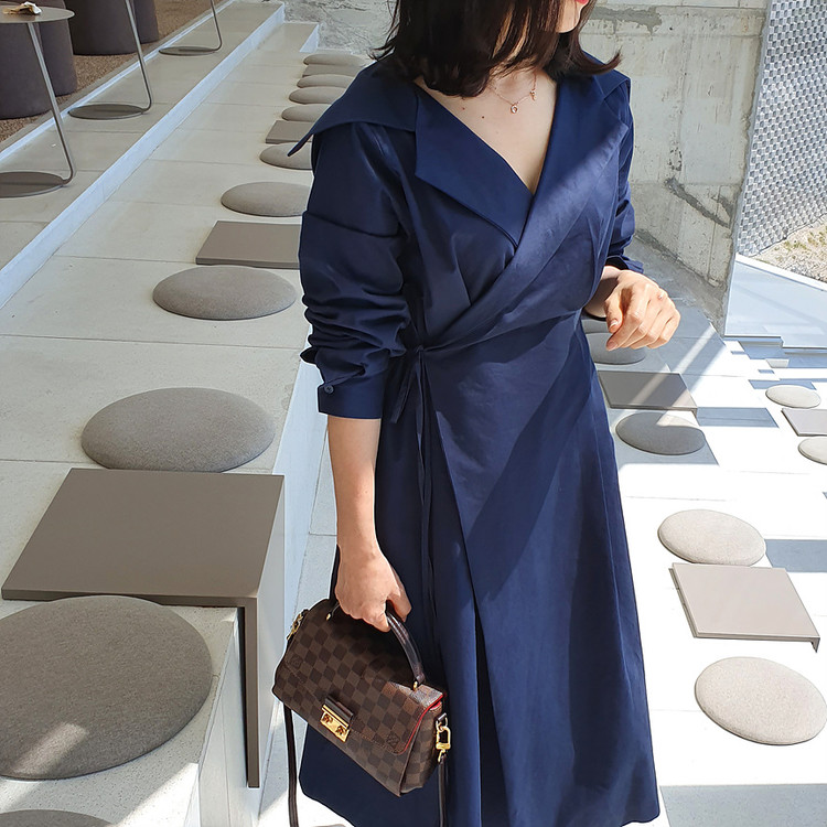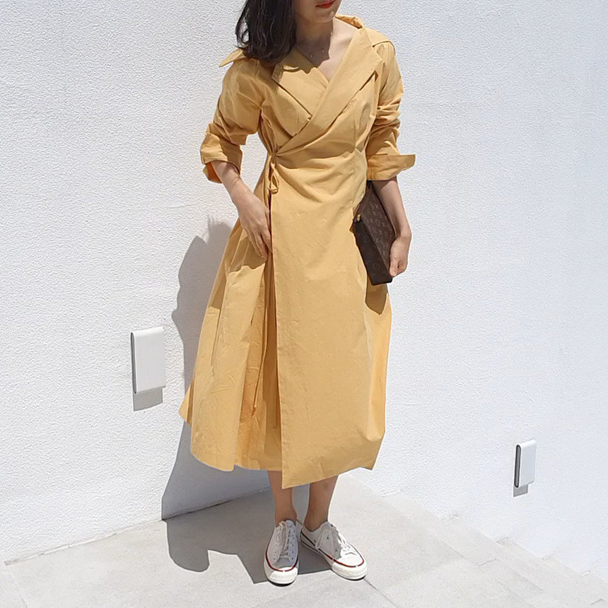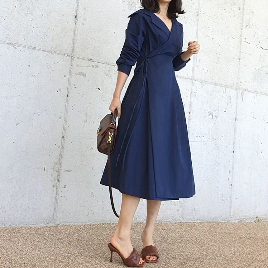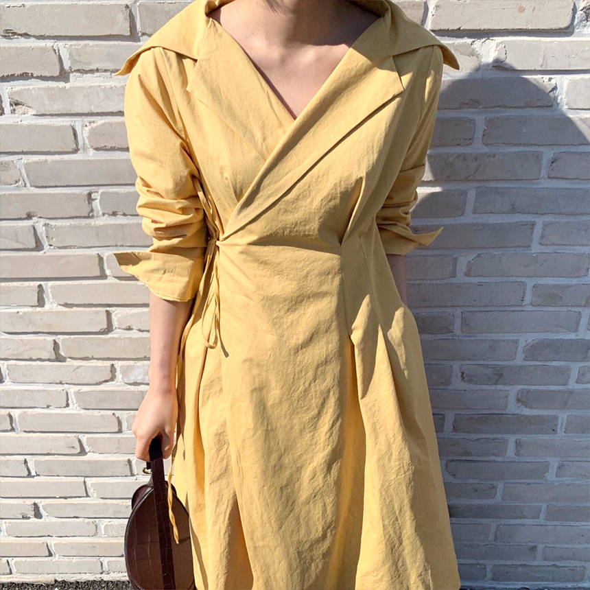 바로발송 유니크 와이드 카라 랩 셔츠 롱 원피스