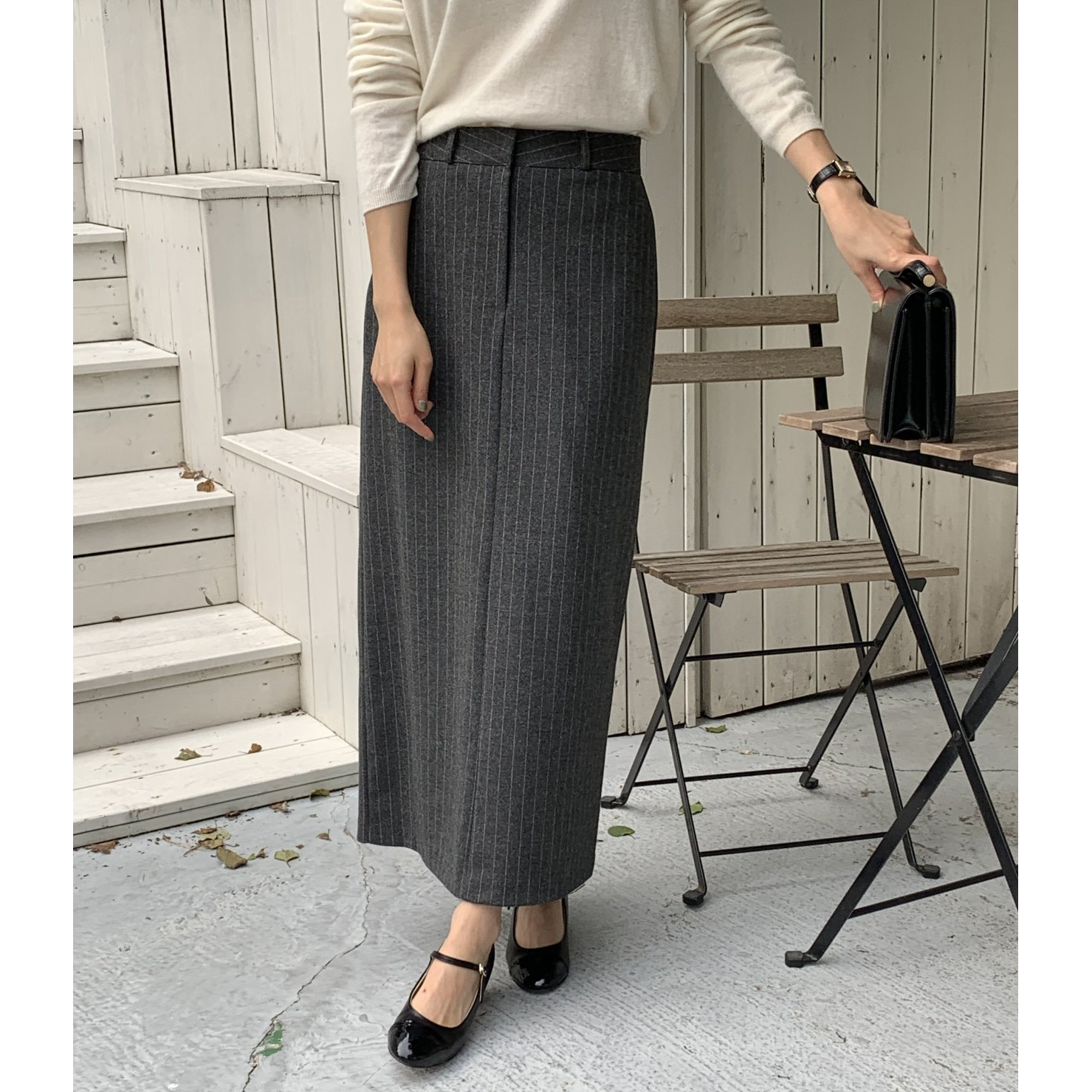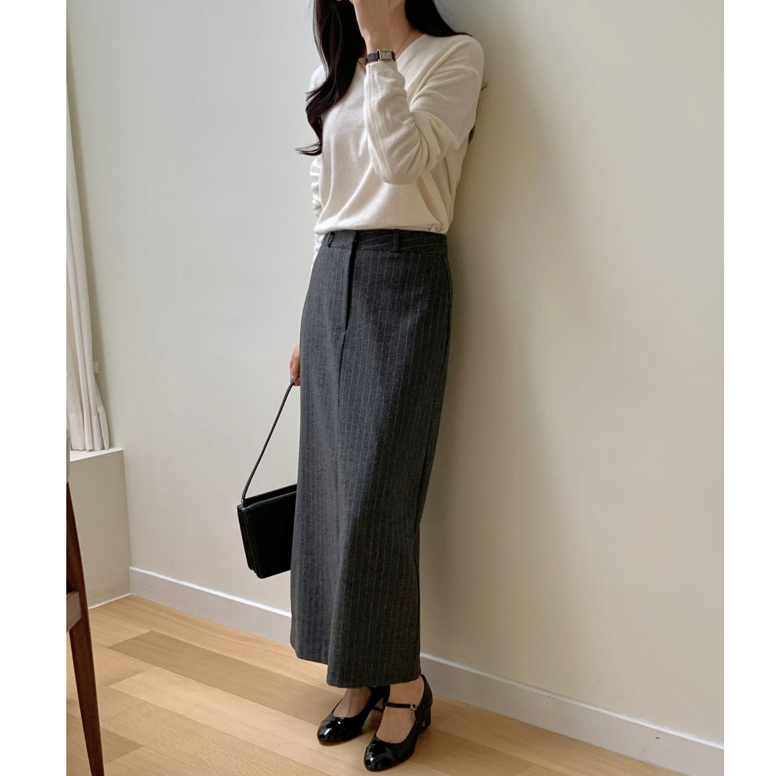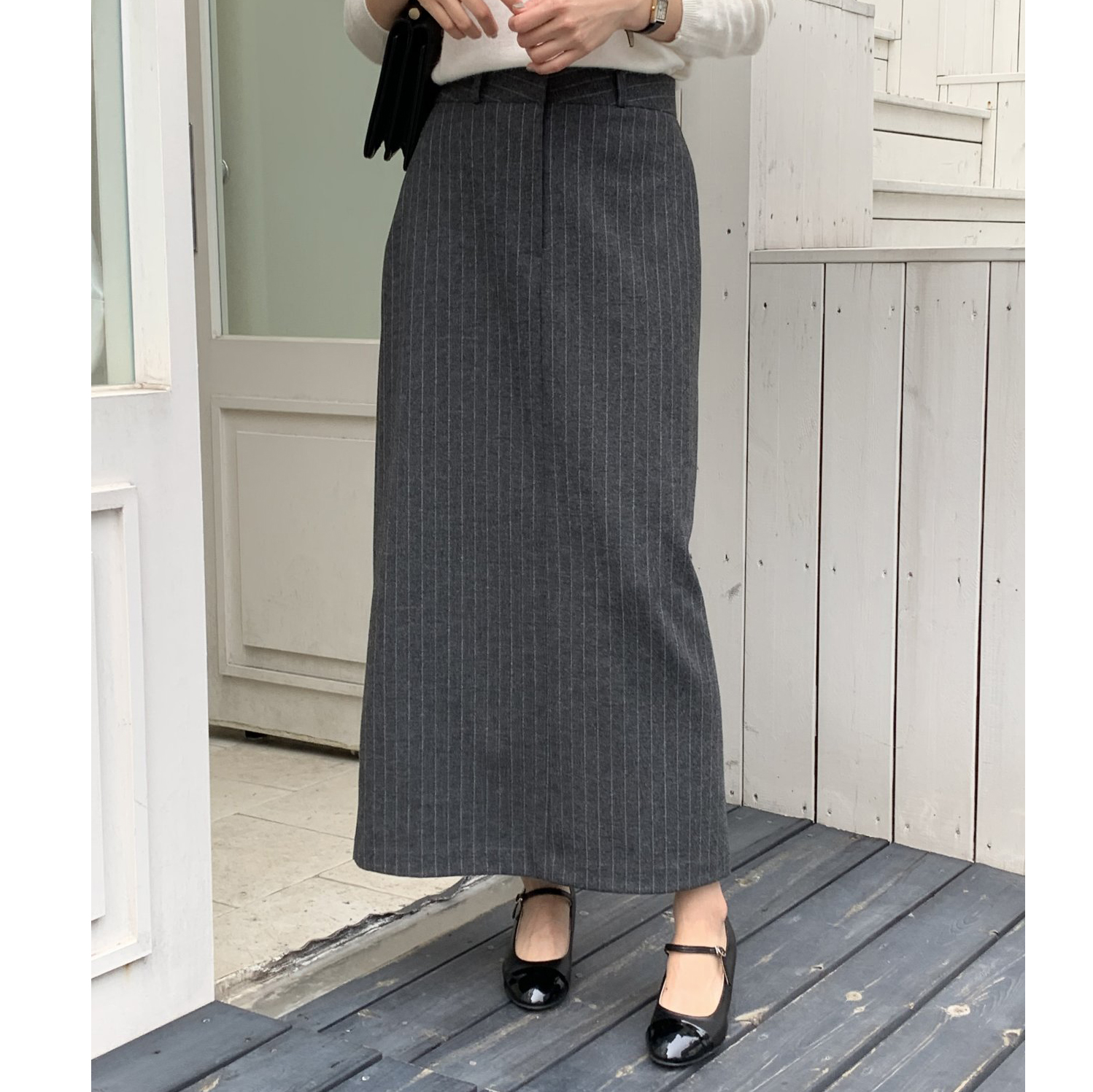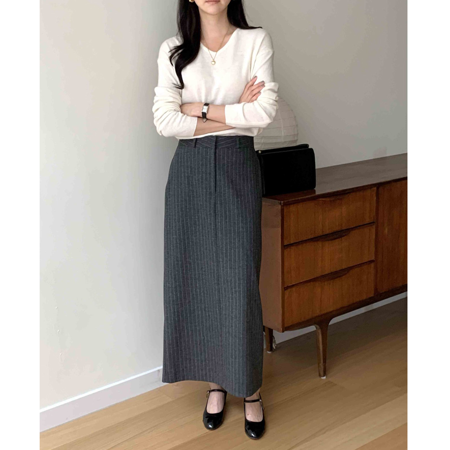 단아 에이치 라인 스트라이프 울 스커트 롱 치마