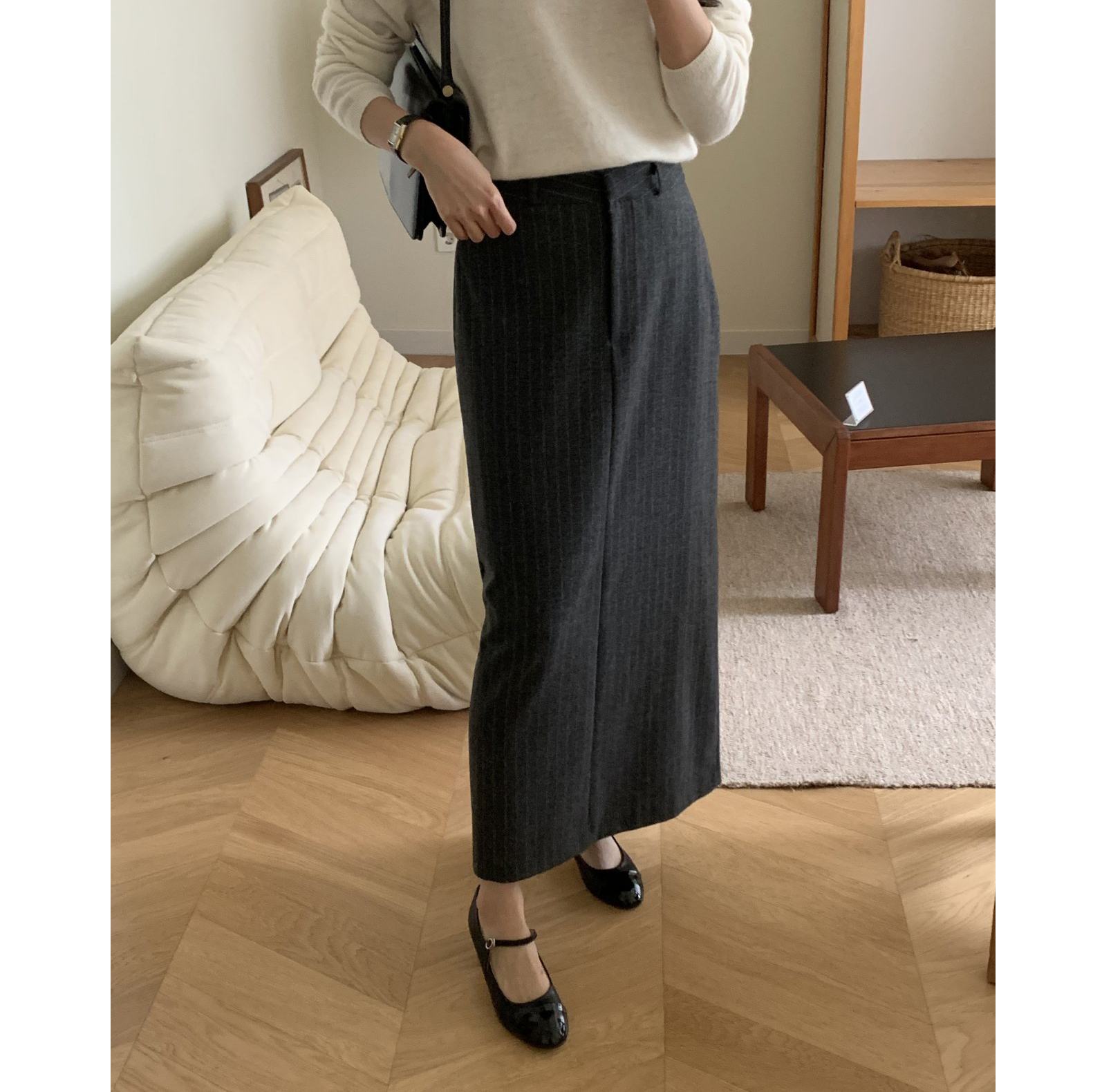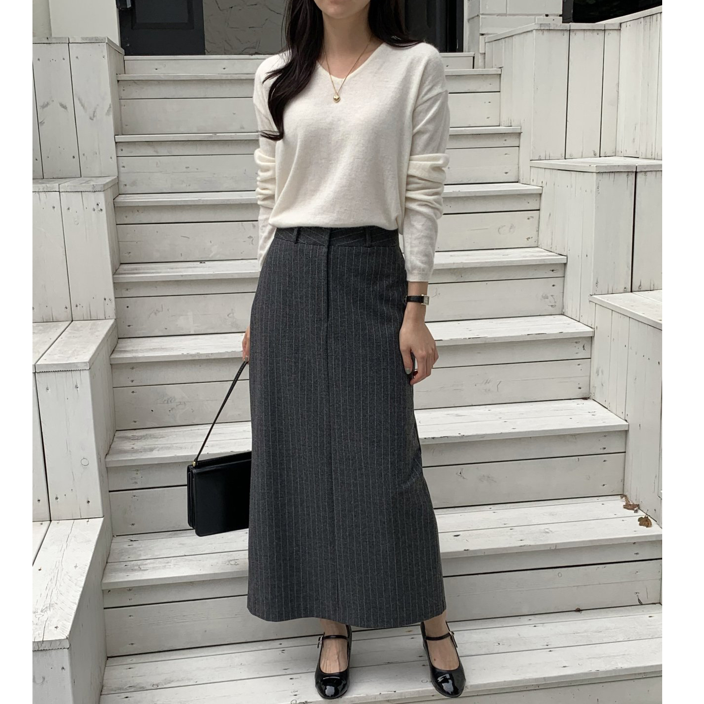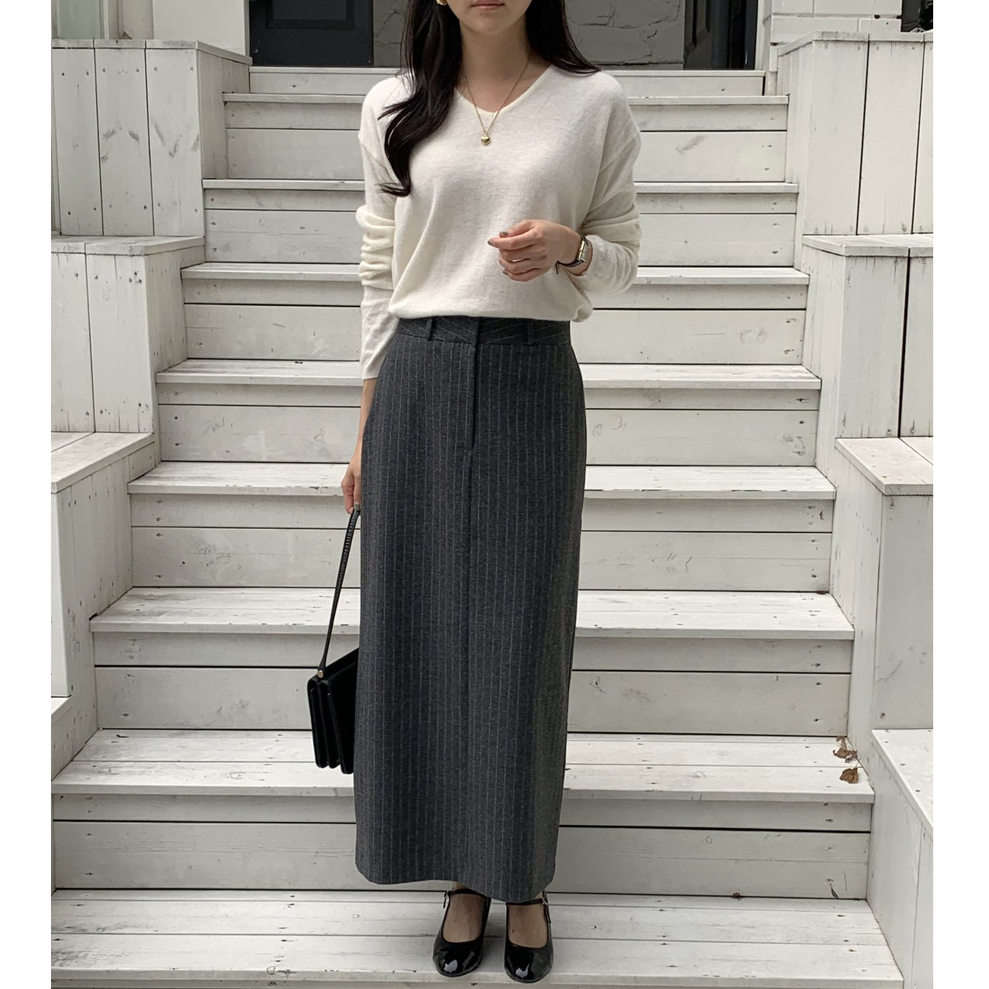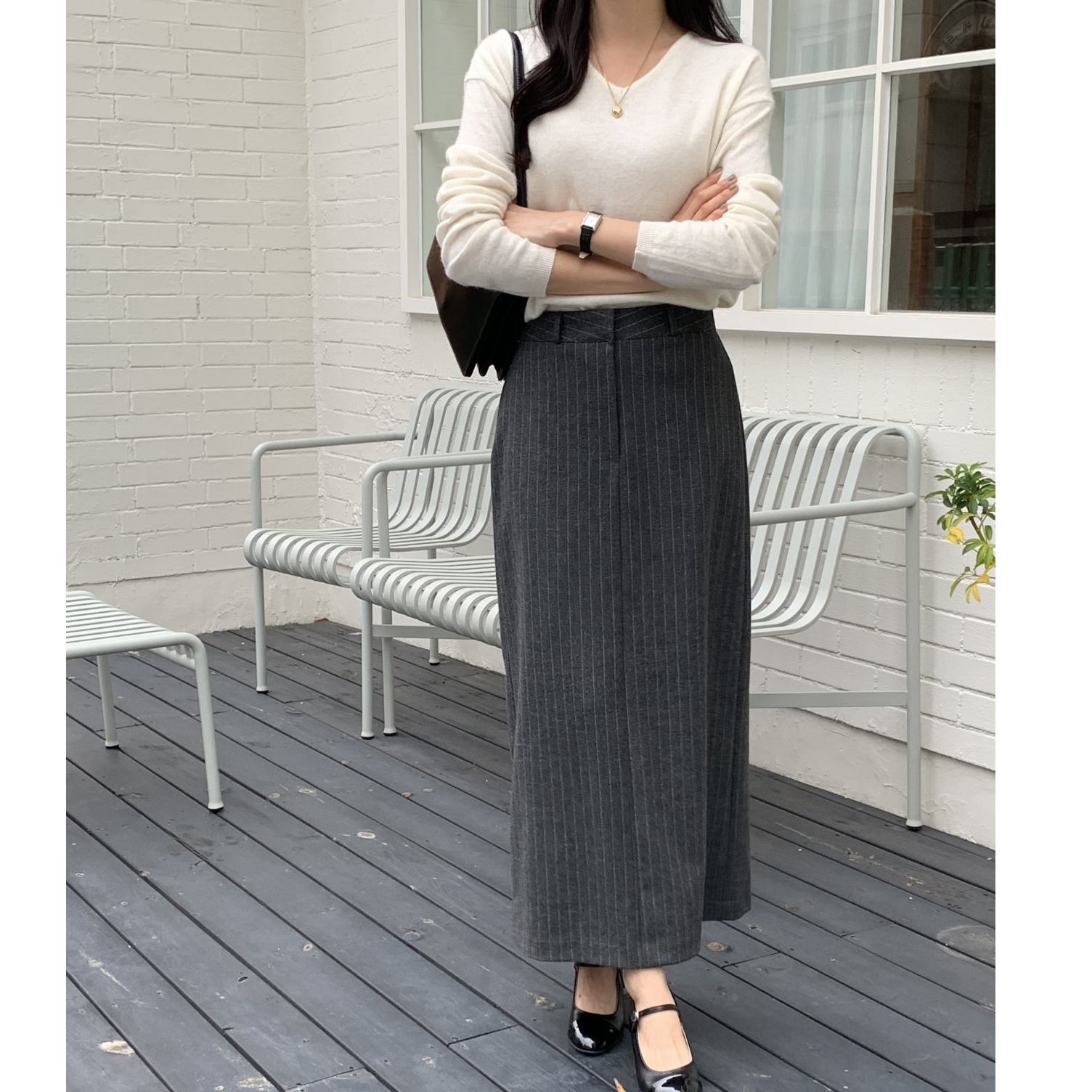 단아 에이치 라인 스트라이프 울 스커트 롱 치마