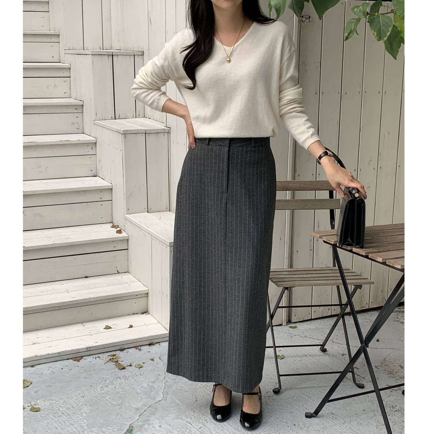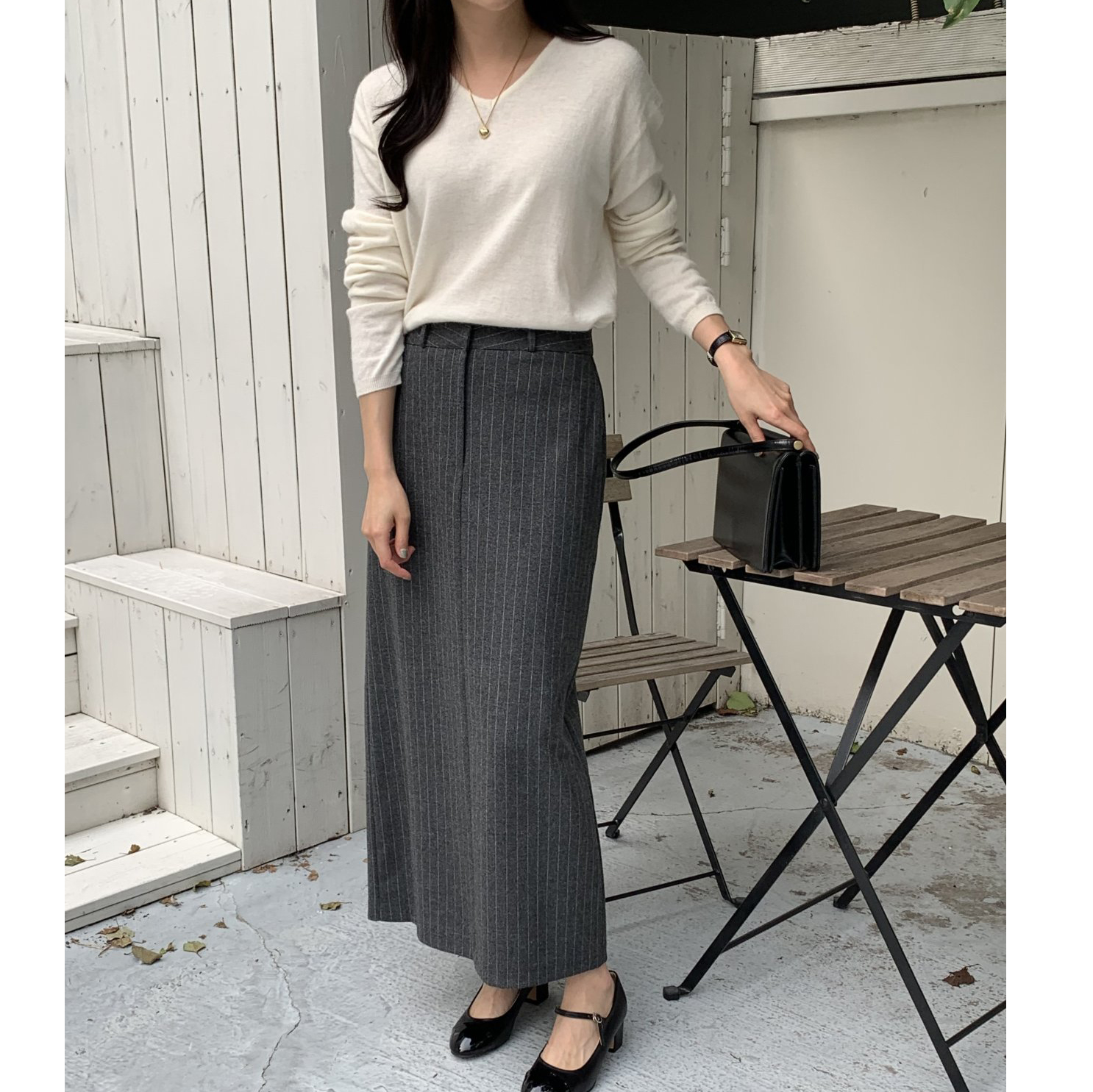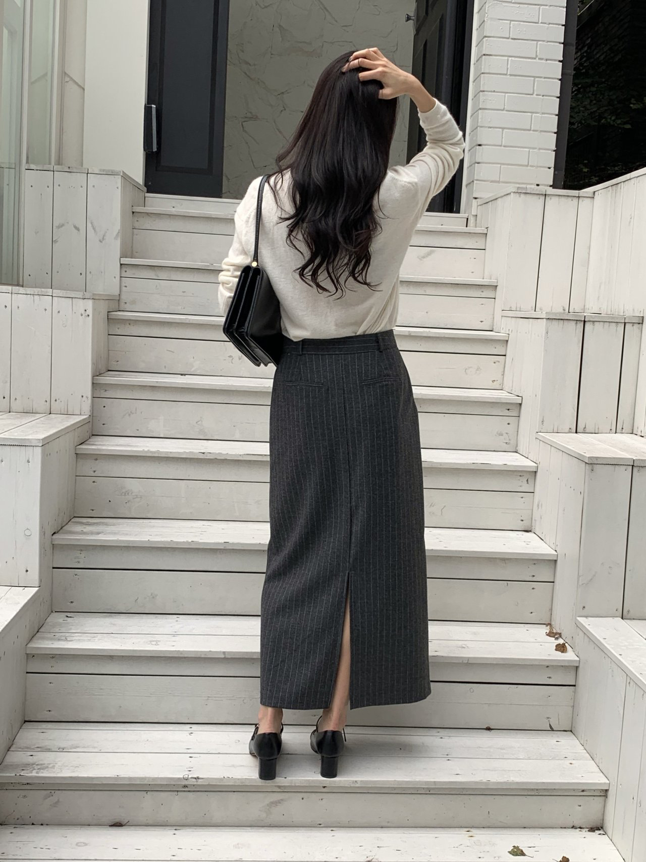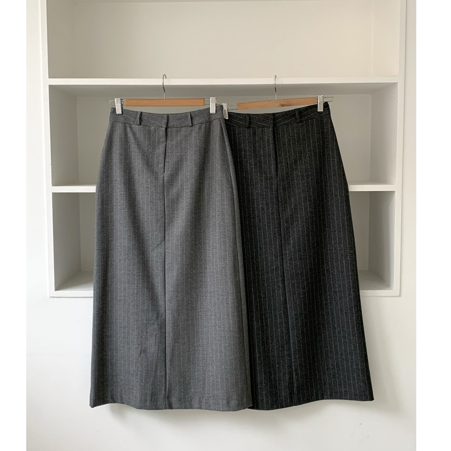 단아 에이치 라인 스트라이프 울 스커트 롱 치마