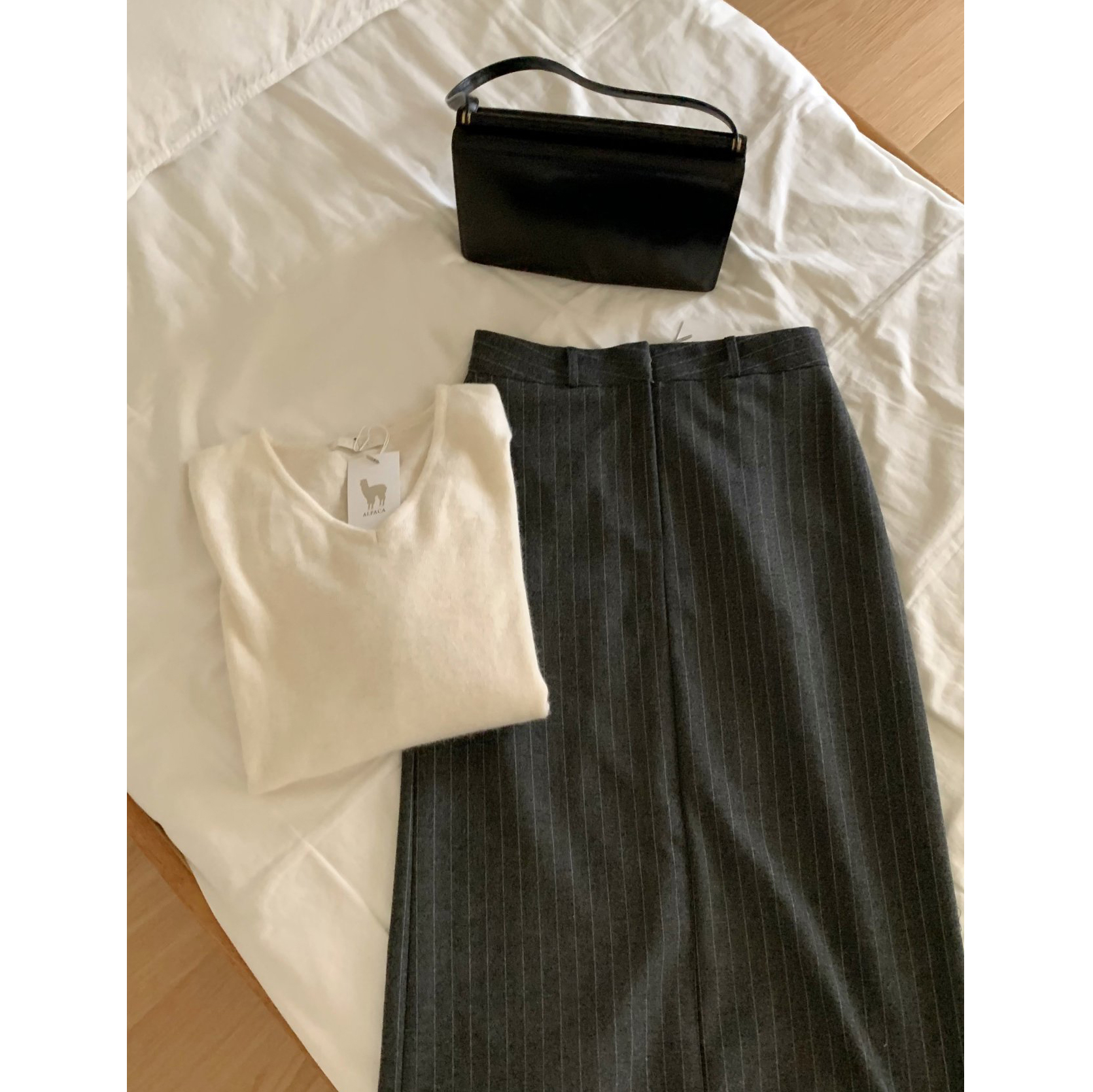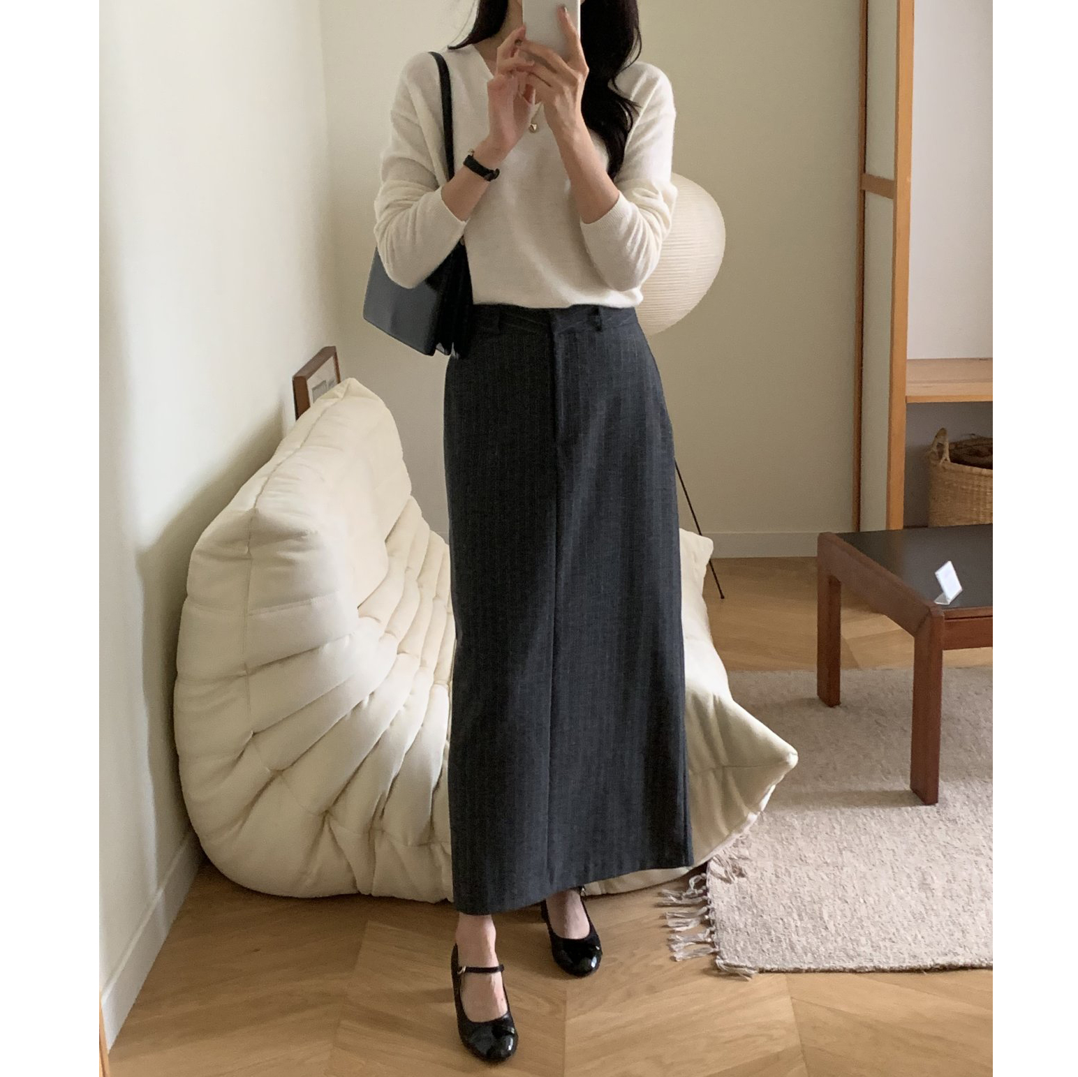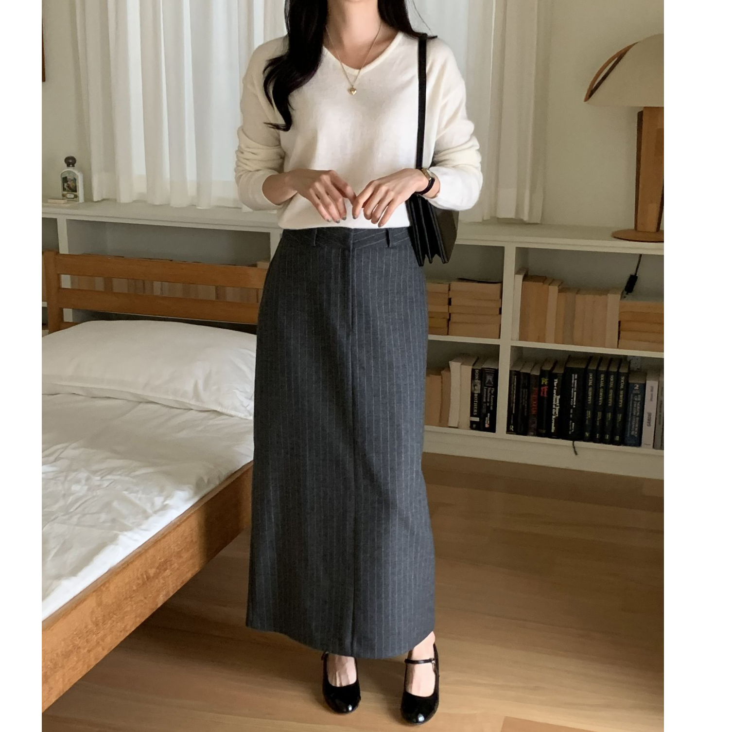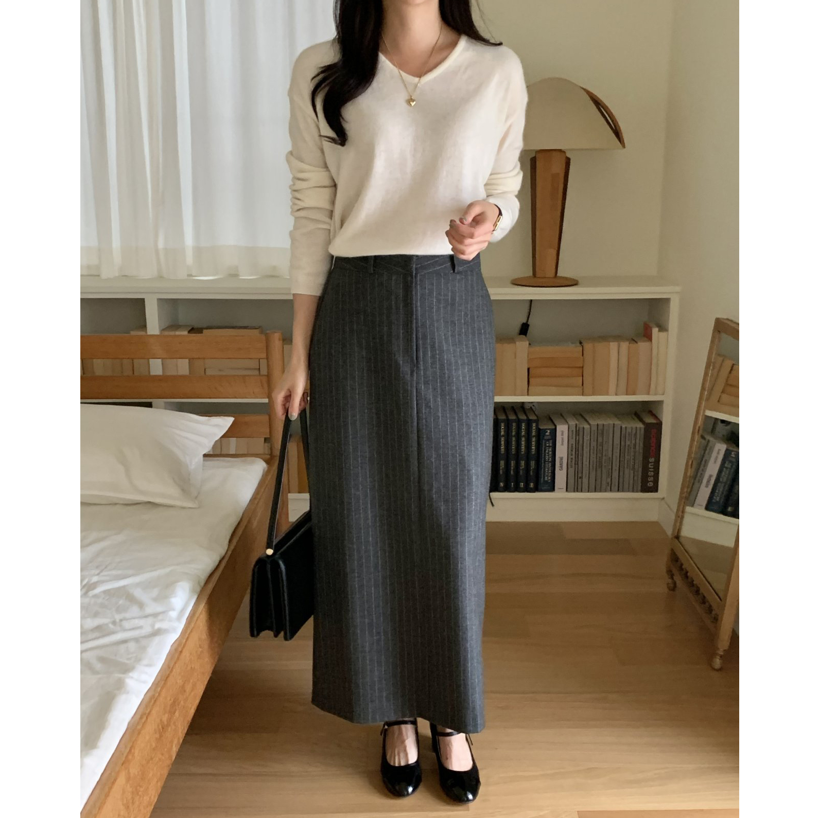 단아 에이치 라인 스트라이프 울 스커트 롱 치마
