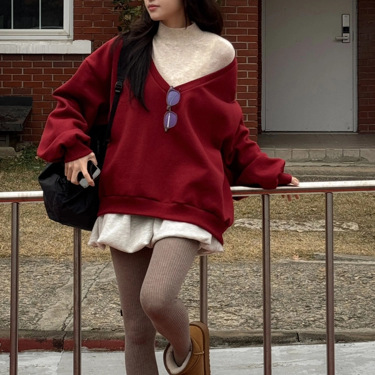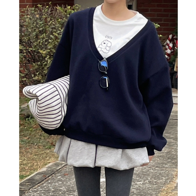 루즈핏 브이넥 기모 맨투맨 박스티