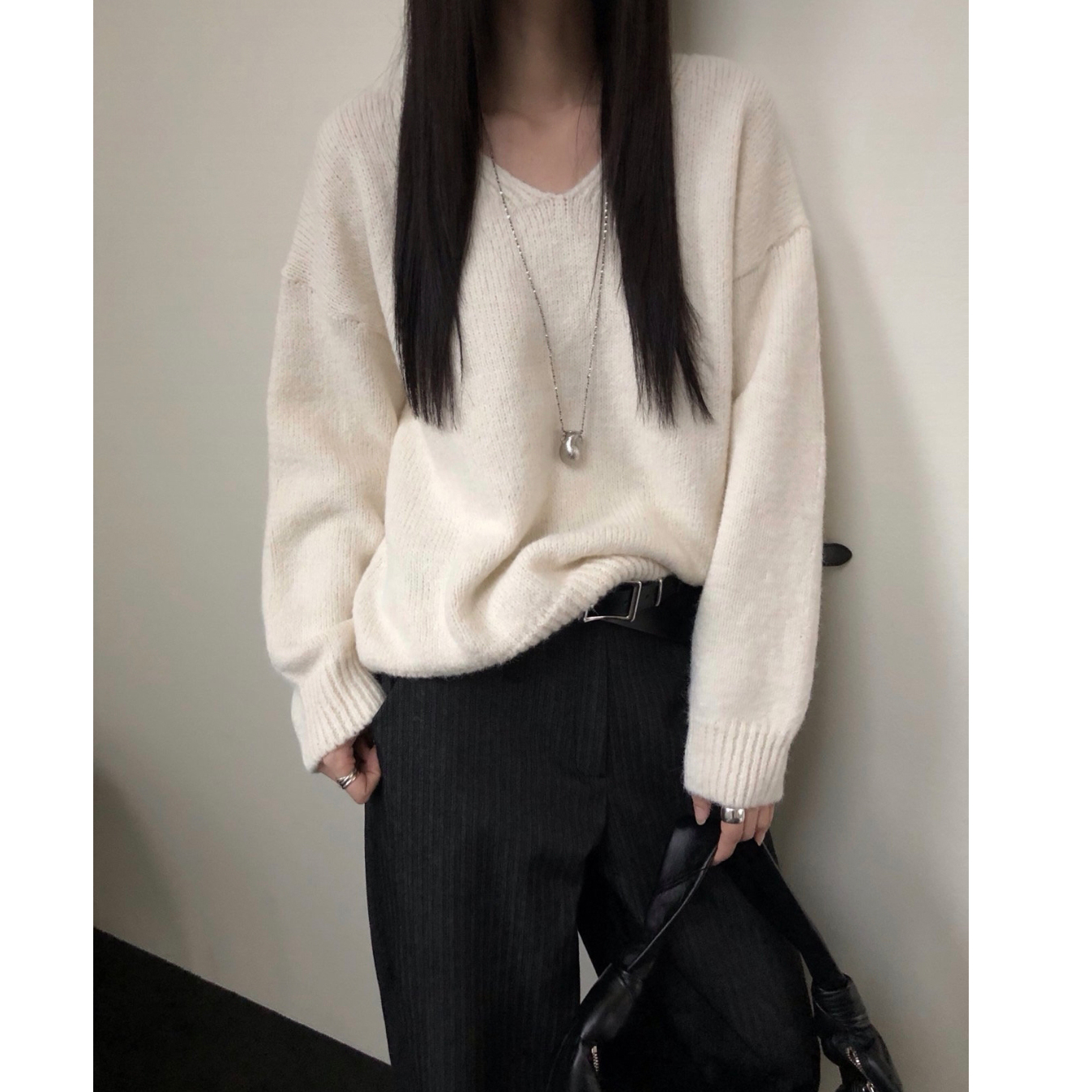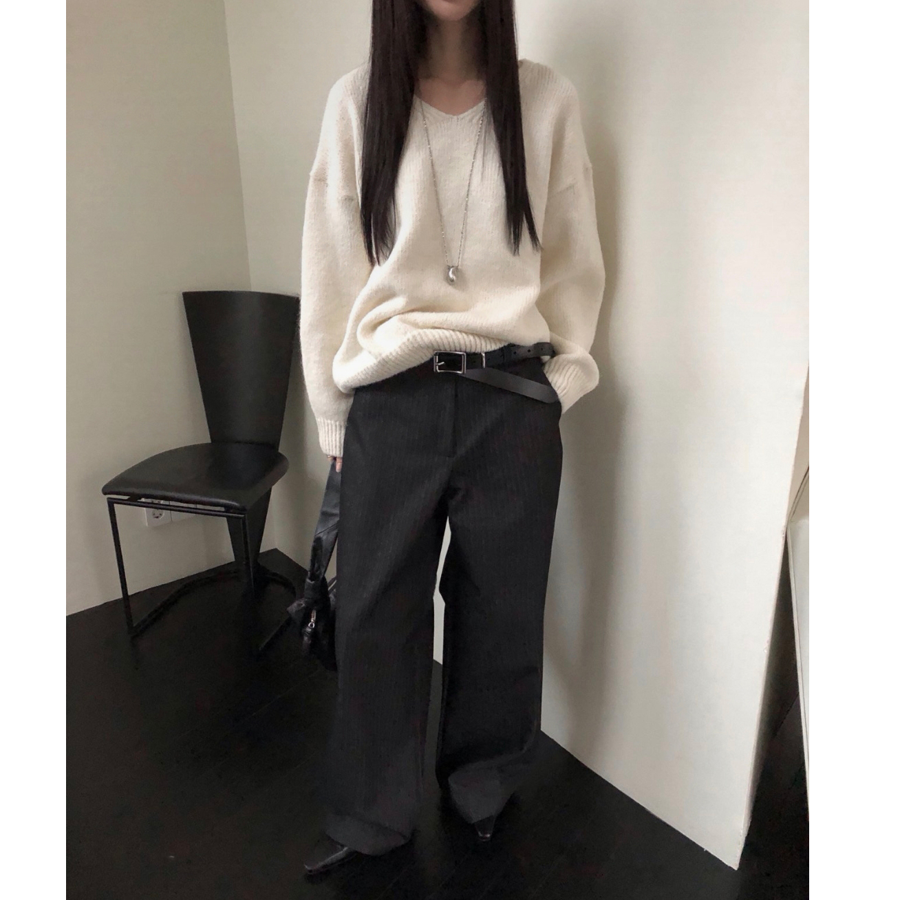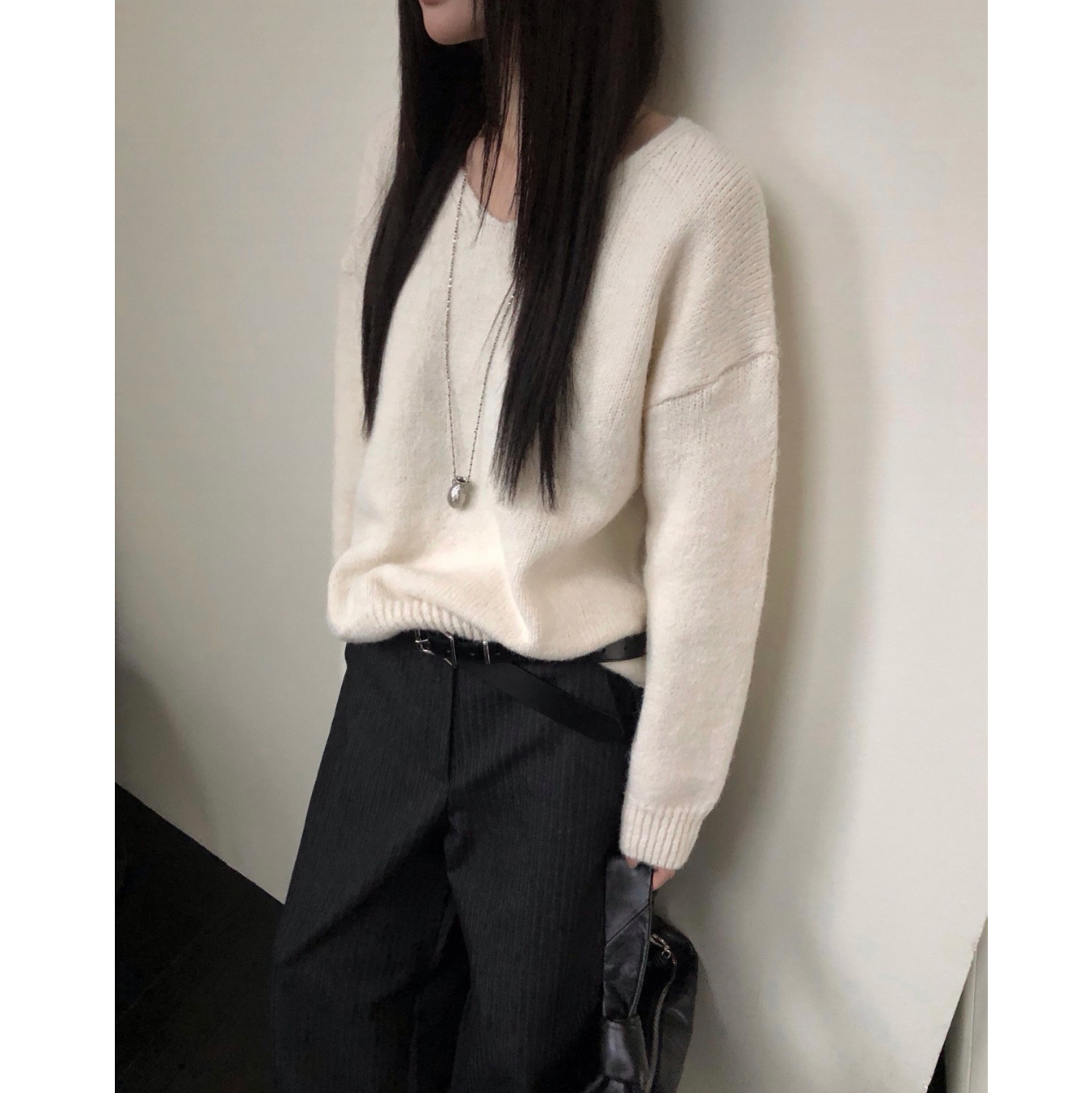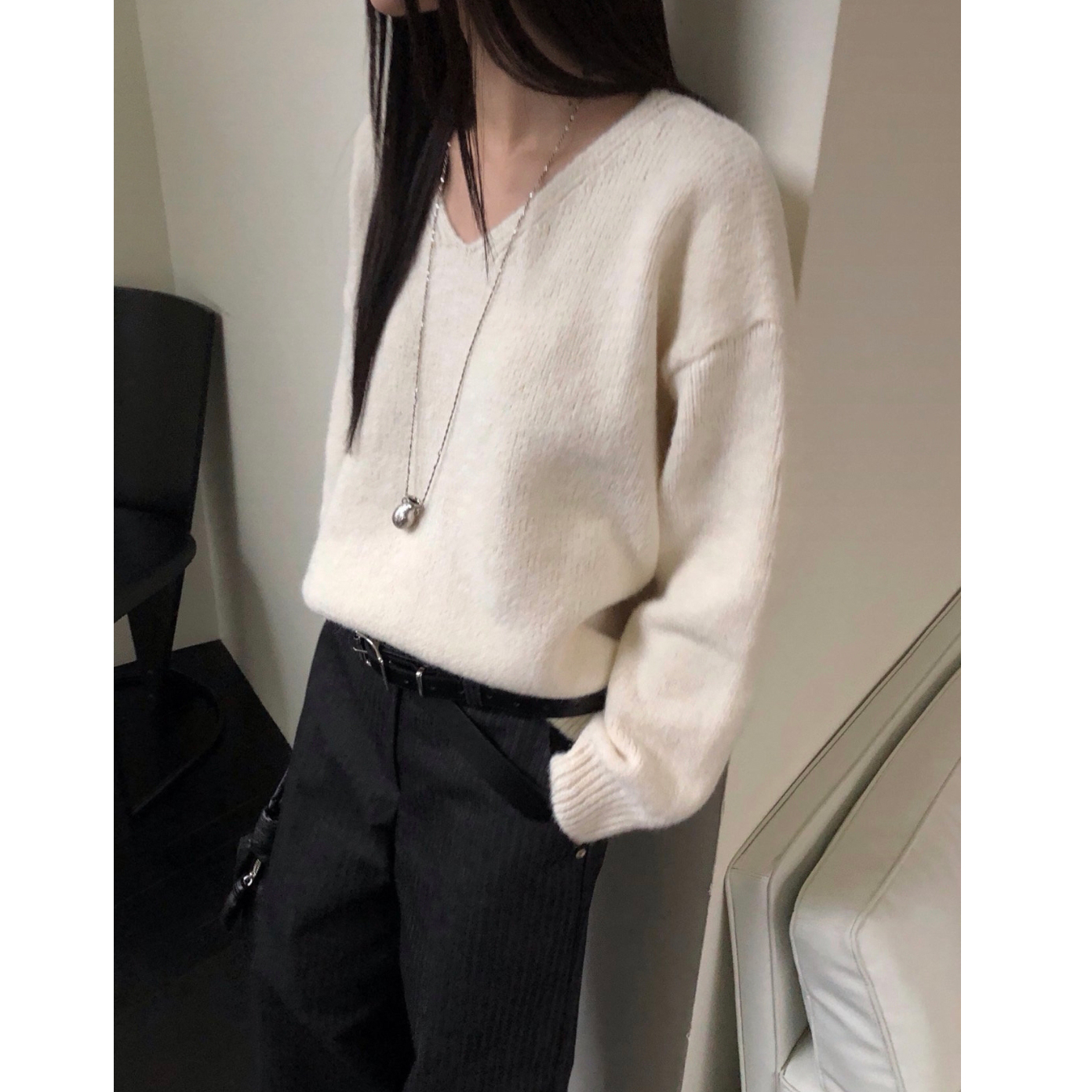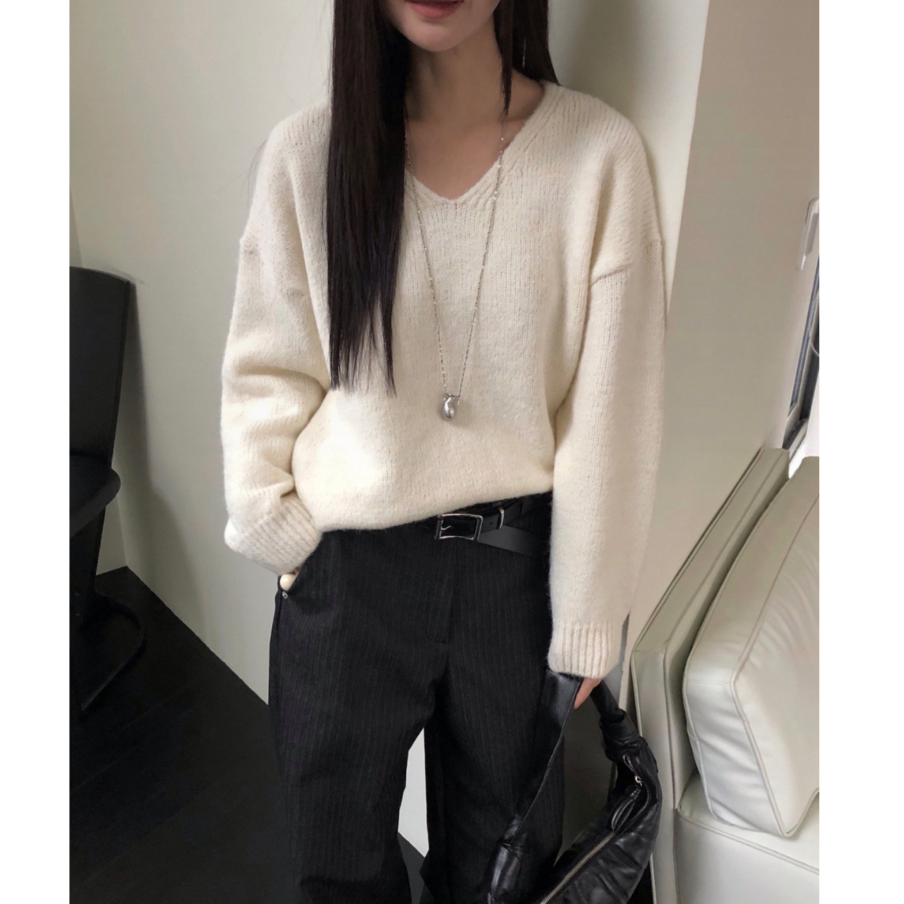 긱 루즈핏 브이넥 울 기본 니트