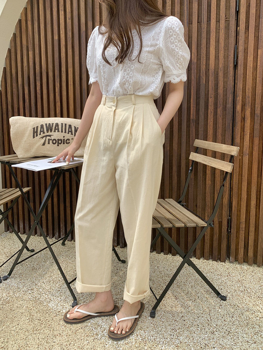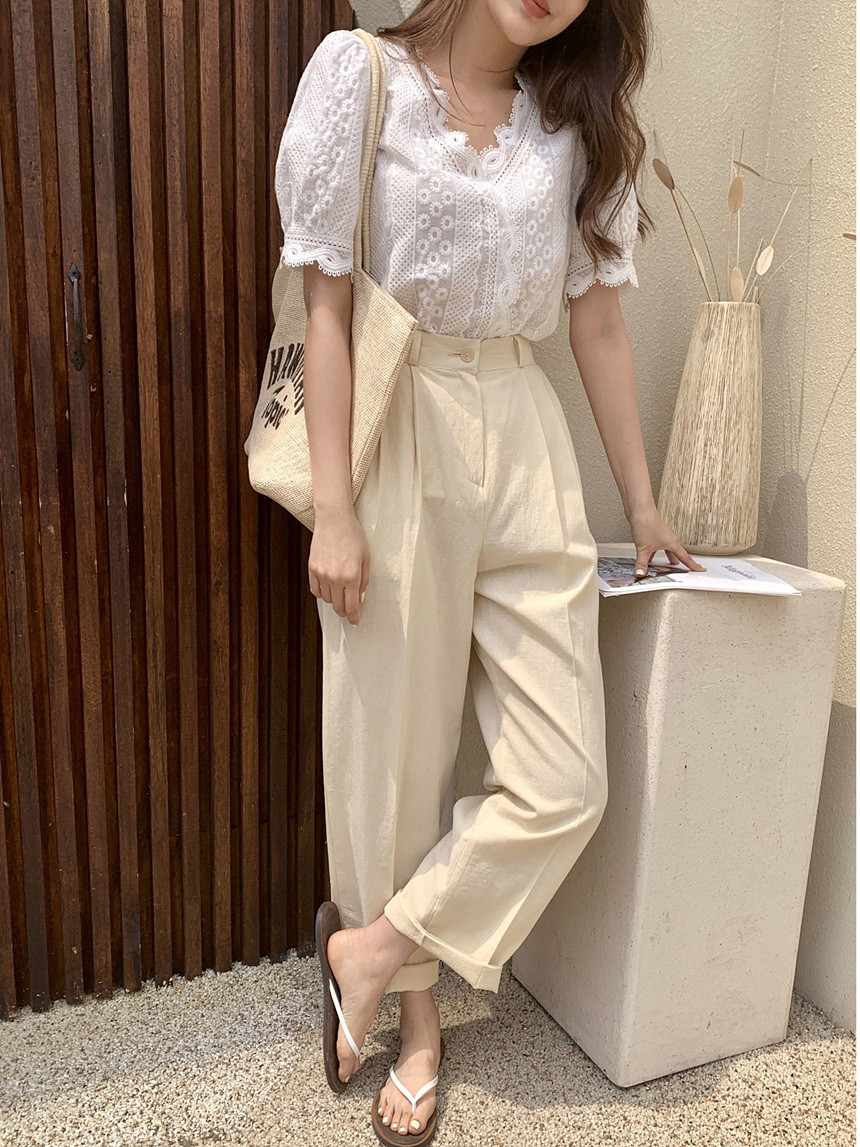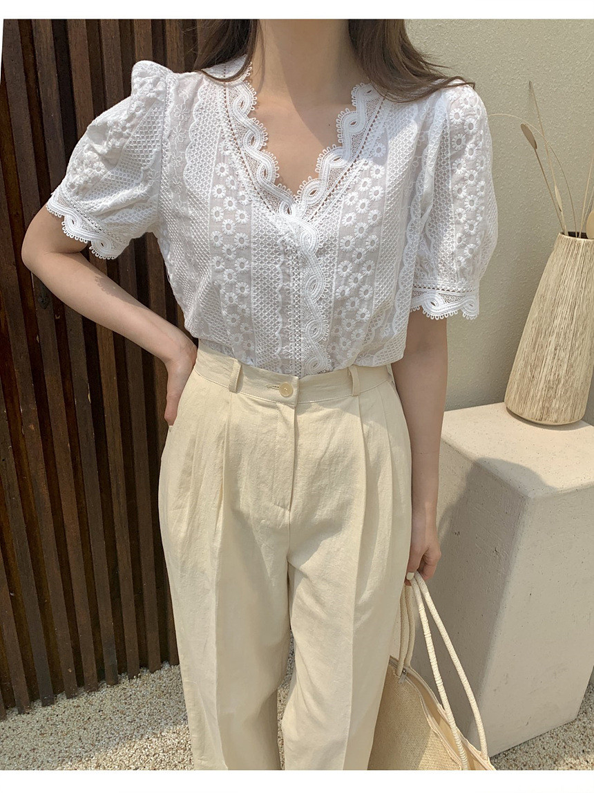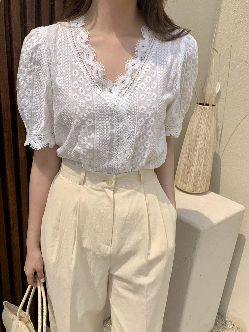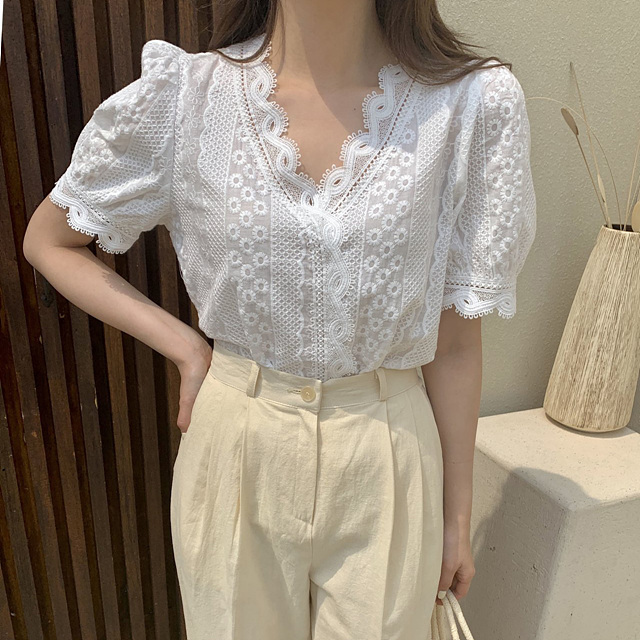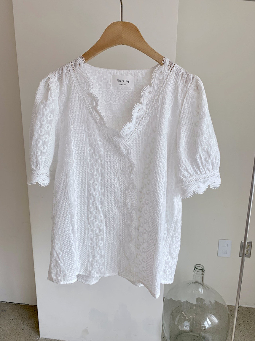 퍼프 자수 레이스 브이넥 블라우스