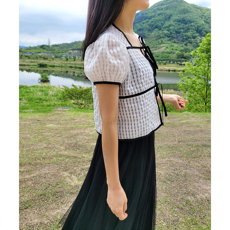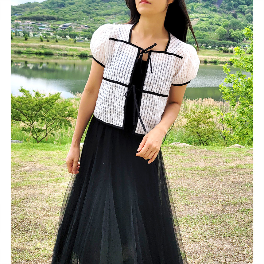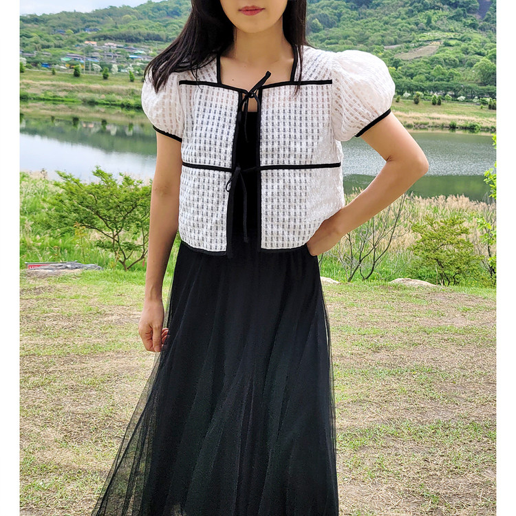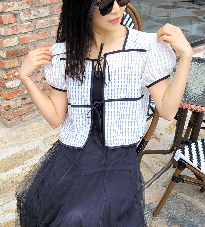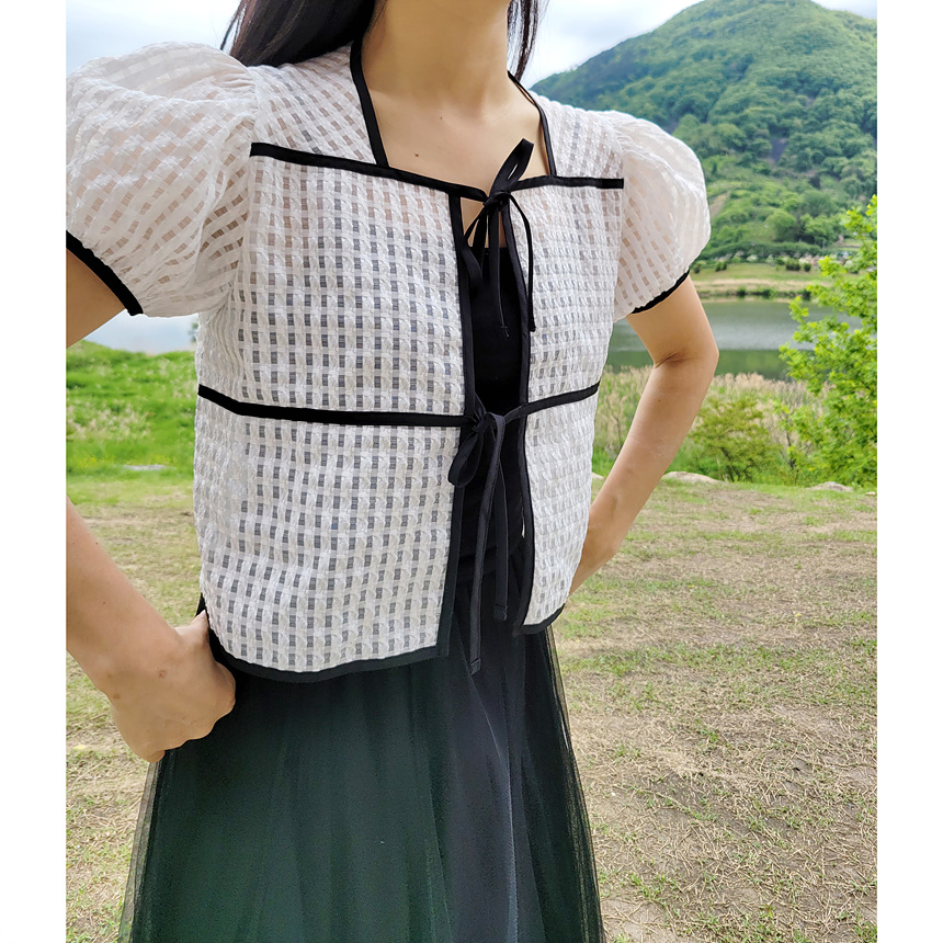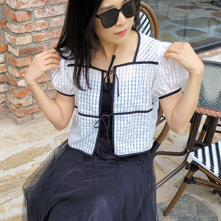 바로발송 체크 시스루 퍼프 가디건 블라우스