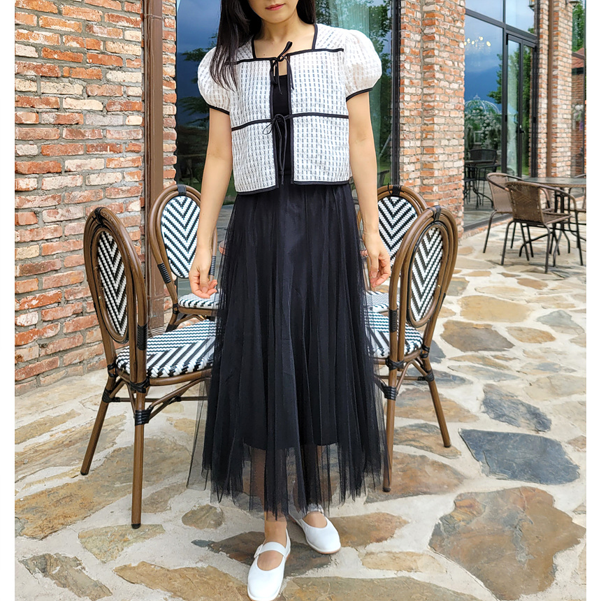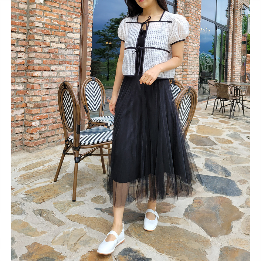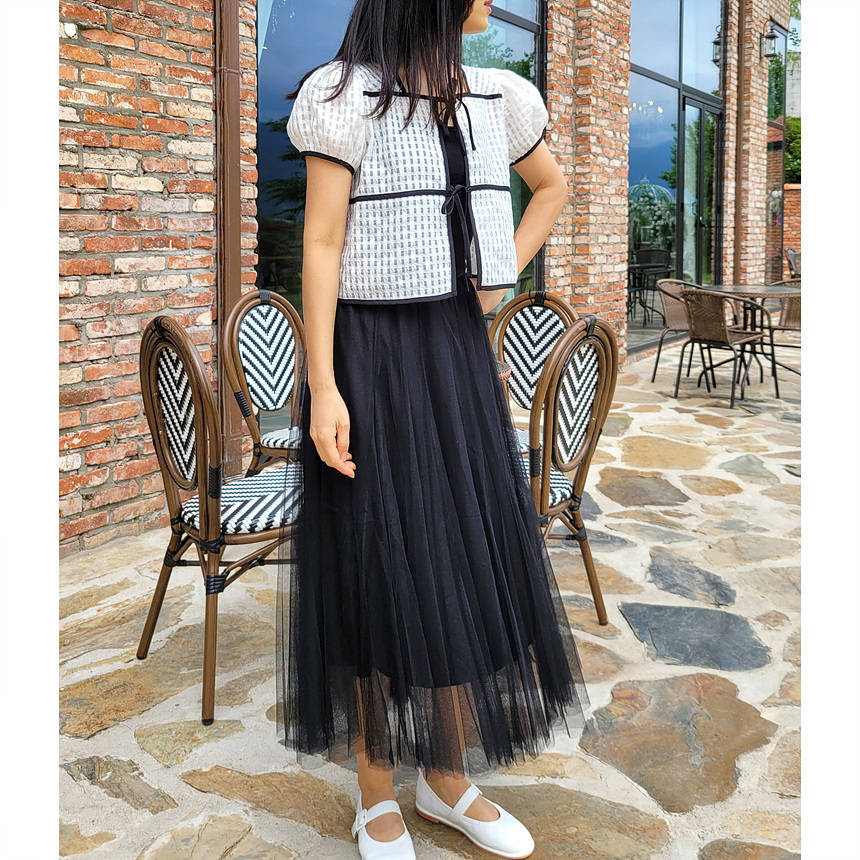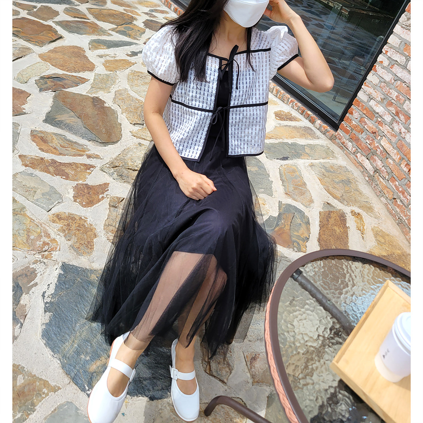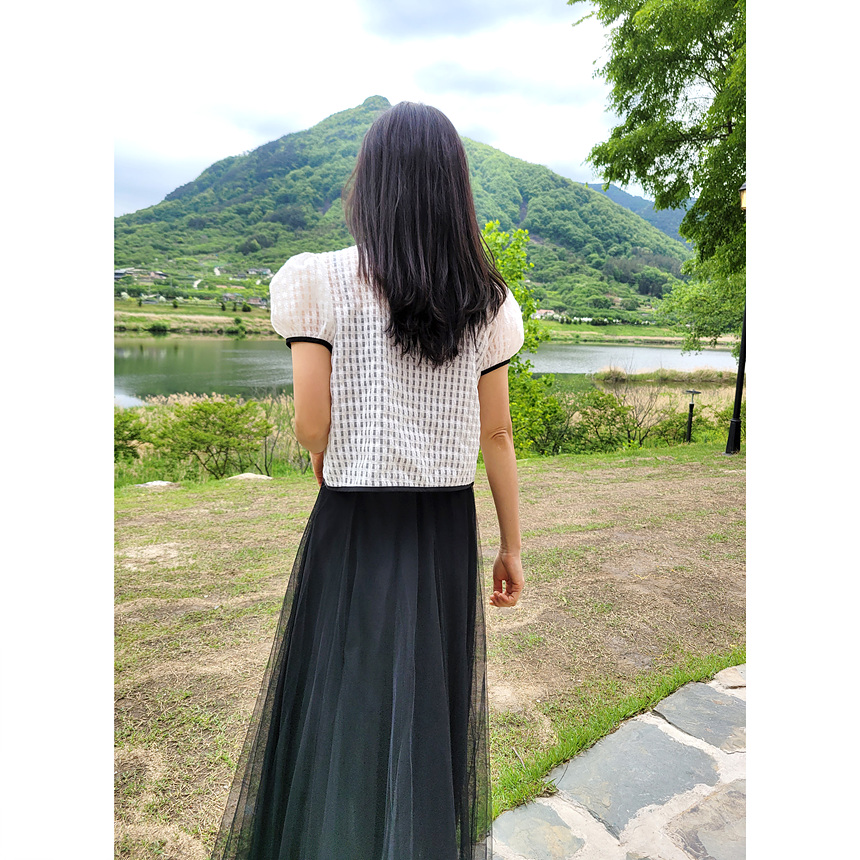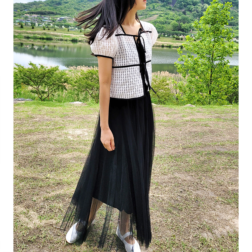 바로발송 체크 시스루 퍼프 가디건 블라우스